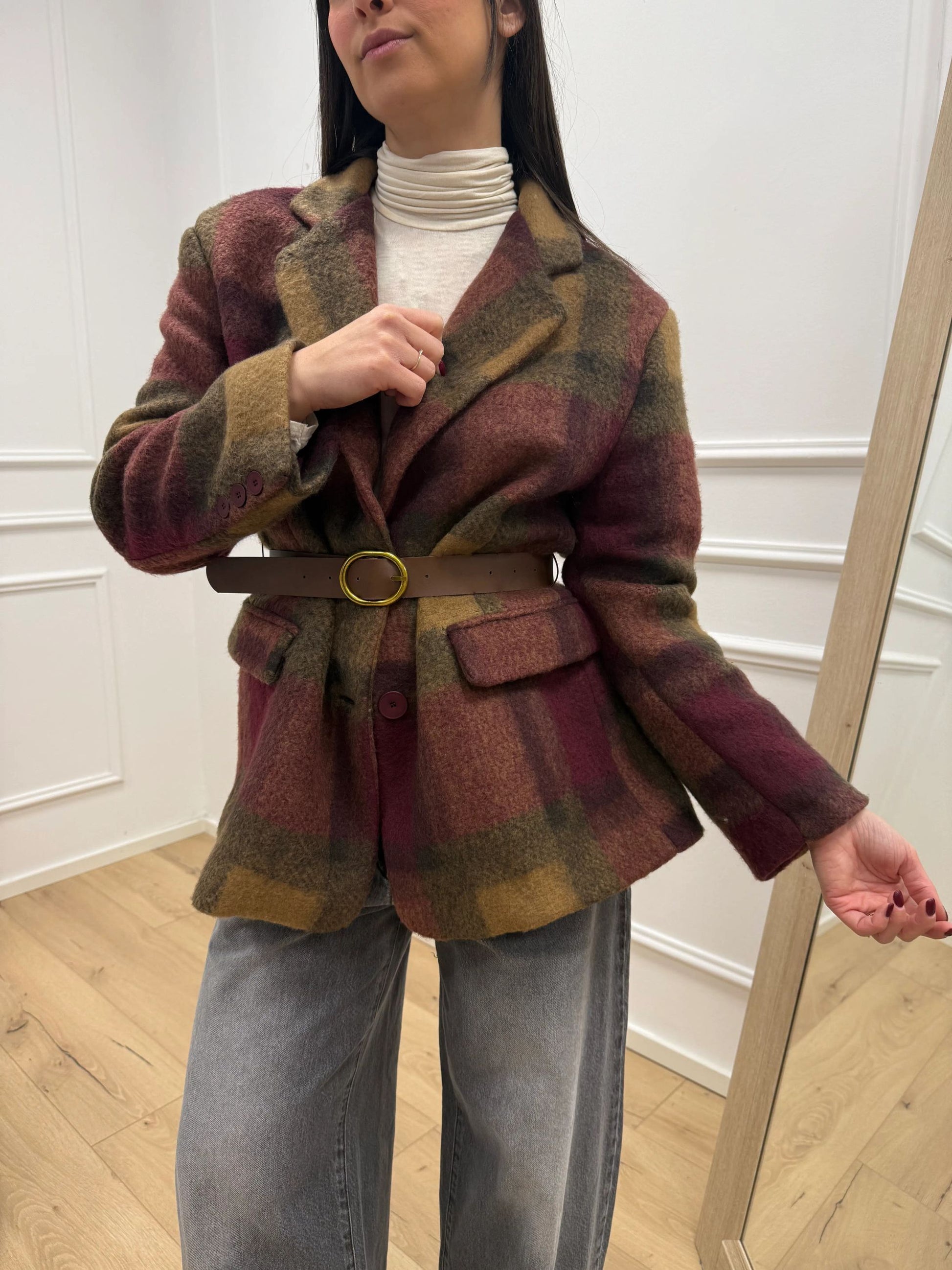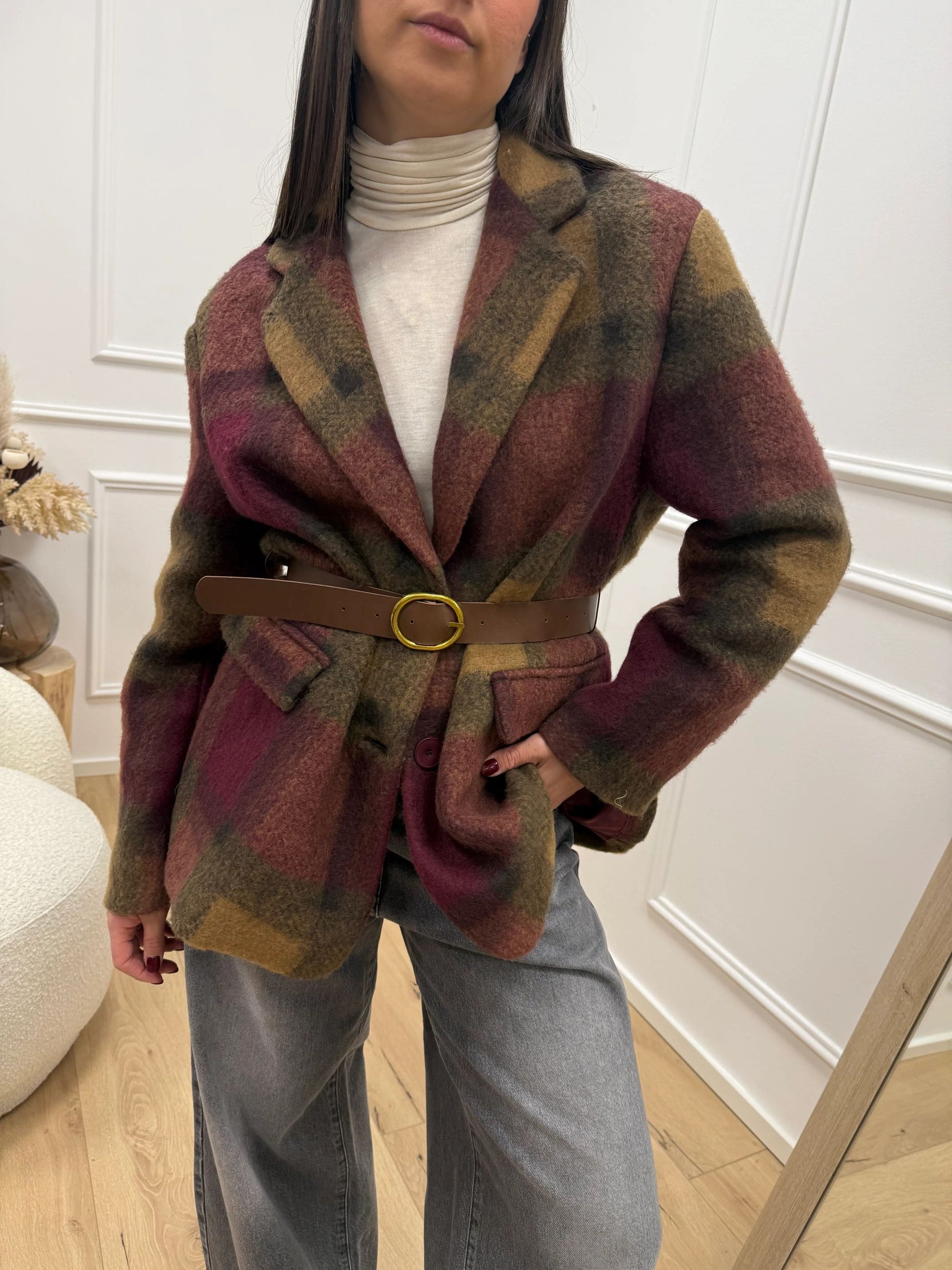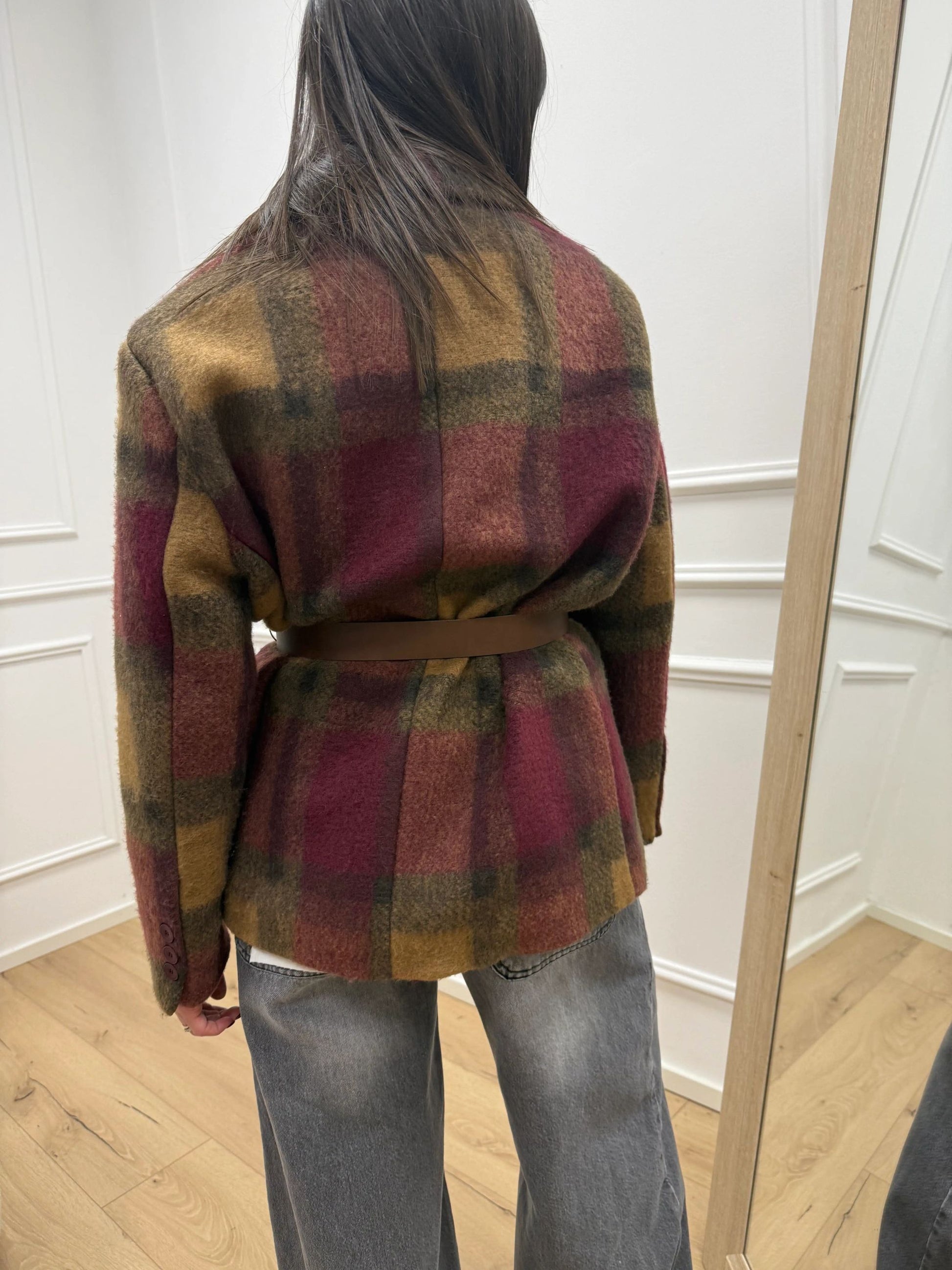 Giacca cappotto fantasia check sui toni del bordeaux e camel Vicolo. Modello collo revers e chiusura frontale monopetto a due bottoni. Tasche con patta e dettaglio di cintura in vita regolabile.