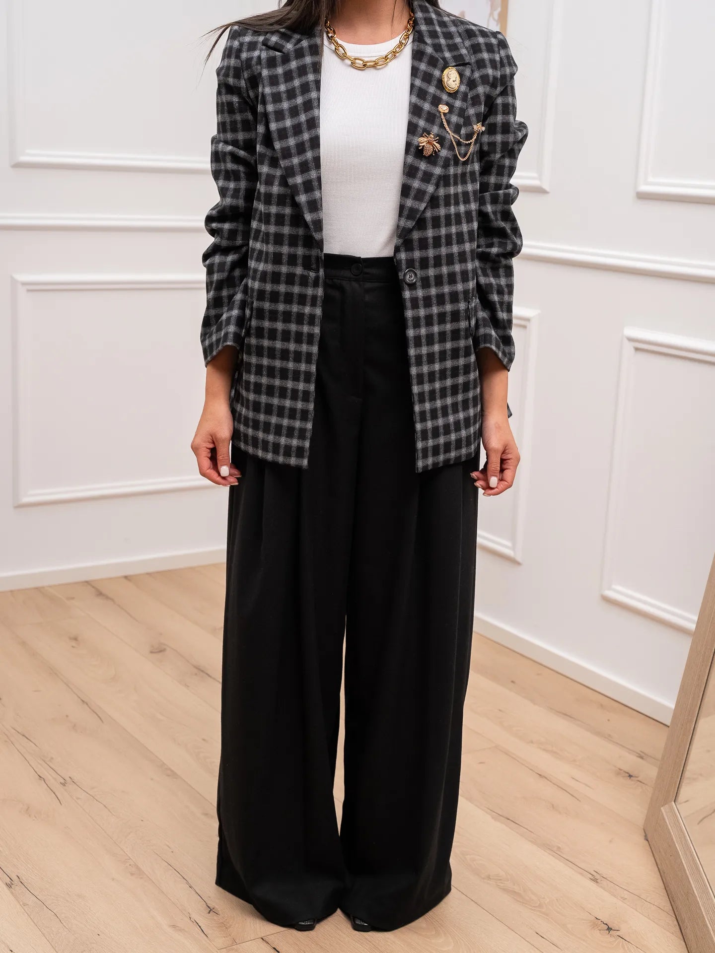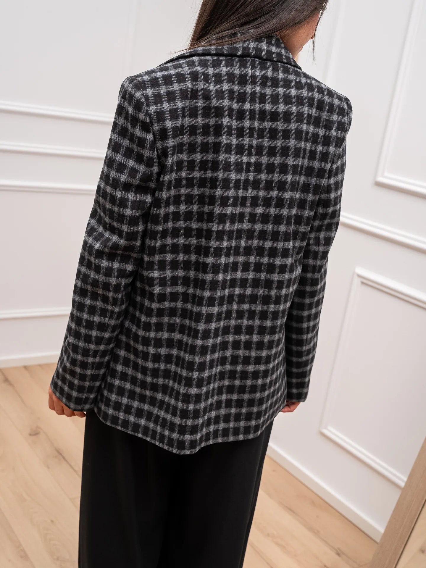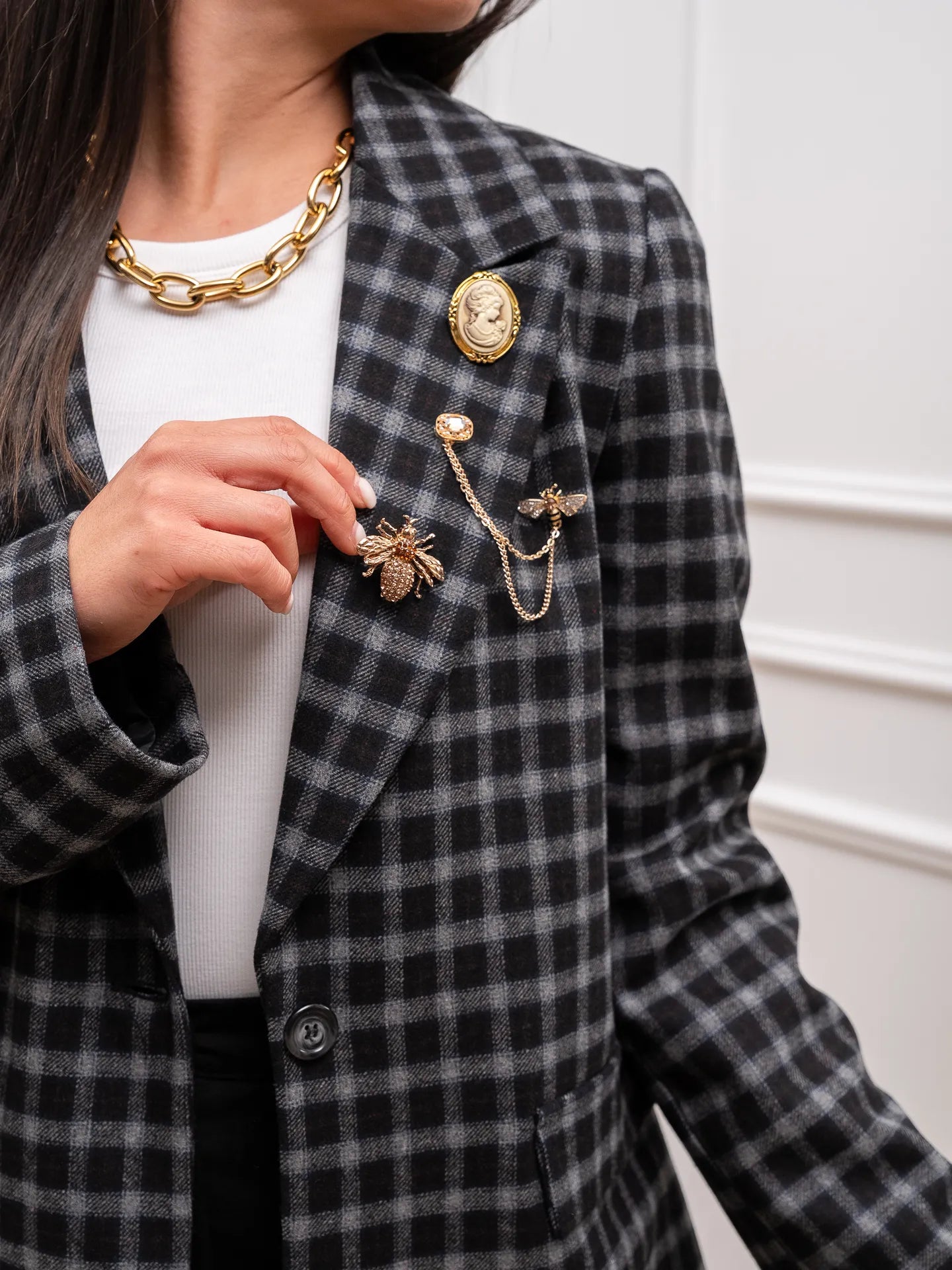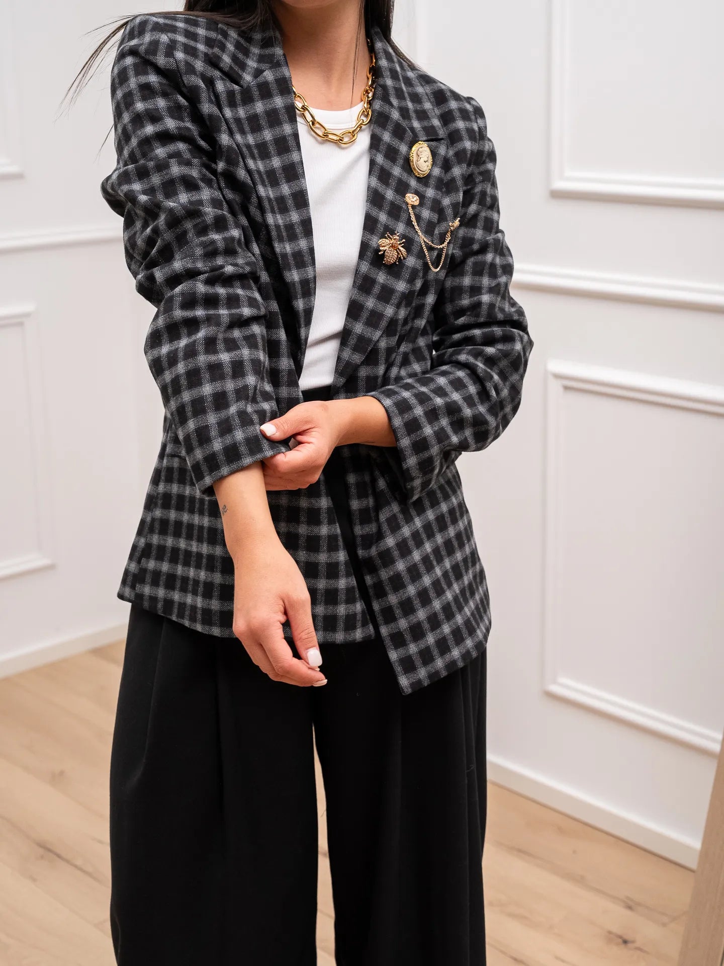 Giacca cappotto check sui toni del grigio e nero Vicolo. Modello collo revers e chiusura doppiopetto. Dettaglio di spilla gioiello rimovibile. Tasche con patta frontali.