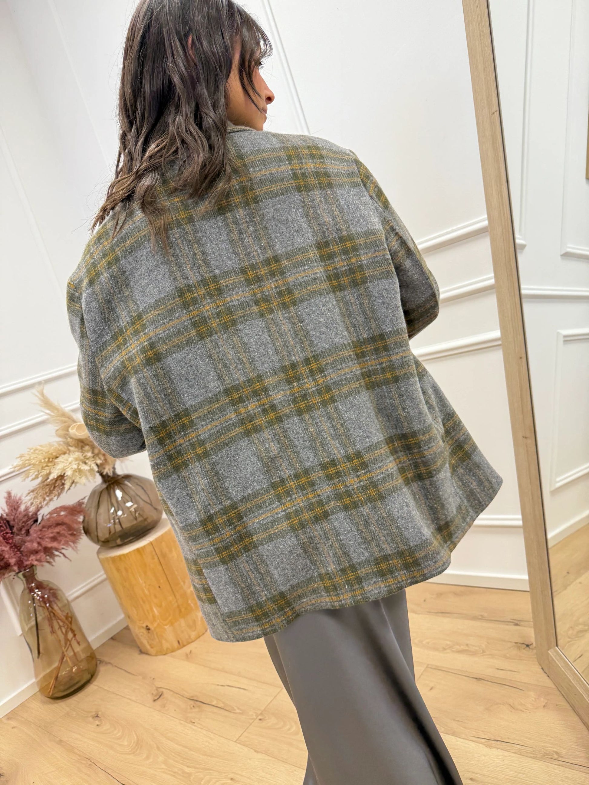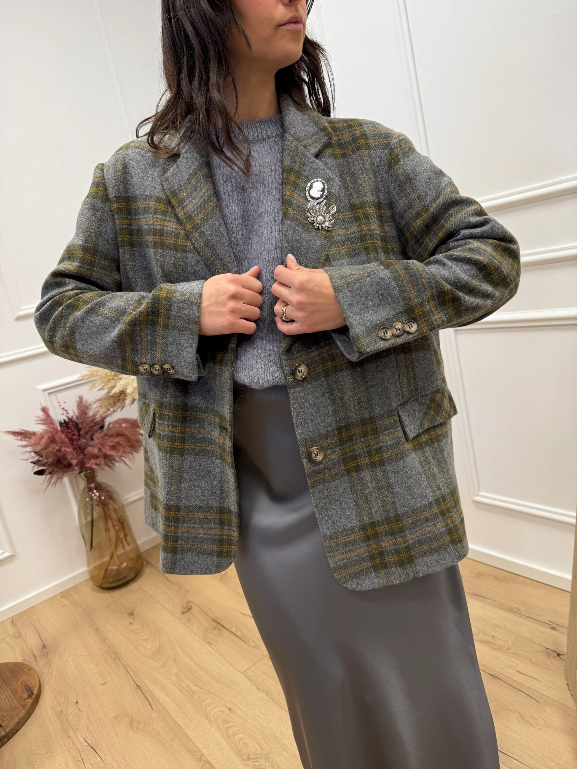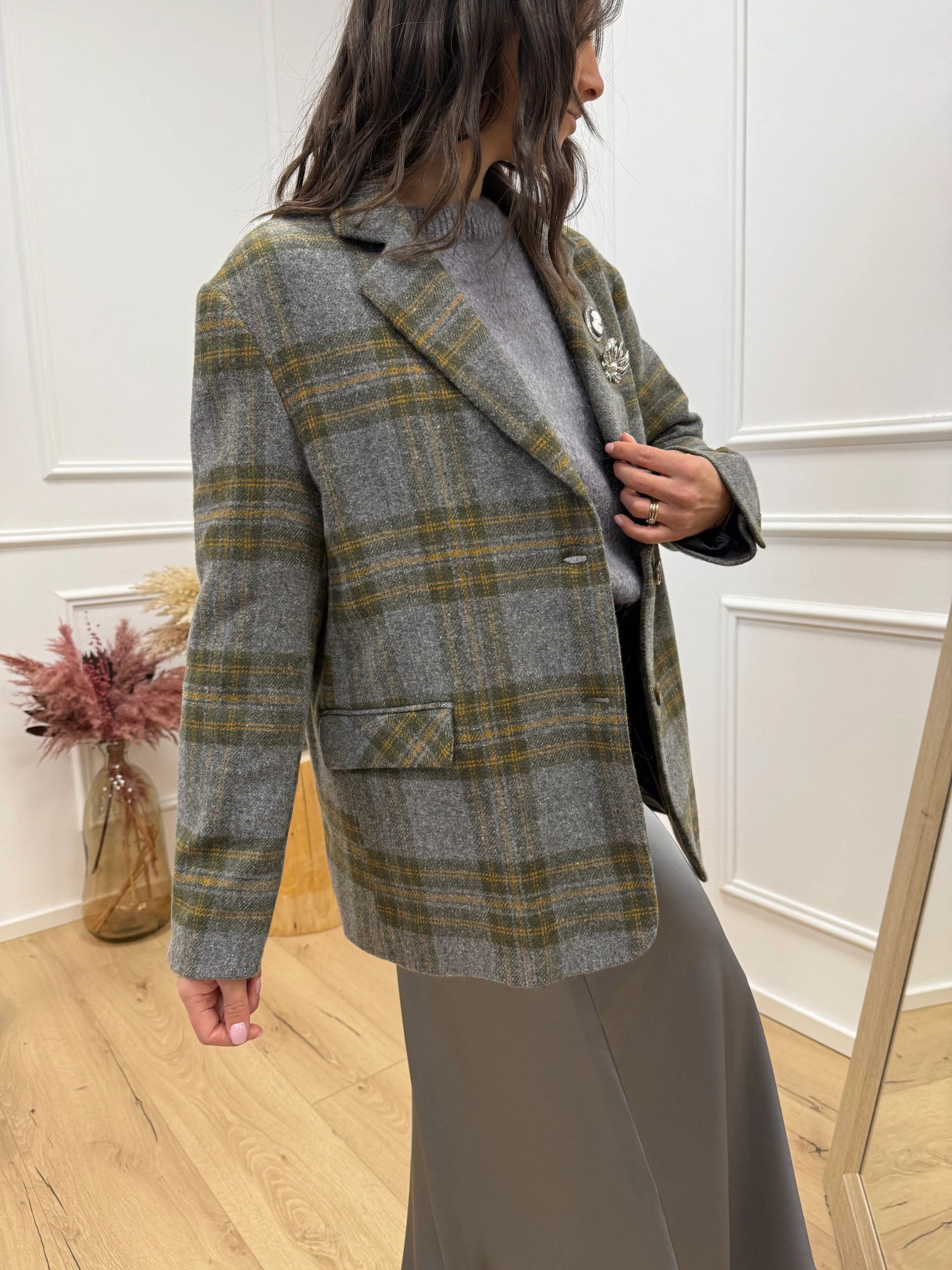 Giacca cappotto check sui toni del grigio in lana Dixie. Modello chiusura frontale a due bottoni. Dettaglio di spille rimovibili su revers e tasche con patta. Maniche lunga con bottoncini sul fondo.
