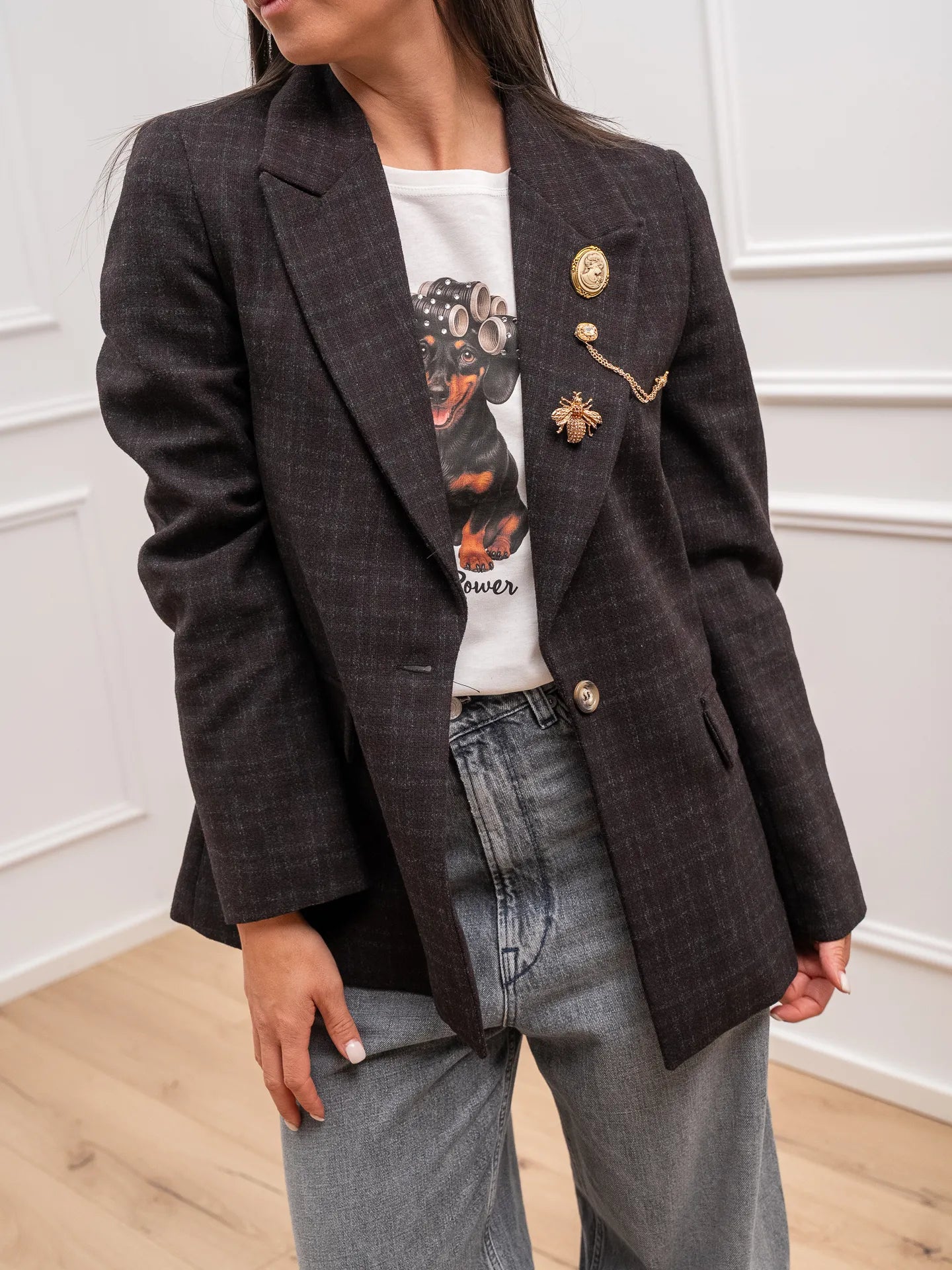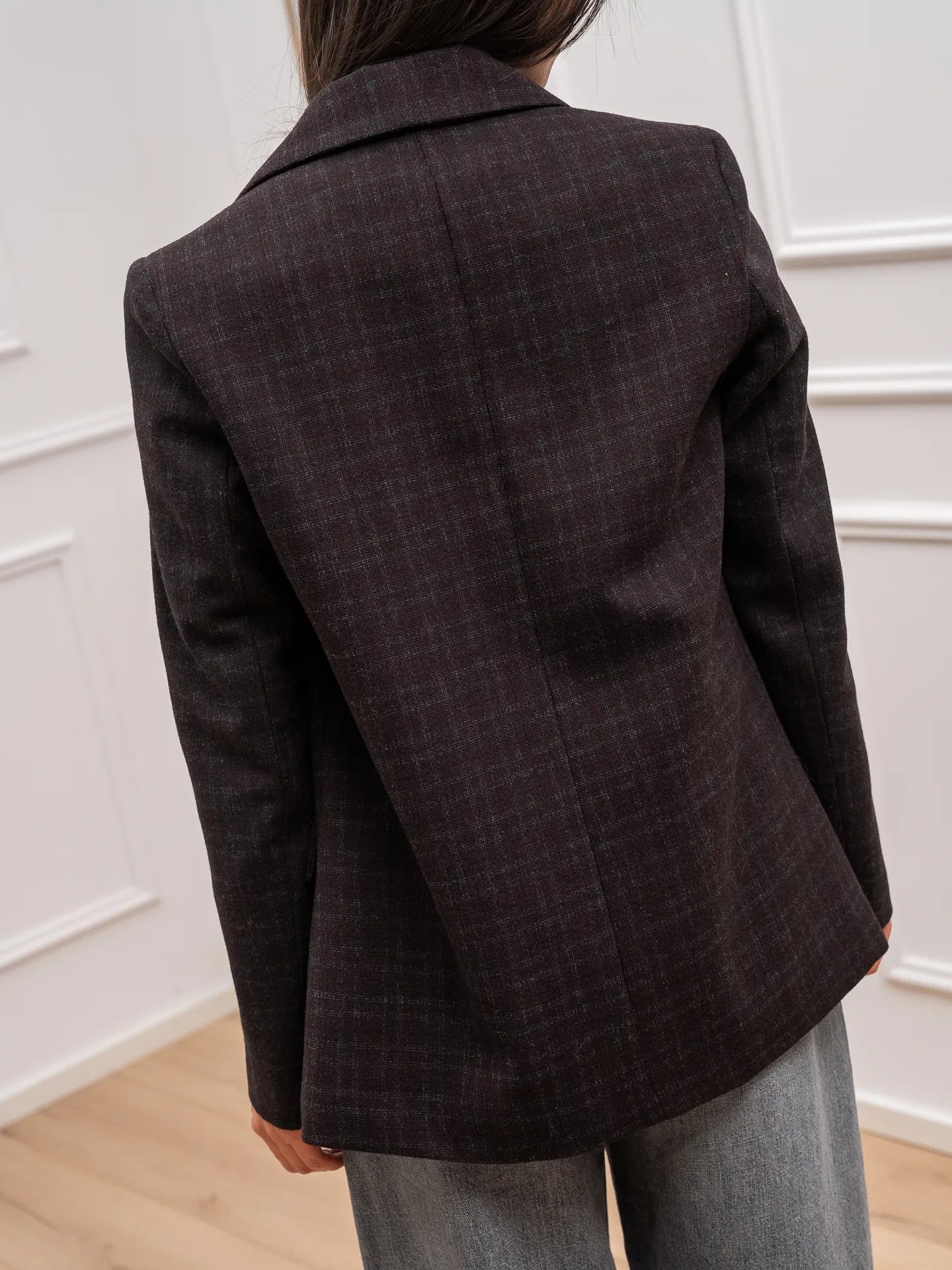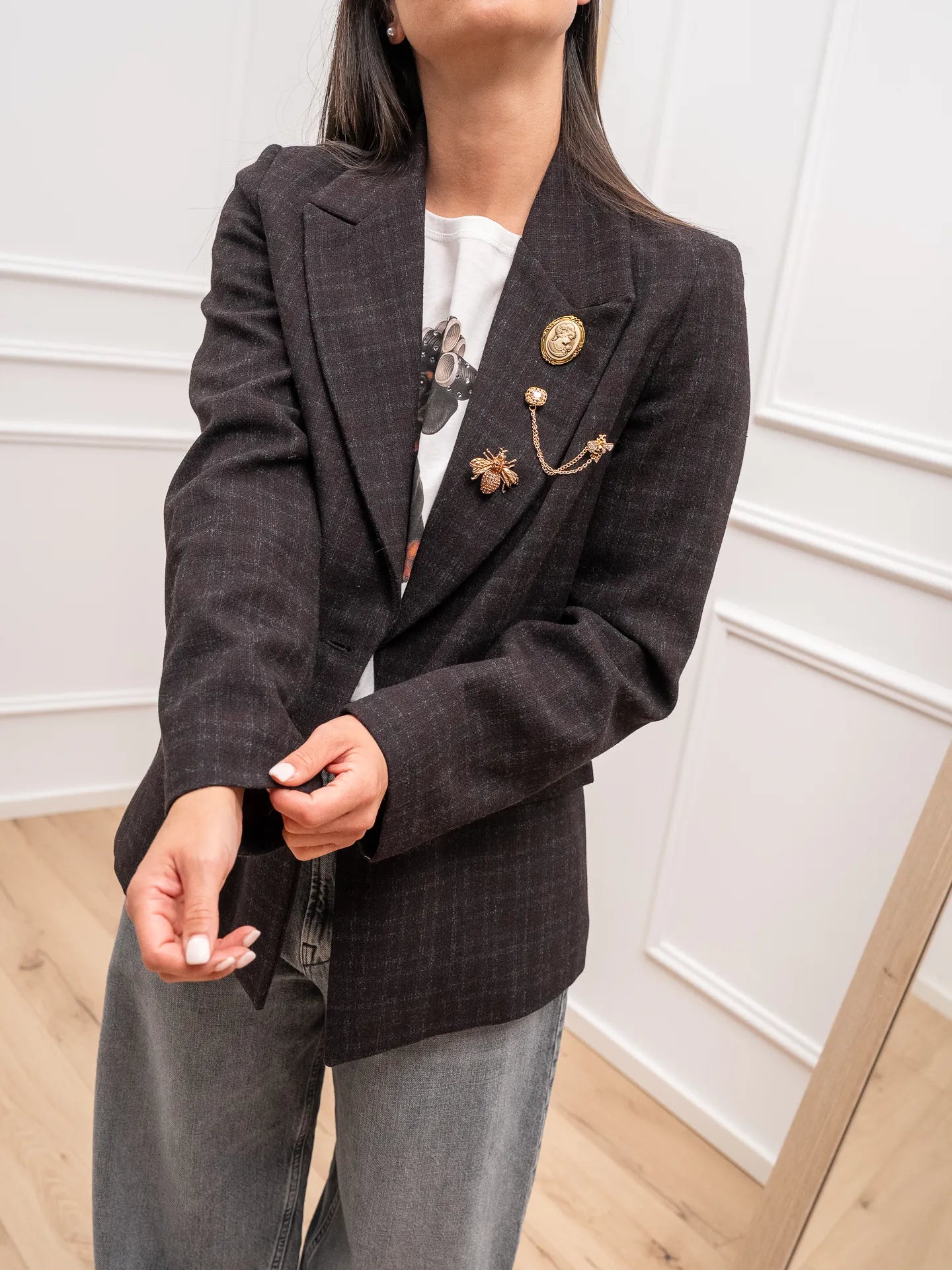 Giacca cappotto check sui toni del vino e nero Vicolo. Modello collo revers e chiusura doppiopetto. Dettaglio di spilla gioiello rimovibile. Tasche con patta frontali.