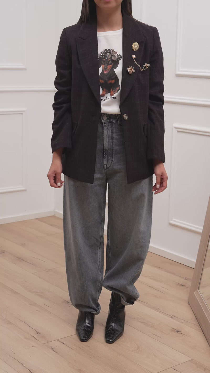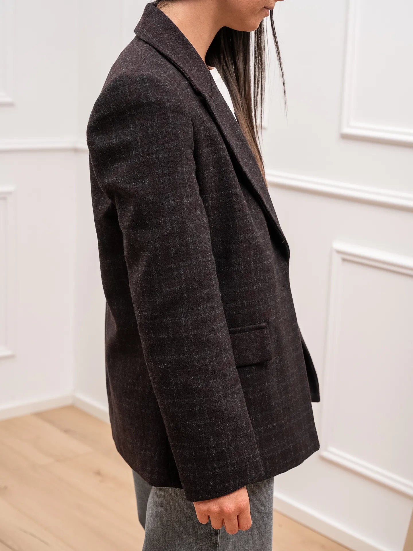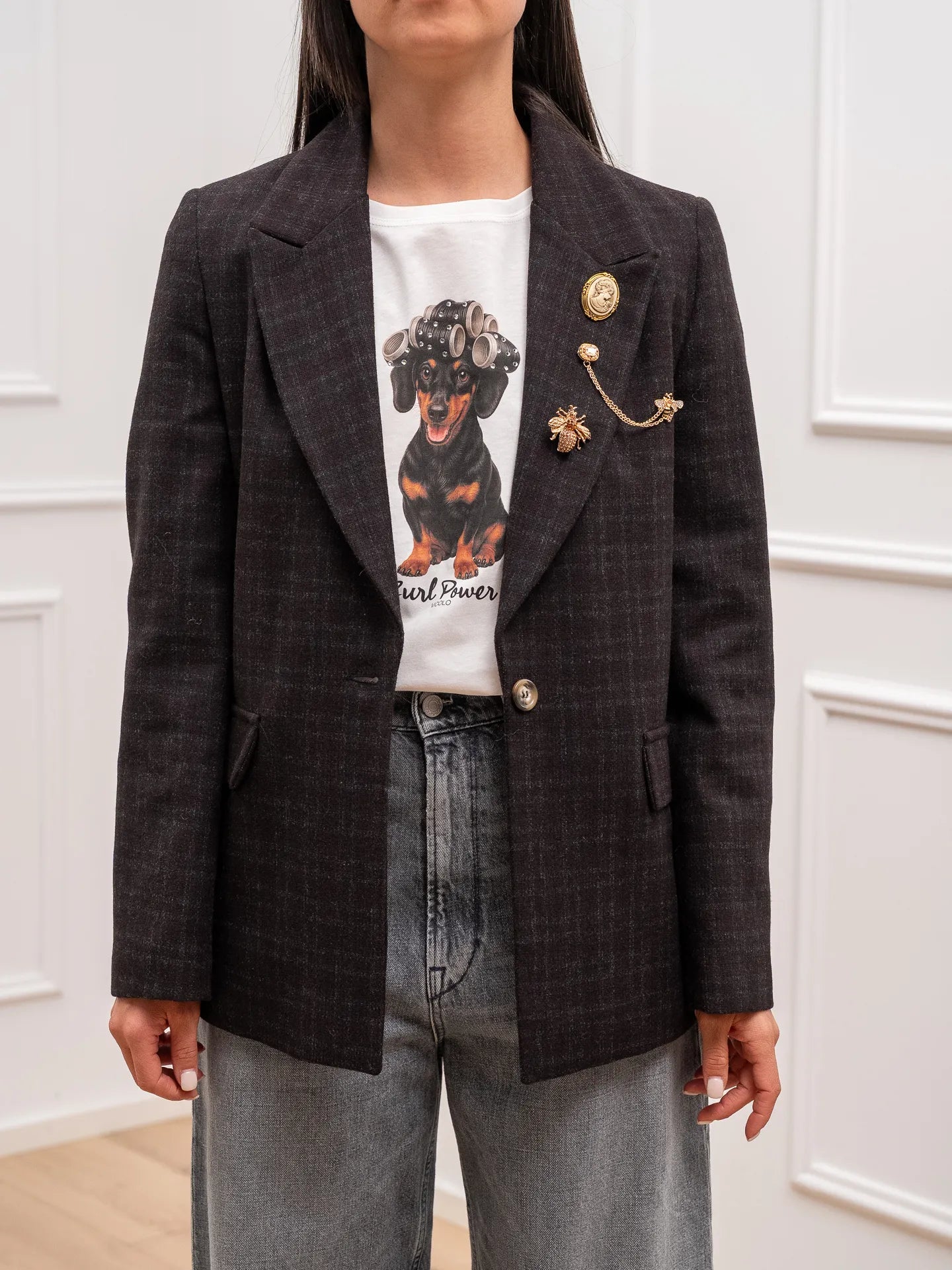 Giacca cappotto check sui toni del vino e nero Vicolo. Modello collo revers e chiusura doppiopetto. Dettaglio di spilla gioiello rimovibile. Tasche con patta frontali.