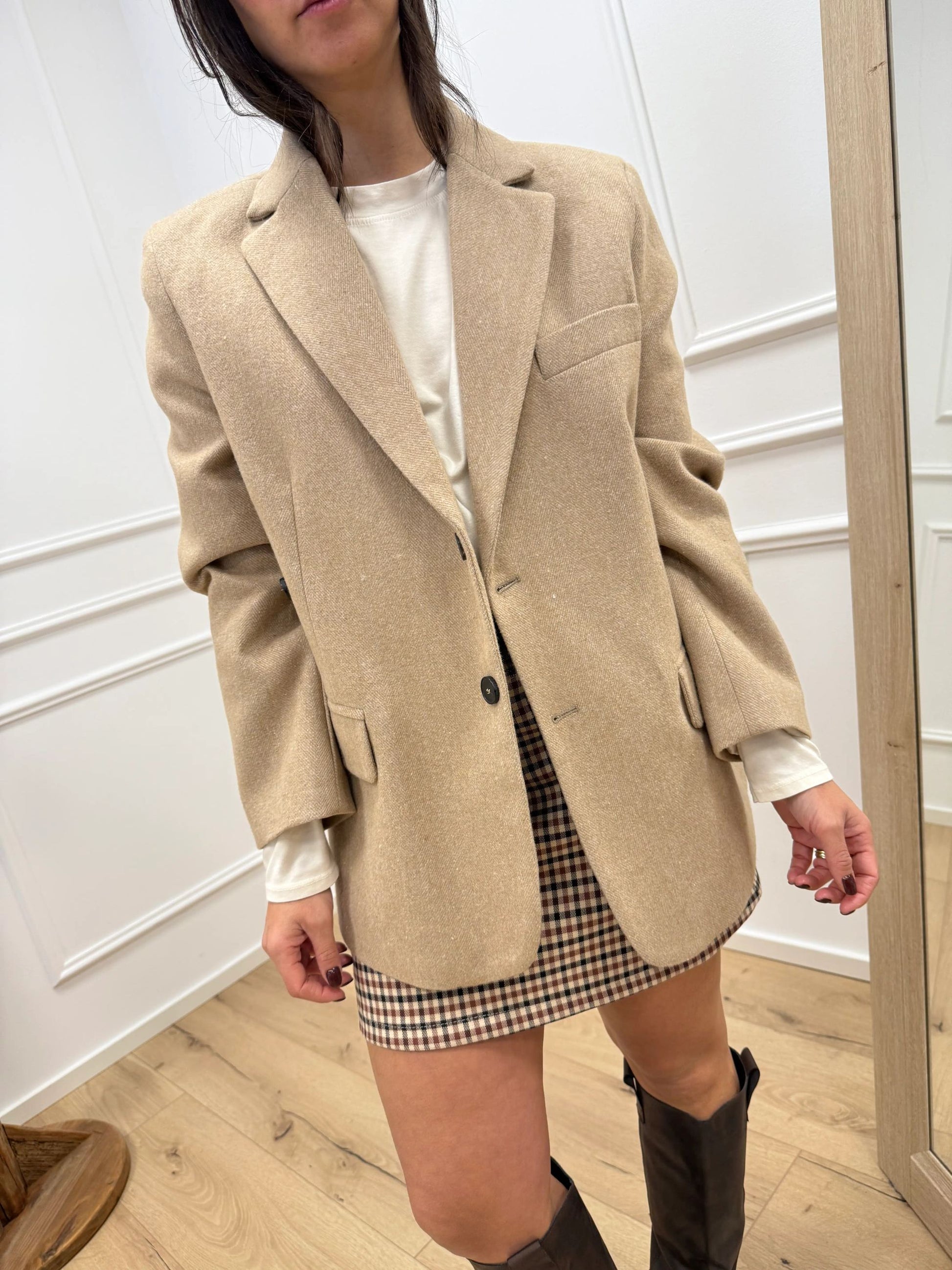 Giacca cappotto Ludo color sabbia Vicolo. Modello fit morbido con doppia abbottonatura a due bottoni frontali e laterale per portarla più aderente. Spacchetti laterali e tasche con patta. Spalle imbottite.