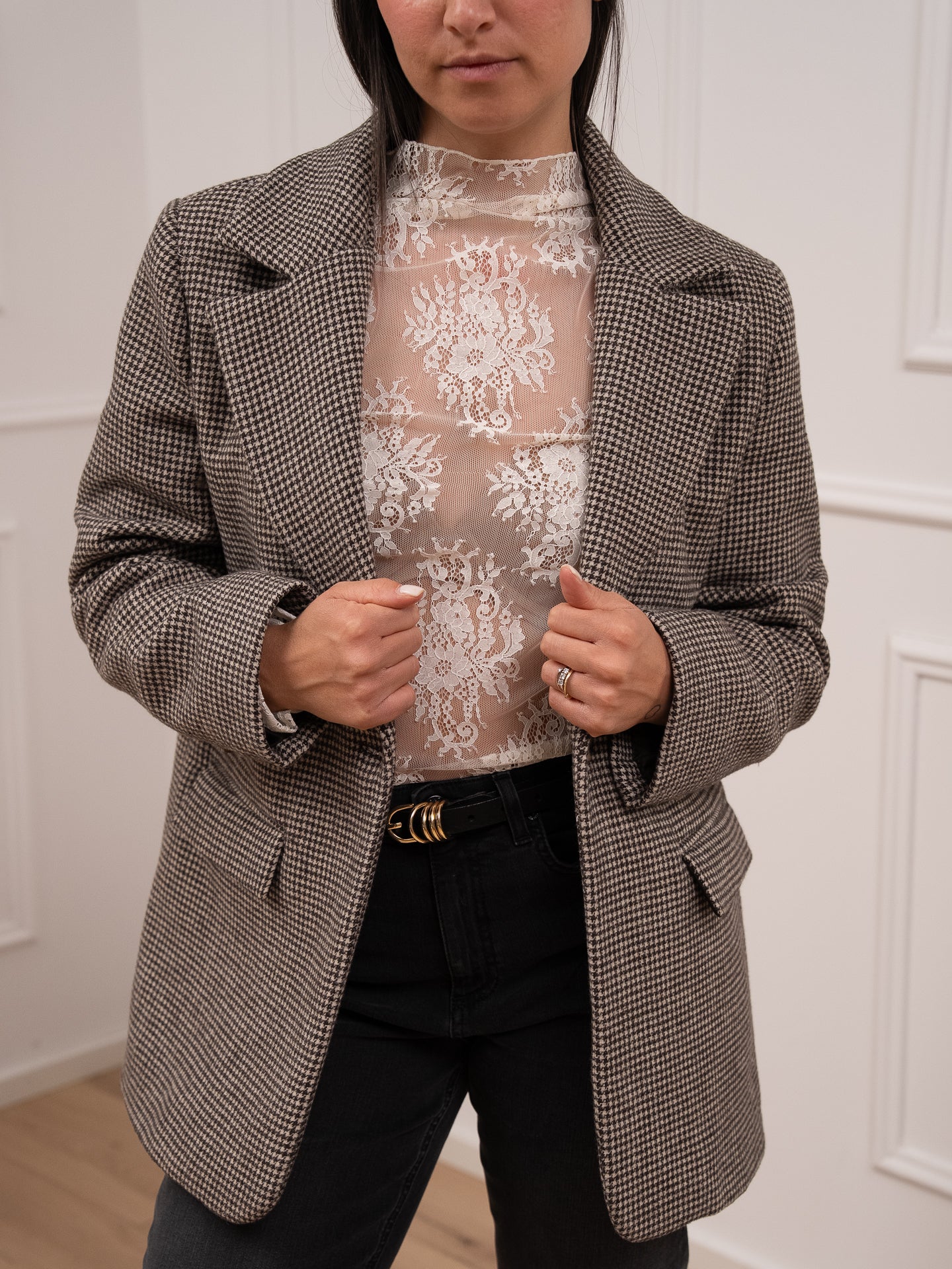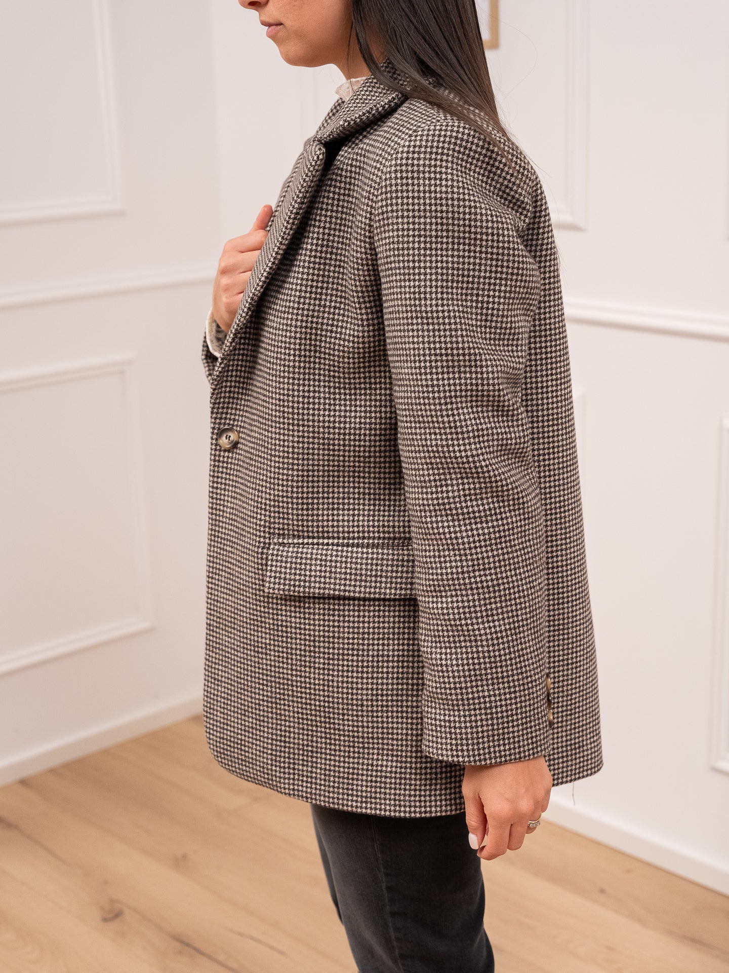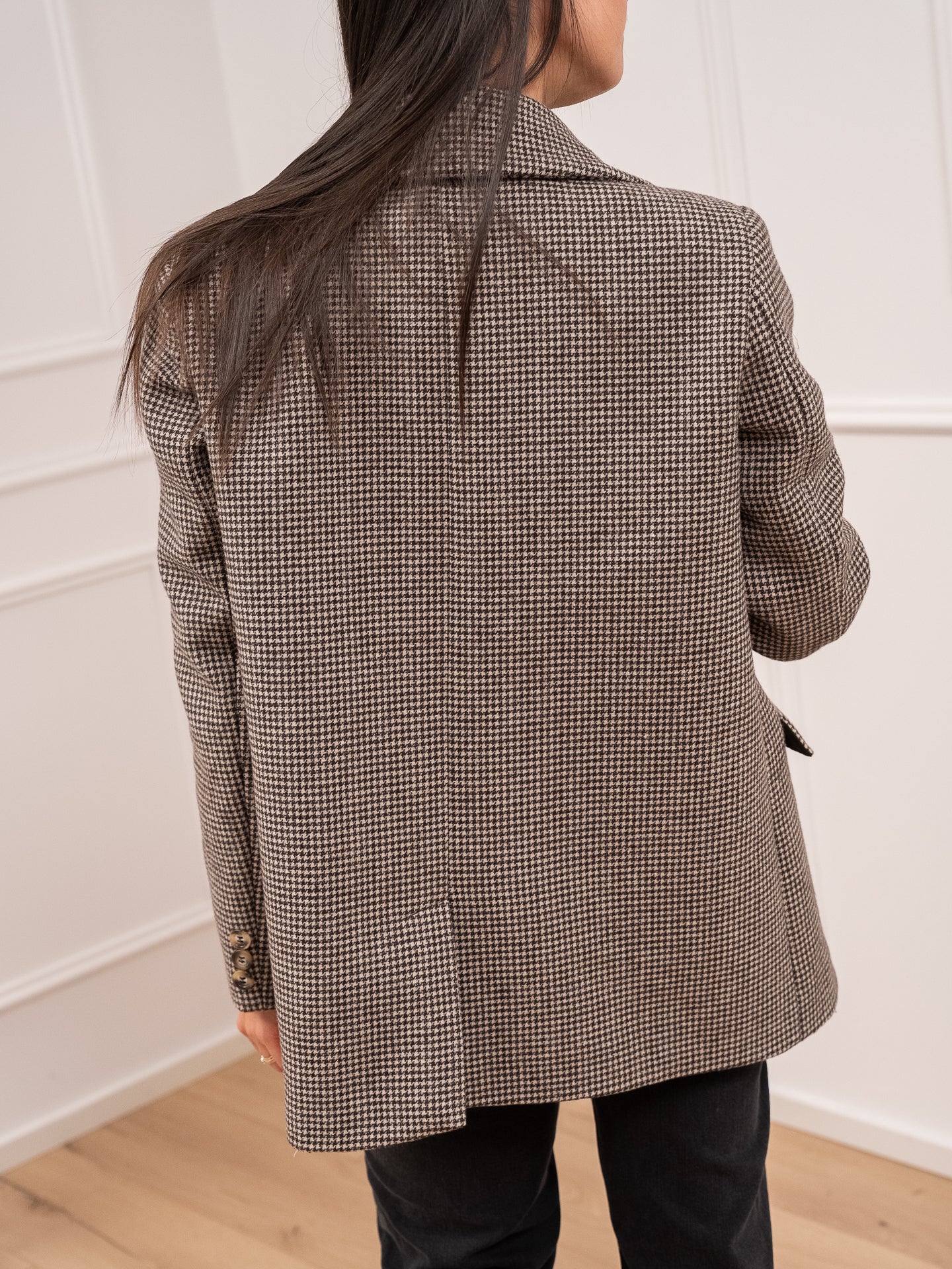 Giacca cappotto pied de poule moro Vicolo. Modello chiusura frontale monopetto, collo revers e tasche con patta. Spacco sul retro e maniche lunghe con bottoncini sul fondo.