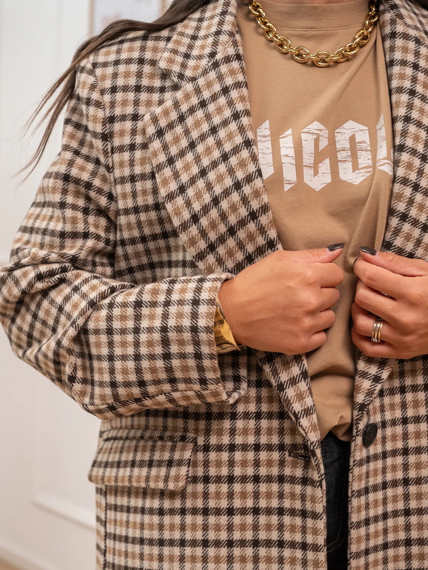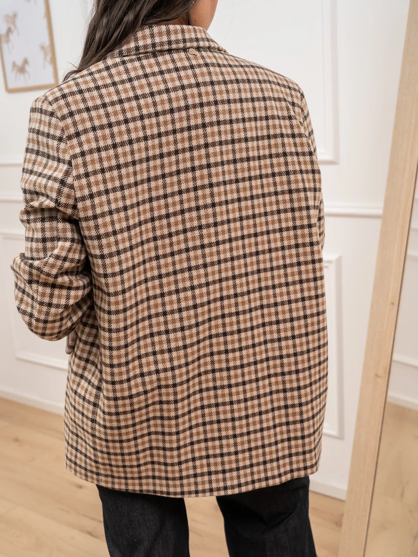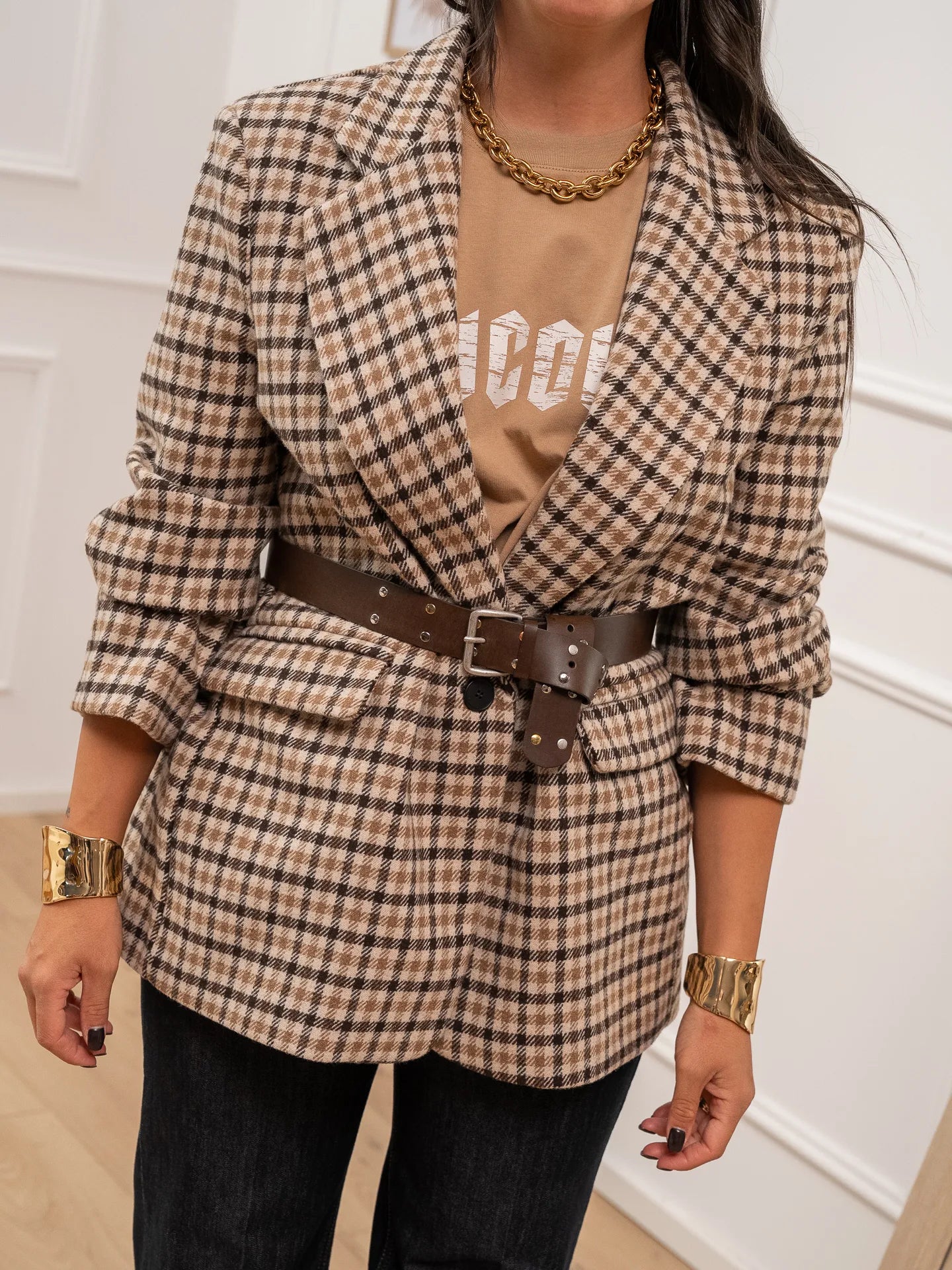 Giacca cappotto fantasia quadri sui toni del camel, burro e moro Philia Loft. Modello corto con chiusura monopetto frontale, dettaglio di cintura moro con borchie multicolore. Collo revers e maniche lunghe. Tasche con patta laterali.