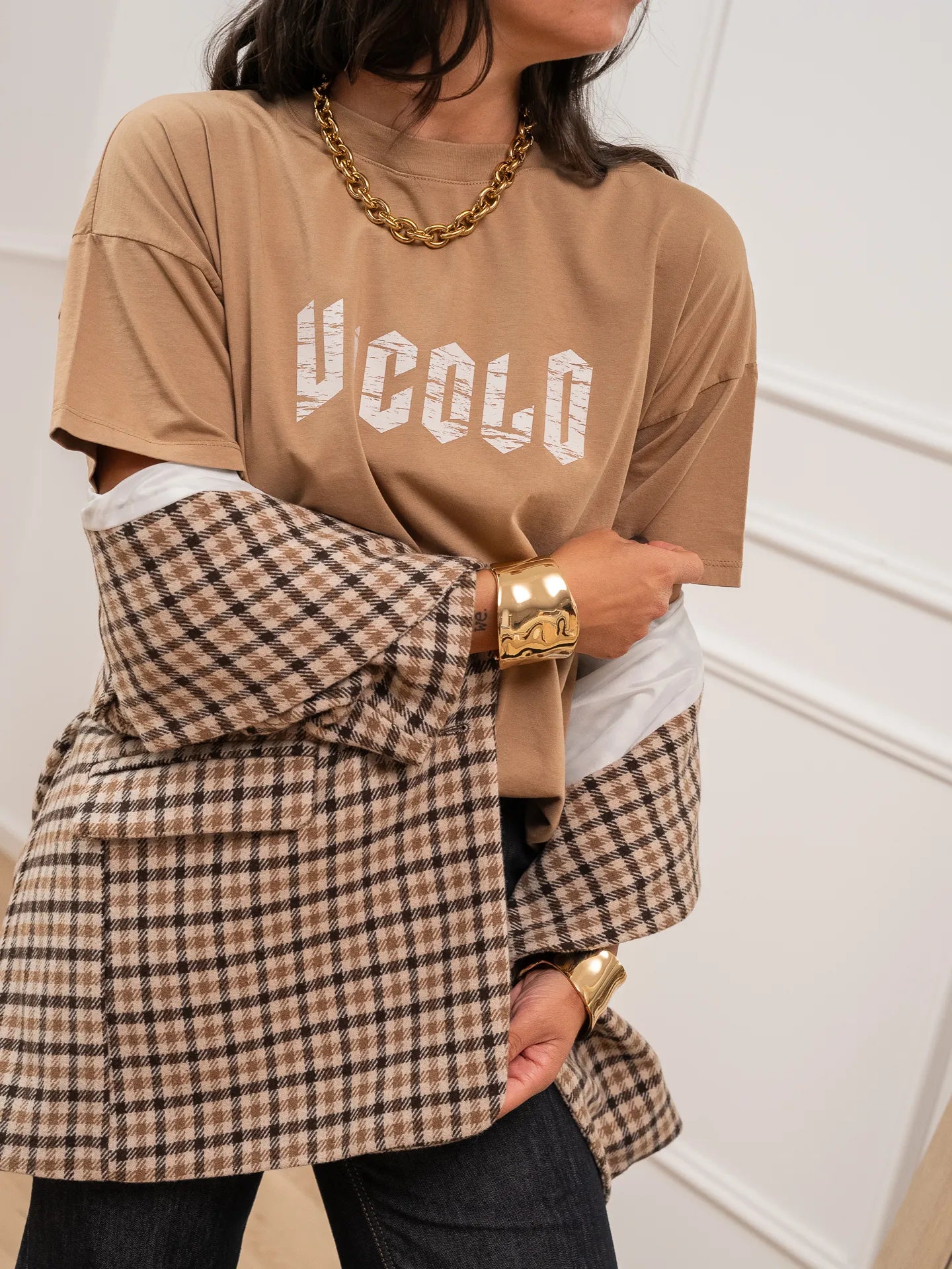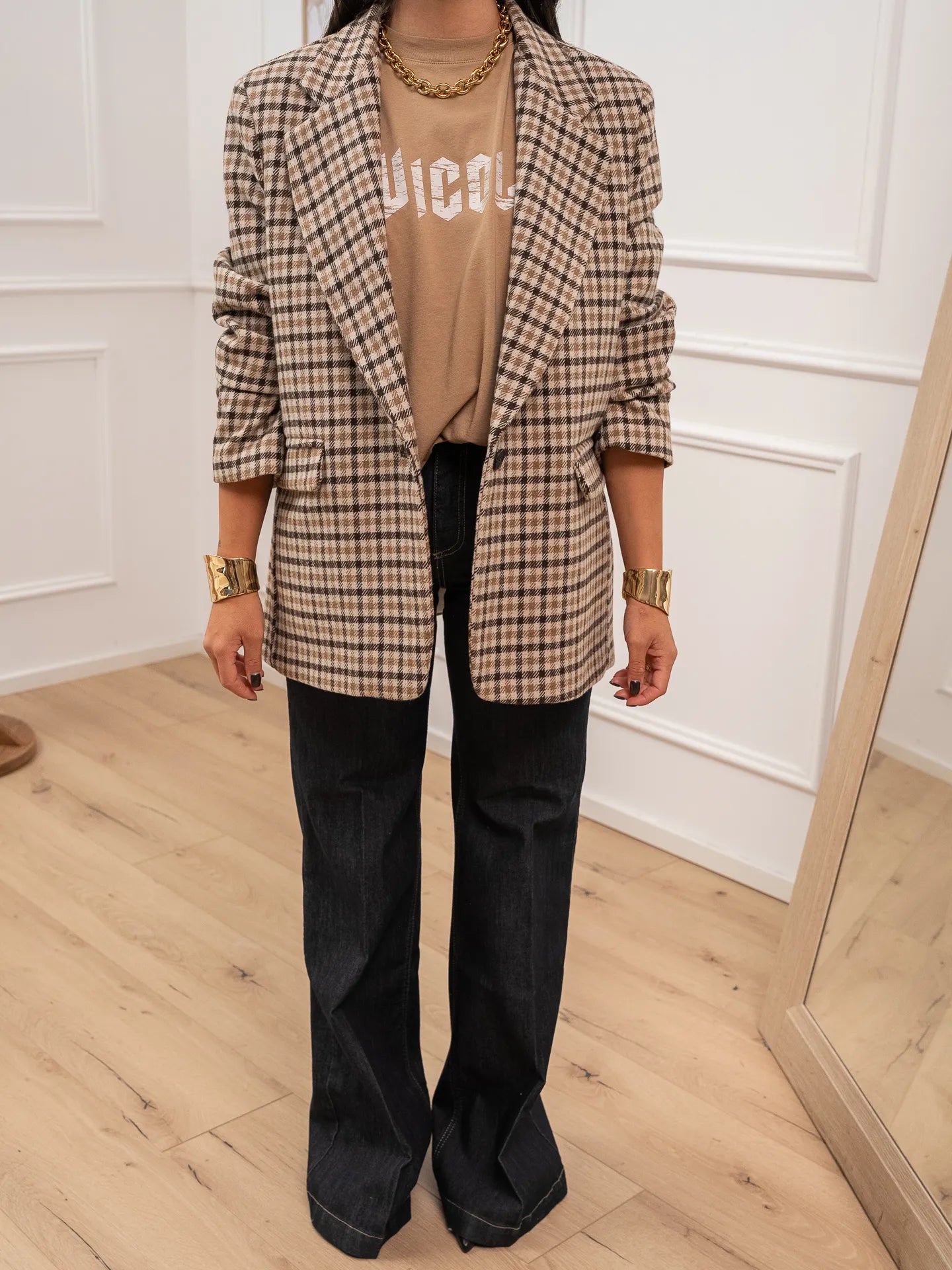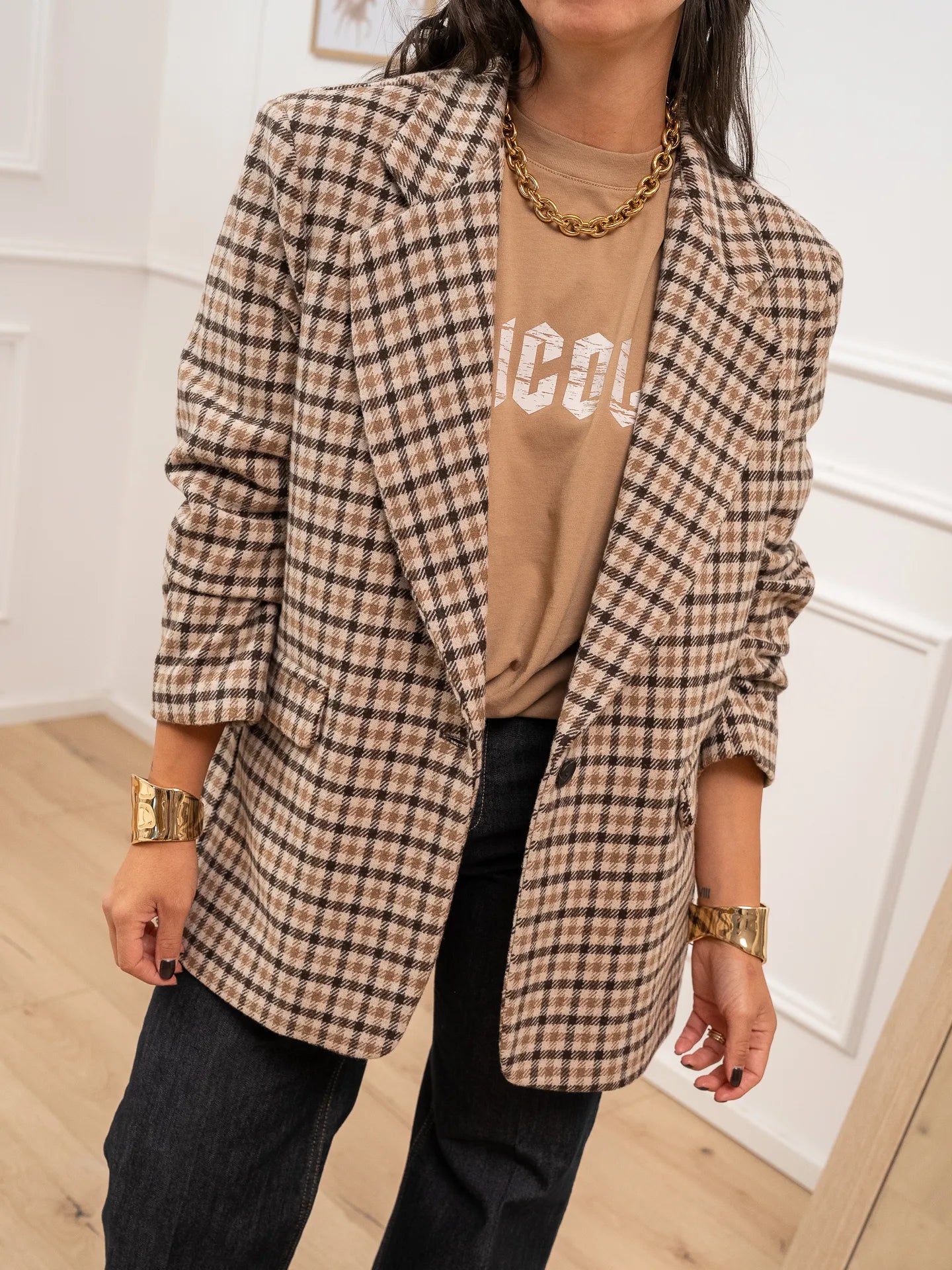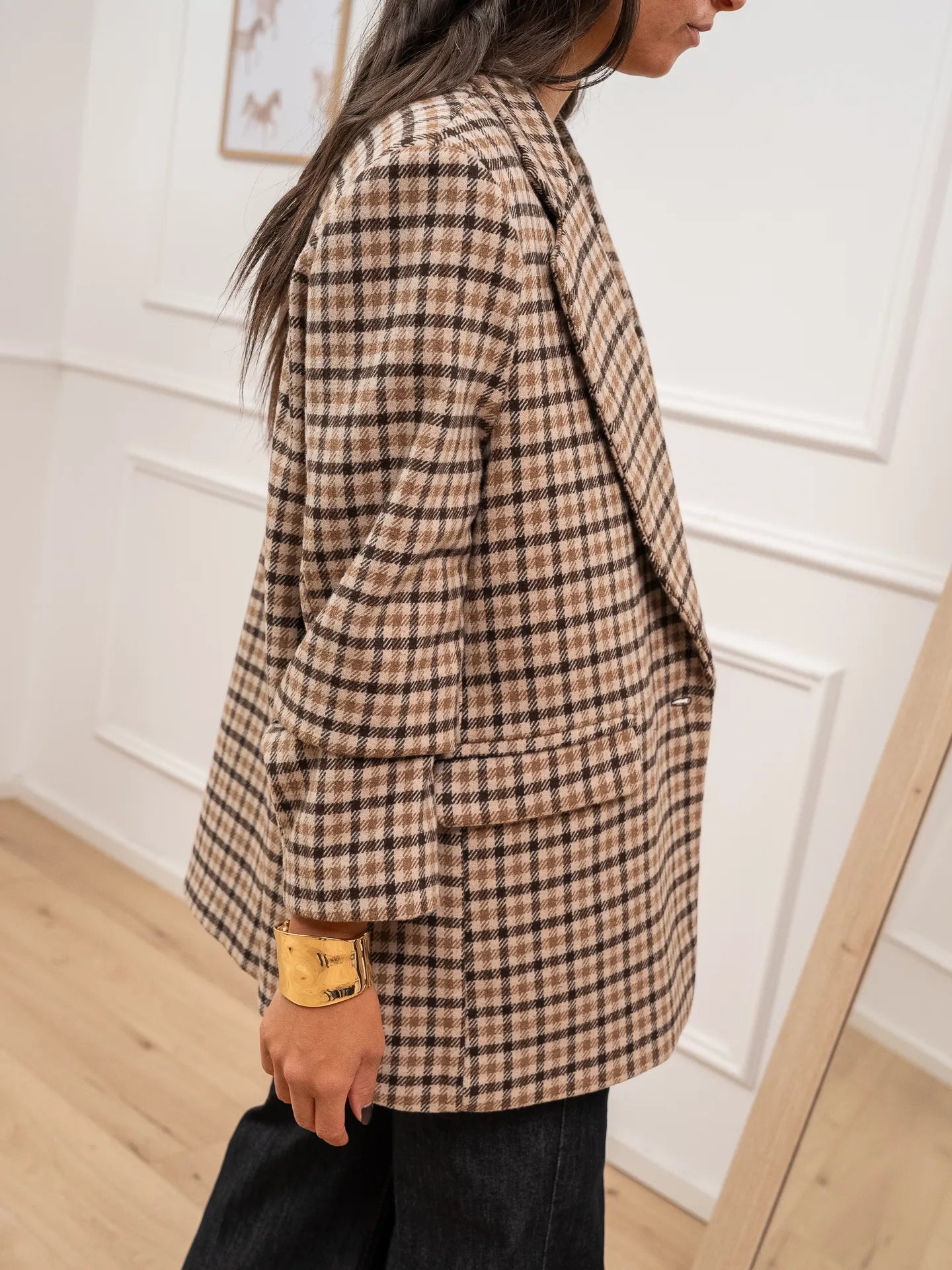 Giacca cappotto fantasia quadri sui toni del camel, burro e moro Philia Loft. Modello corto con chiusura monopetto frontale, dettaglio di cintura moro con borchie multicolore. Collo revers e maniche lunghe. Tasche con patta laterali.