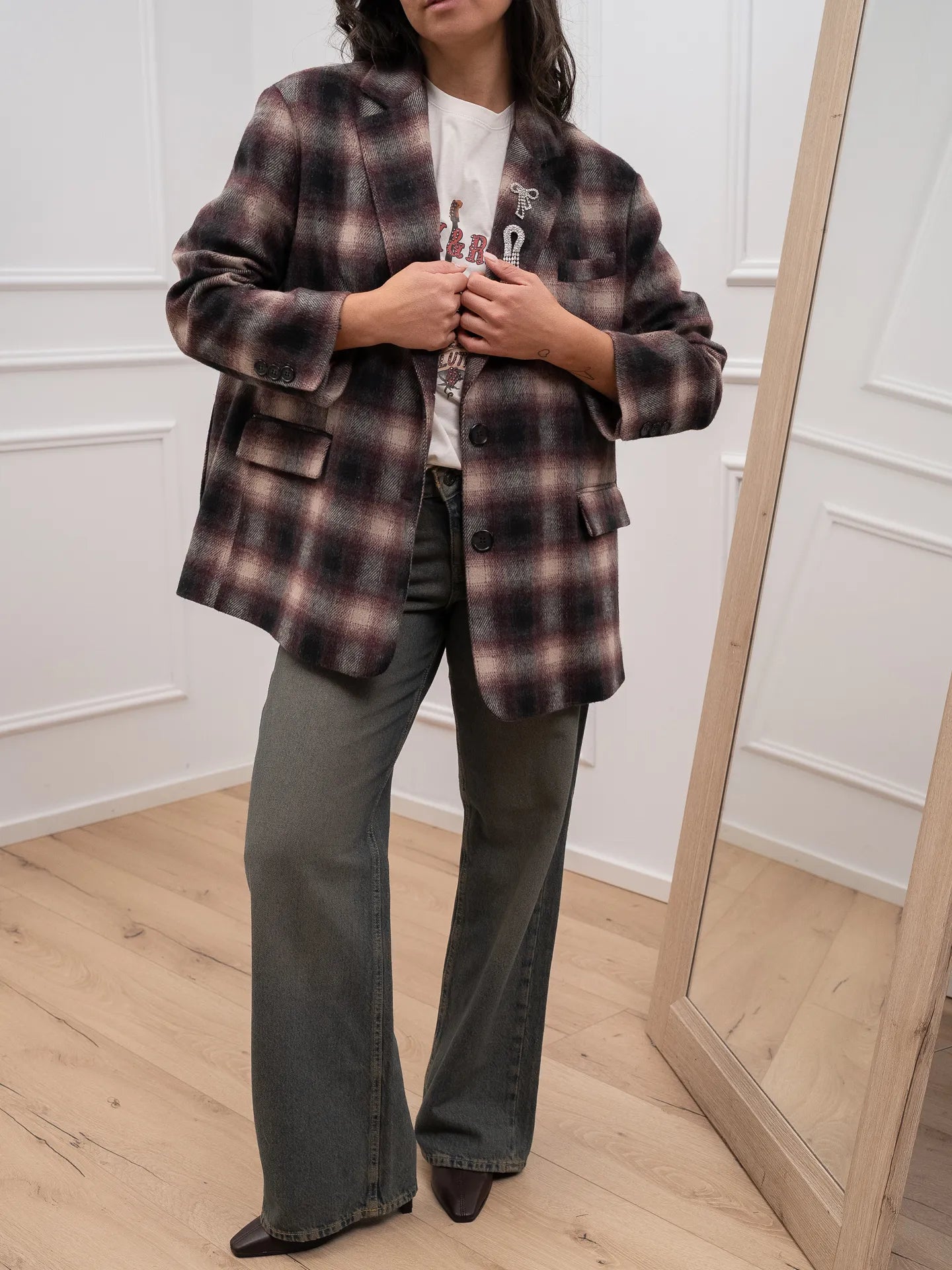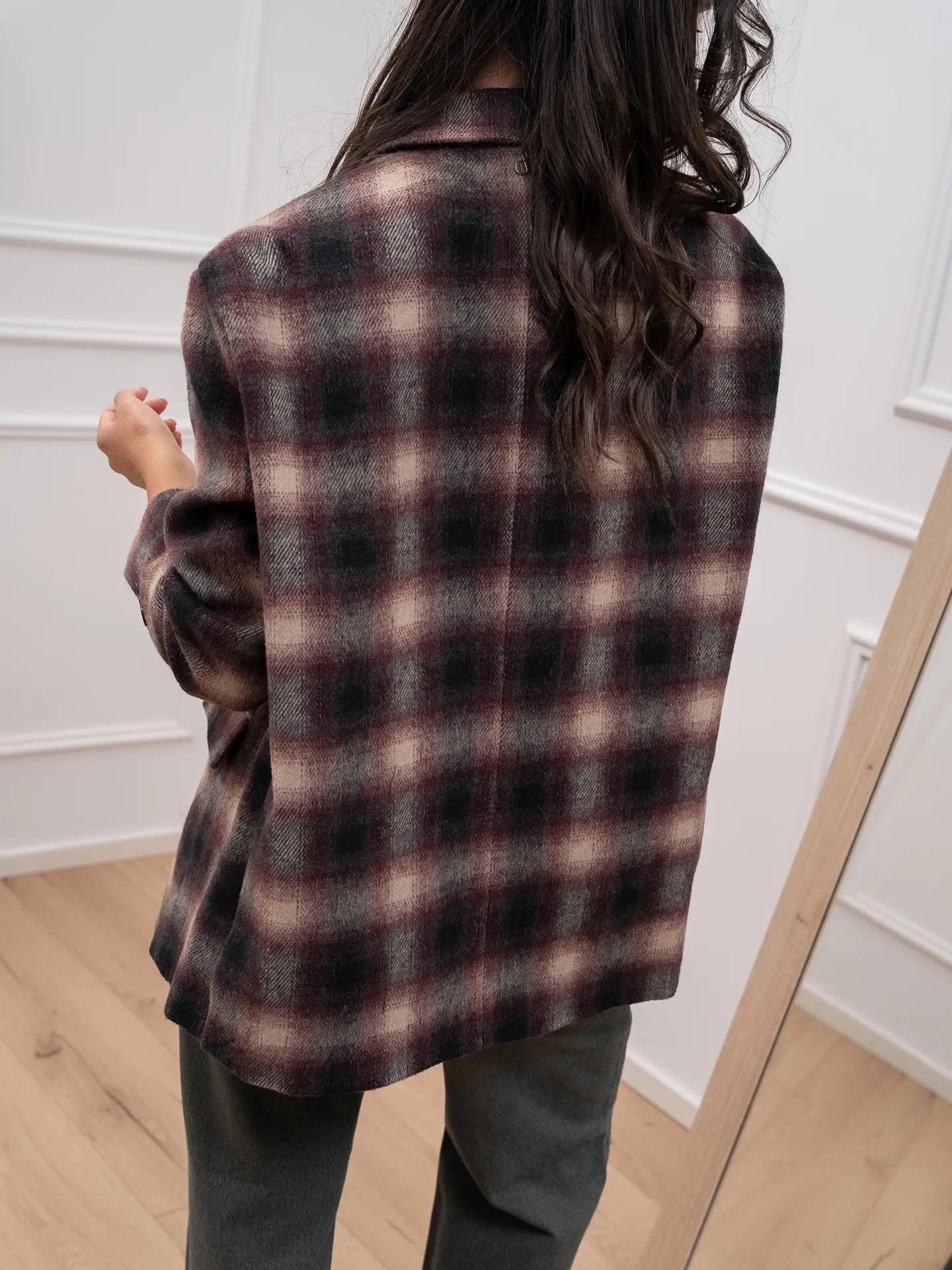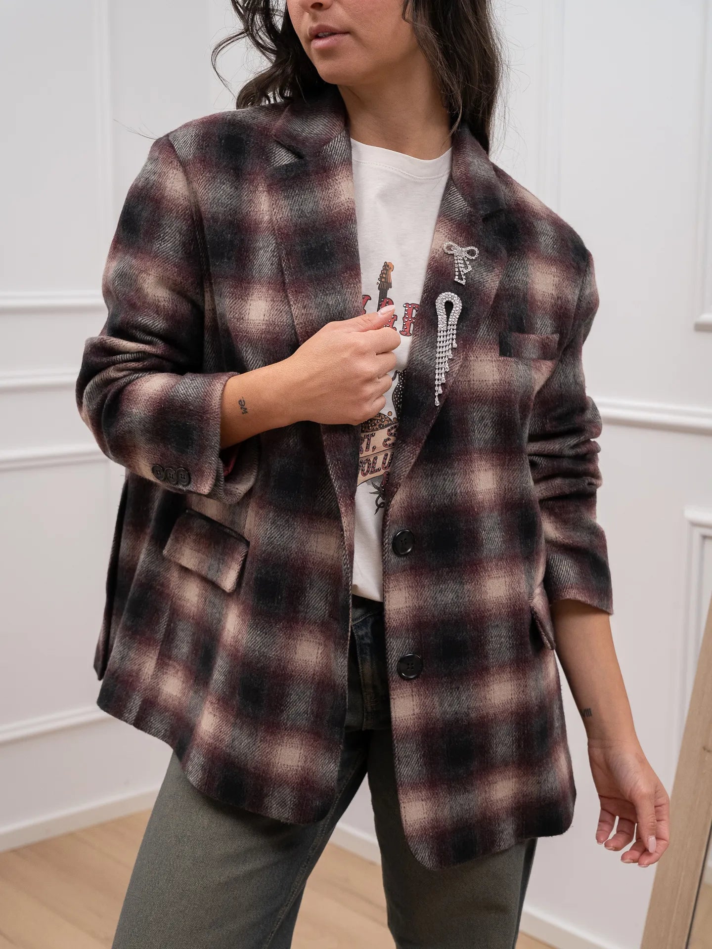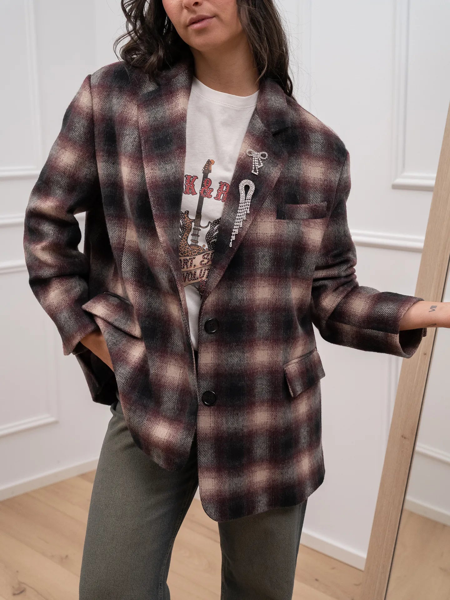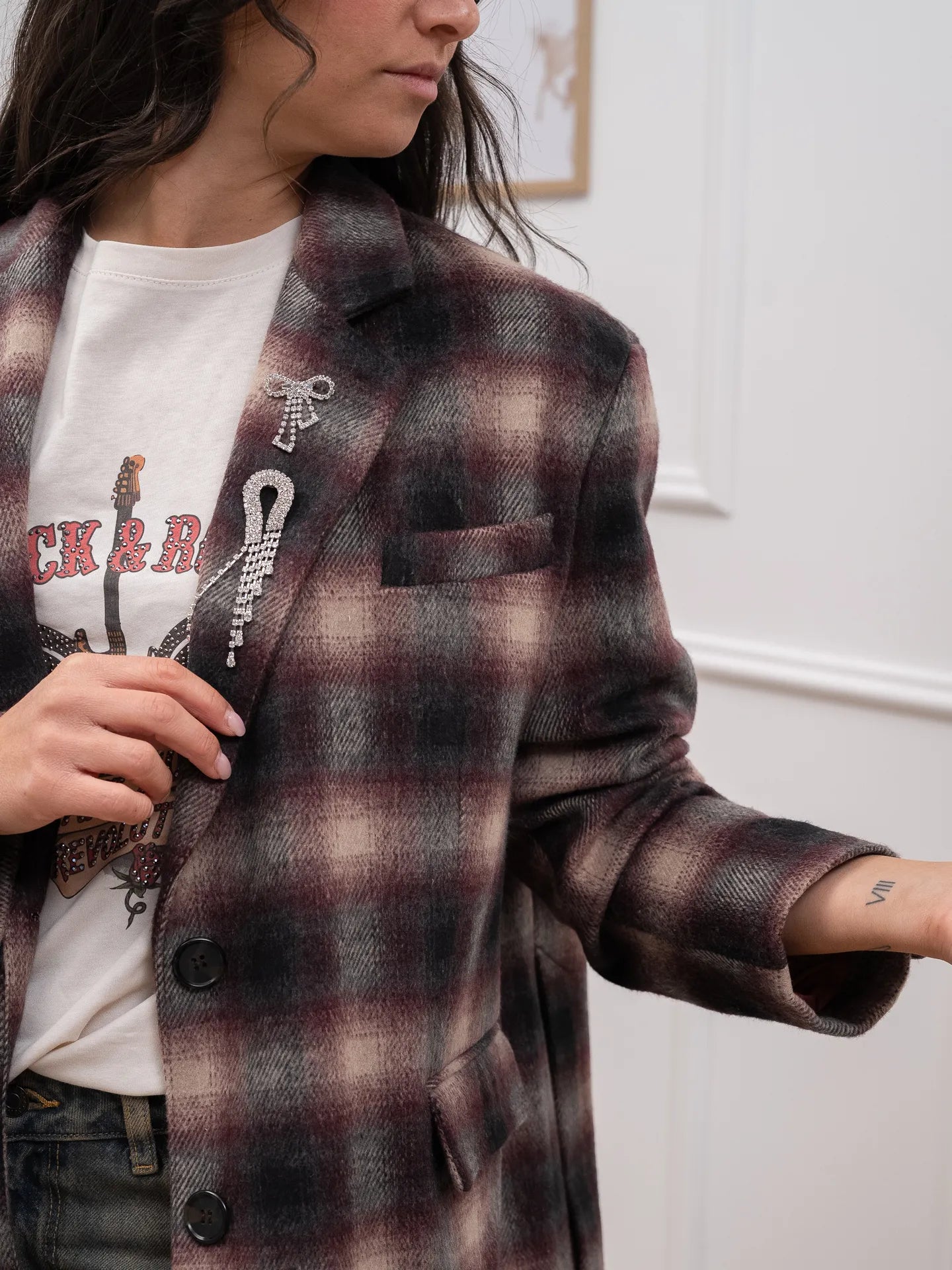 Giacca check in panno sui toni del bordeaux Dixie. Modello collo revers e chiusura frontale monopetto a due bottoni. Dettaglio di spille gioiello. Manica lunga con bottoncini sul fondo e tasche con patta.