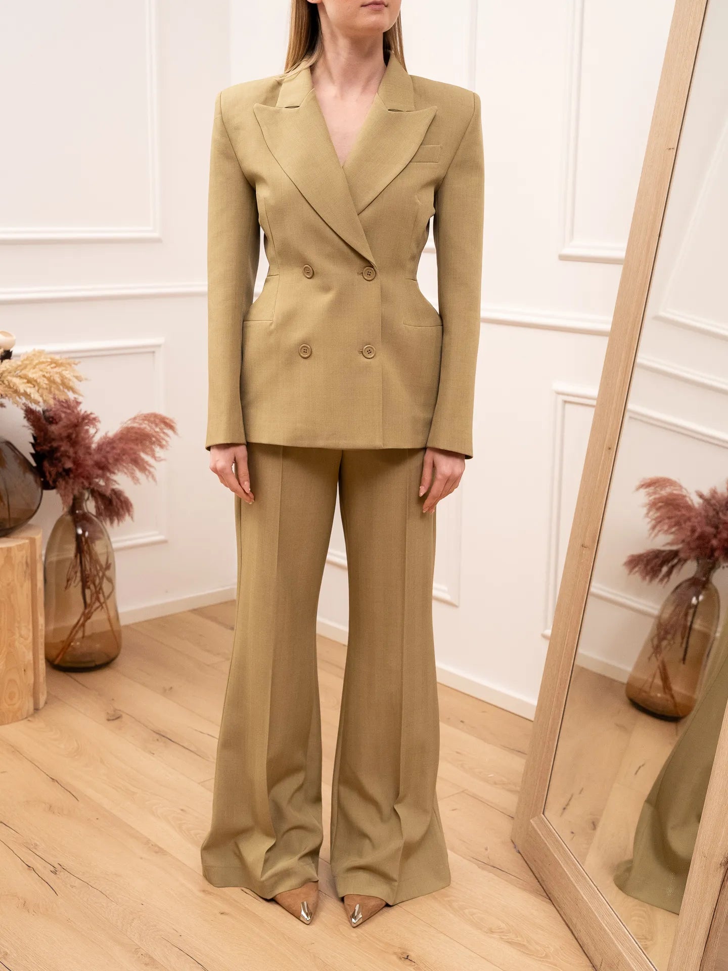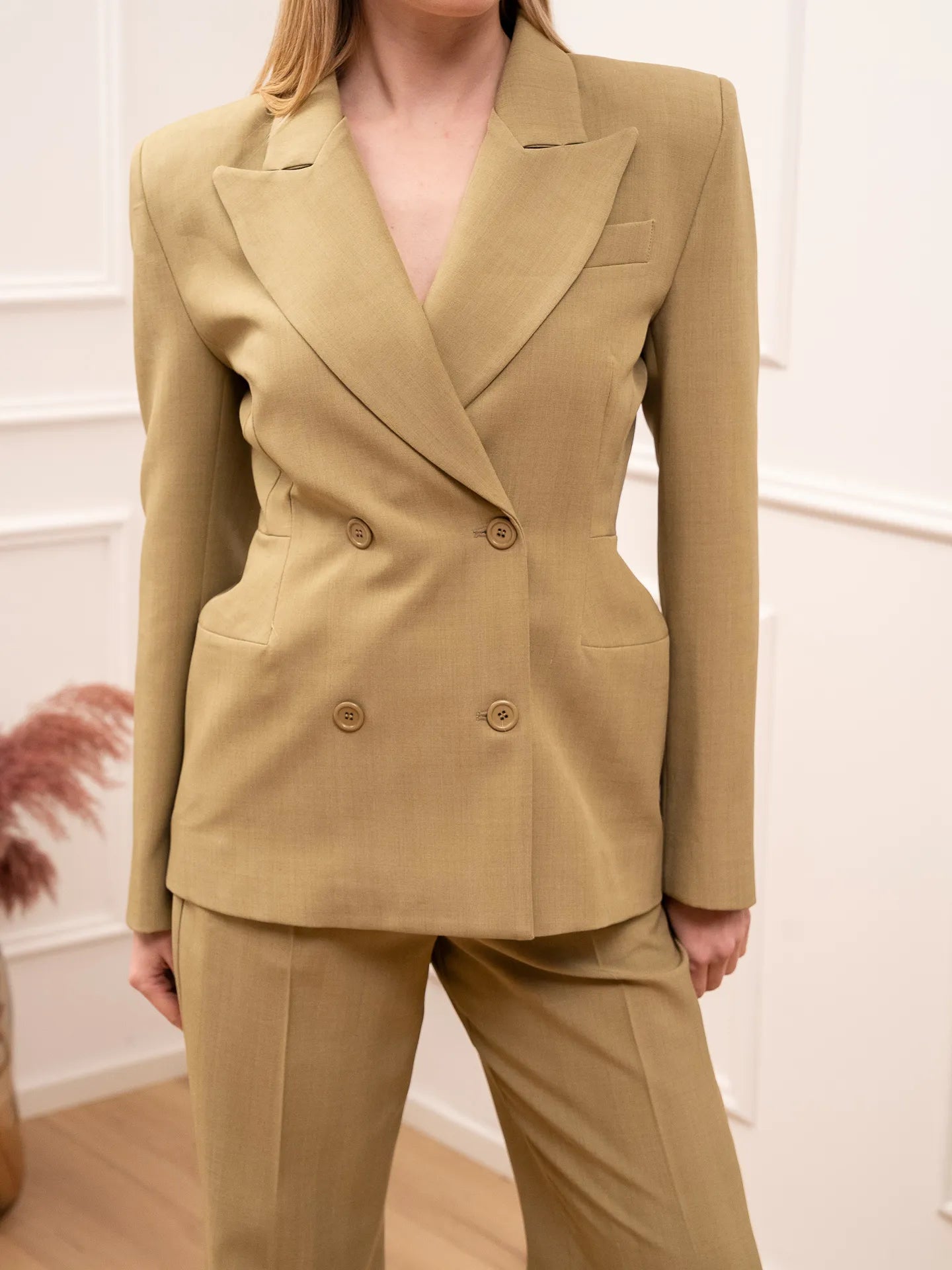 Giacca Clessidra color olio Dixie. Modello chiusura doppiopetto fit a clessidra con maxi spalline. Collo revers e fit regolare. Tasche a filetto frontali.