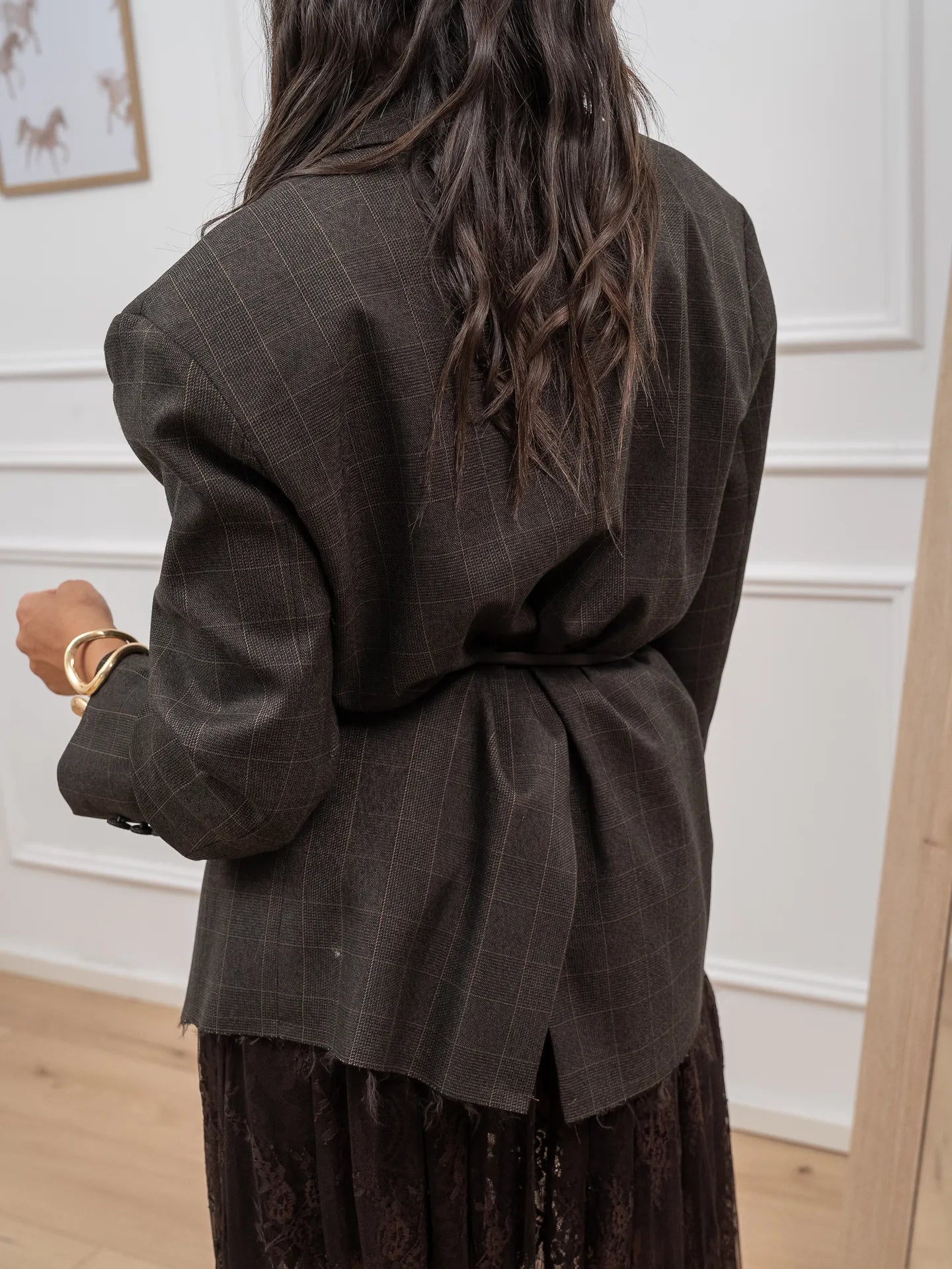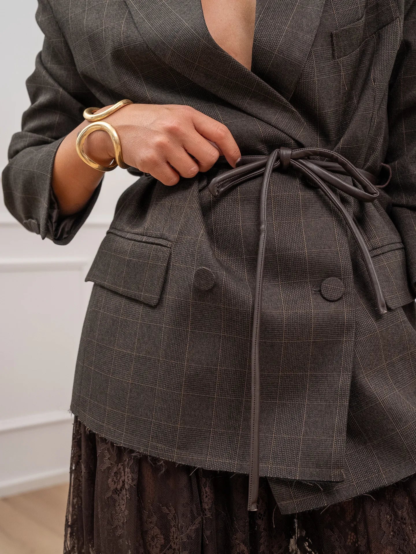 Giacca fantasia check color moro Vicolo. Modello collo revers e chiusura doppiopetto con bottoni rivestiti. Dettaglio di cintura da annodare in vita in ecopelle morbida. Spalle imbottite e tasche con patta frontali.