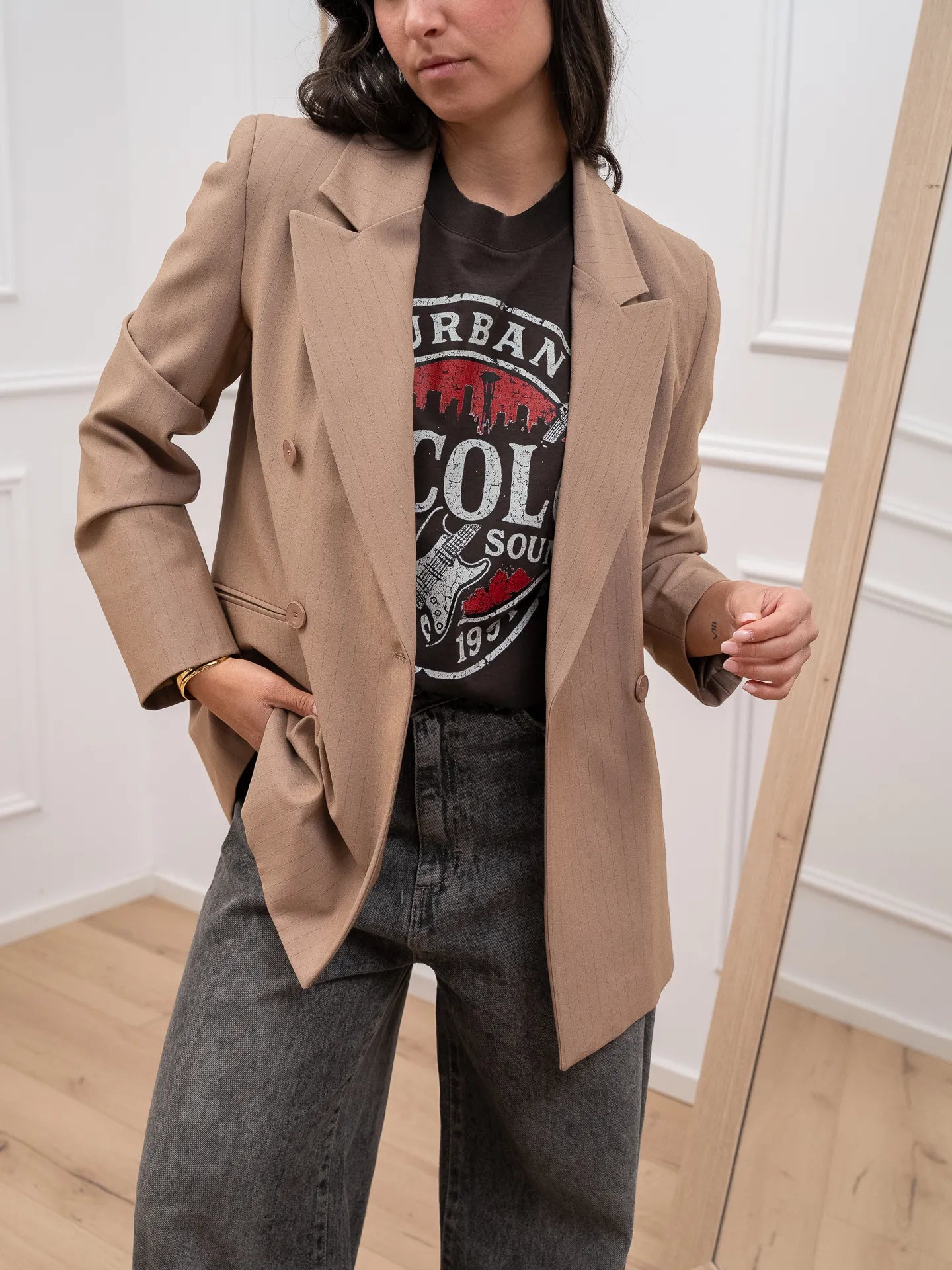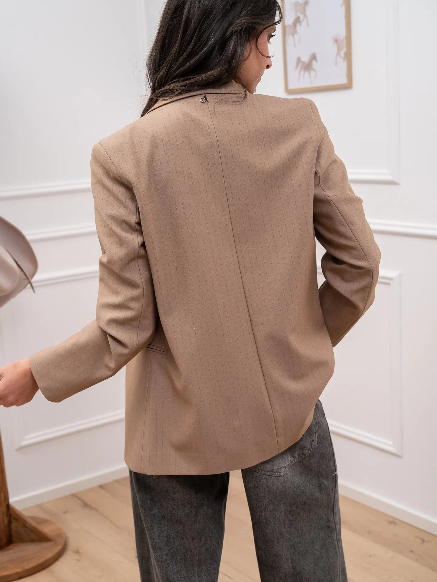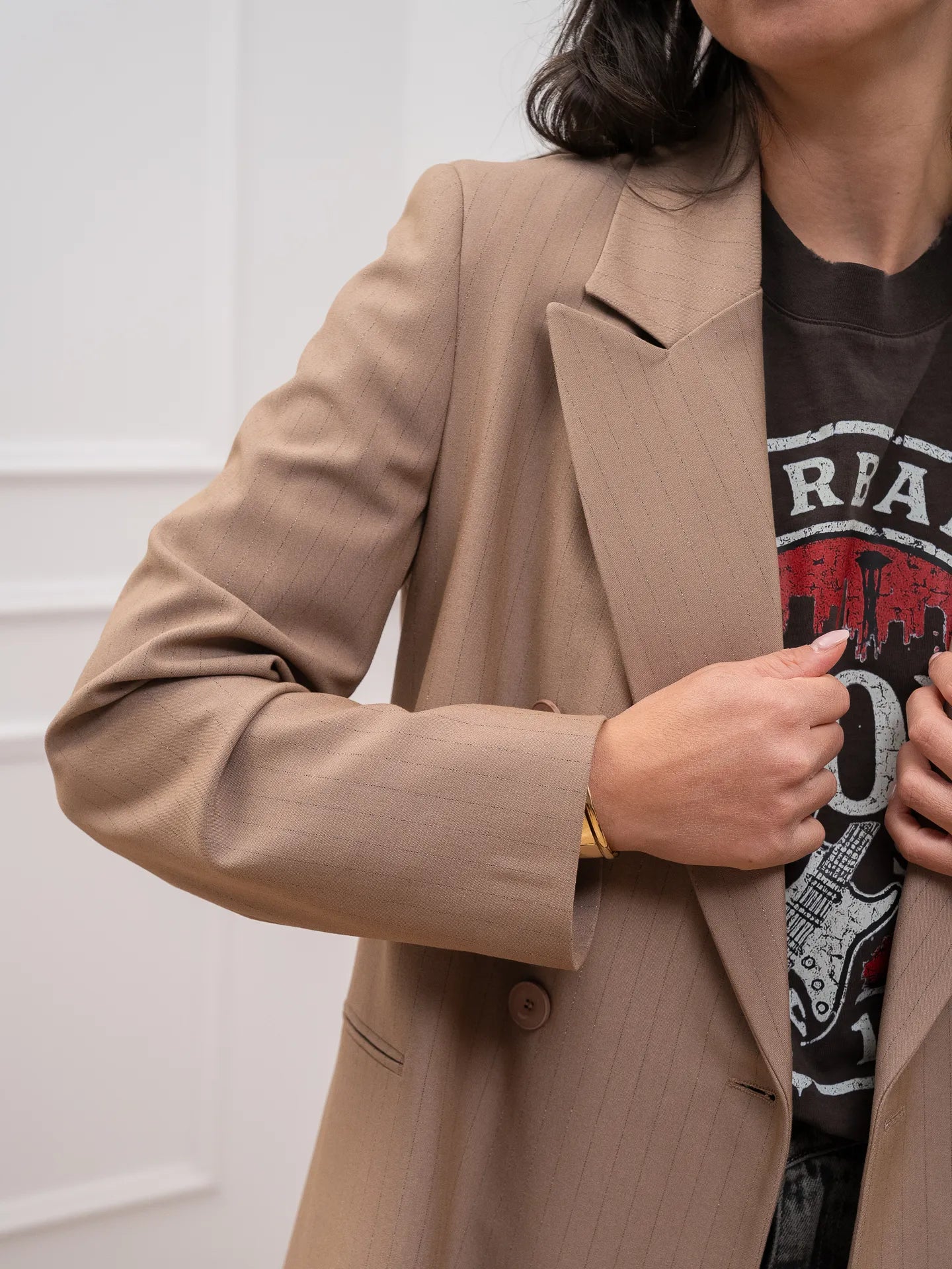 Giacca gessata lurex color camel Dixie. Modello chiusura doppiopetto, spalla leggermente imbottita e manica lunga, tasche a filetto.