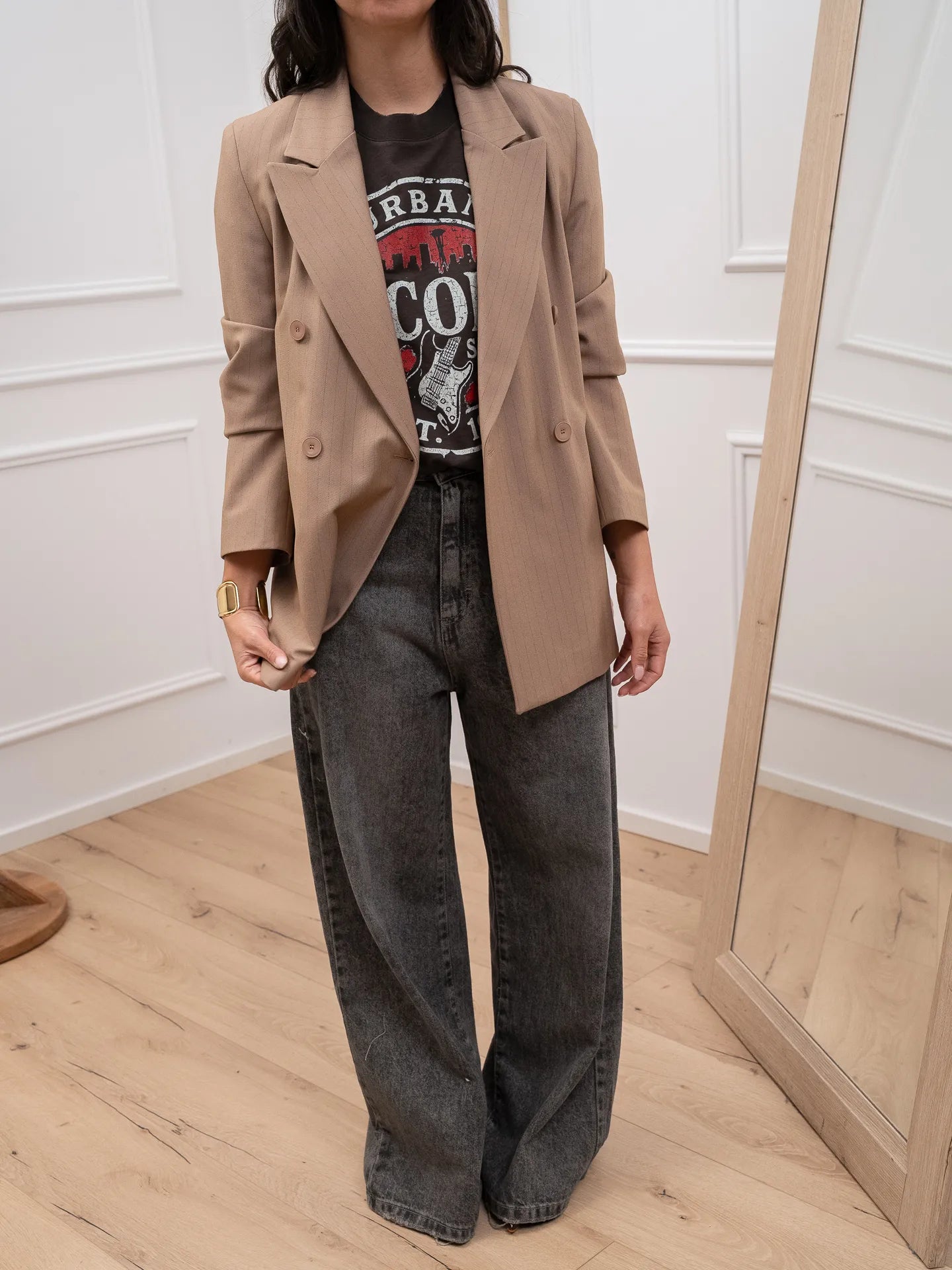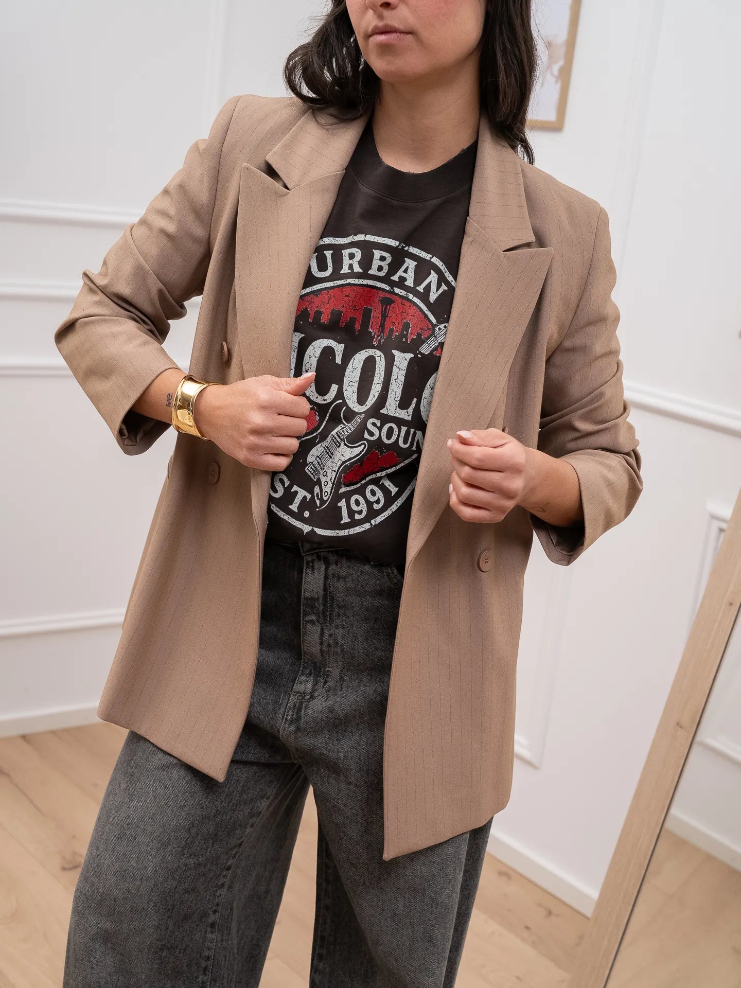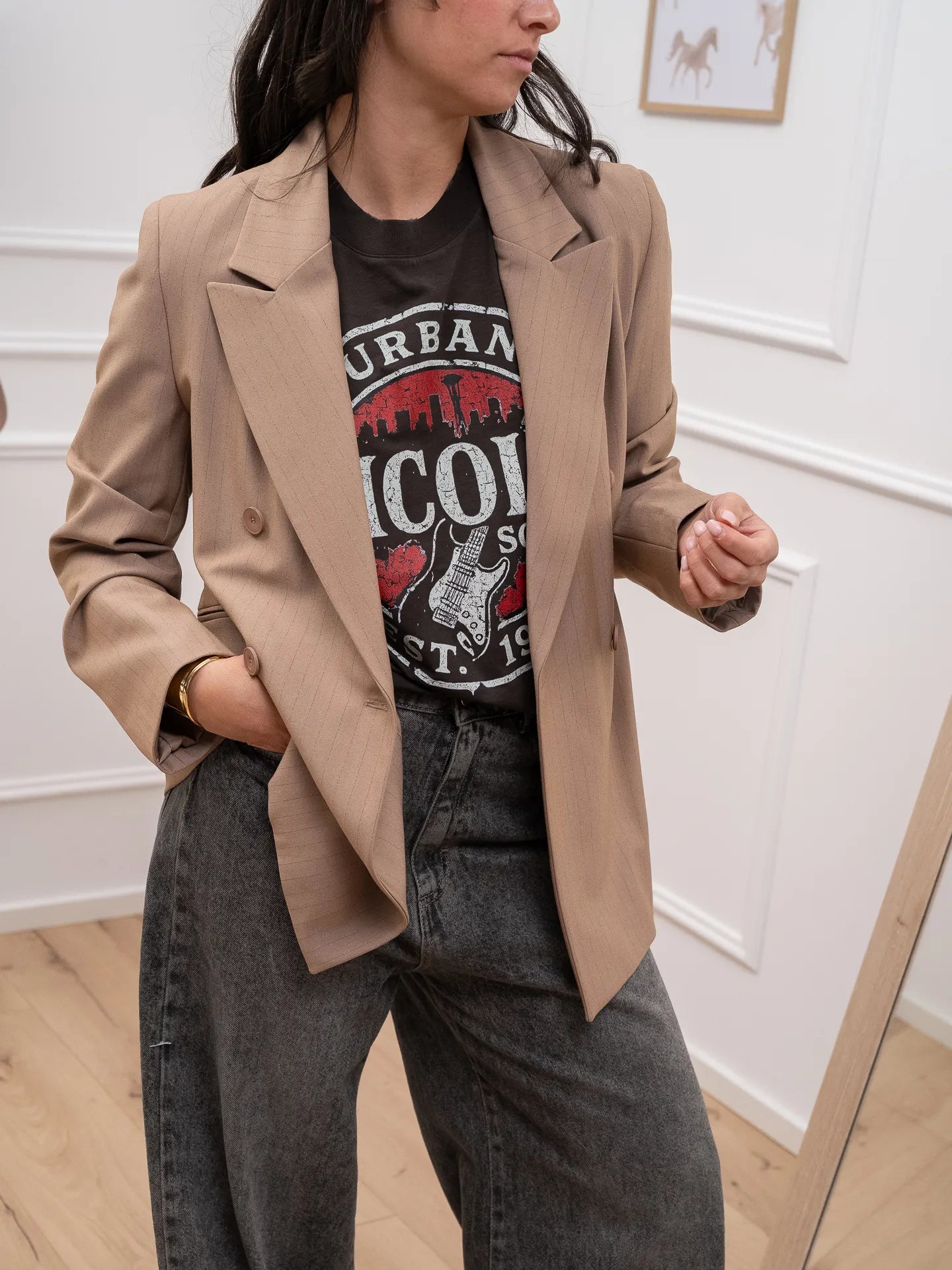 Giacca gessata lurex color camel Dixie. Modello chiusura doppiopetto, spalla leggermente imbottita e manica lunga, tasche a filetto.