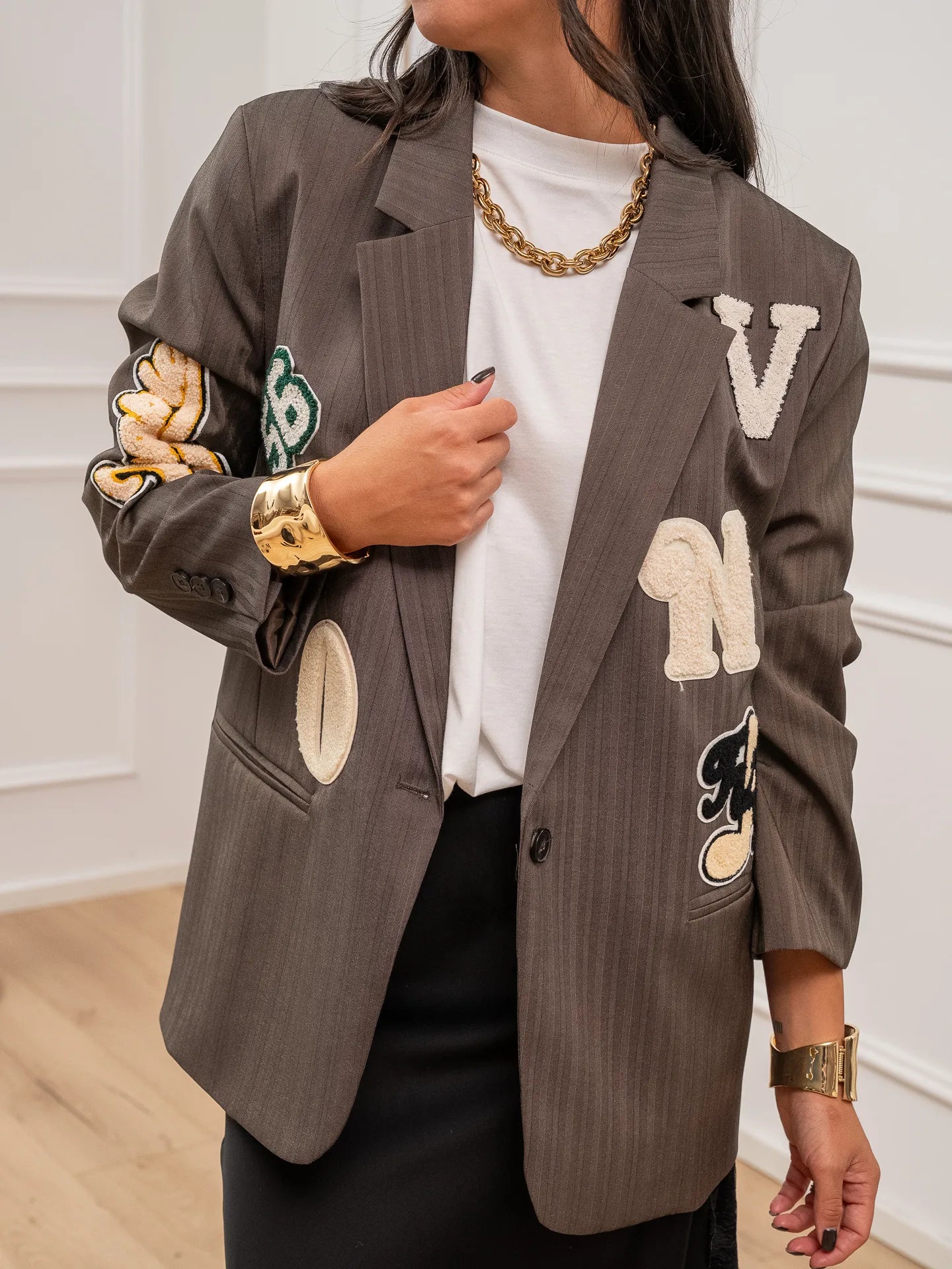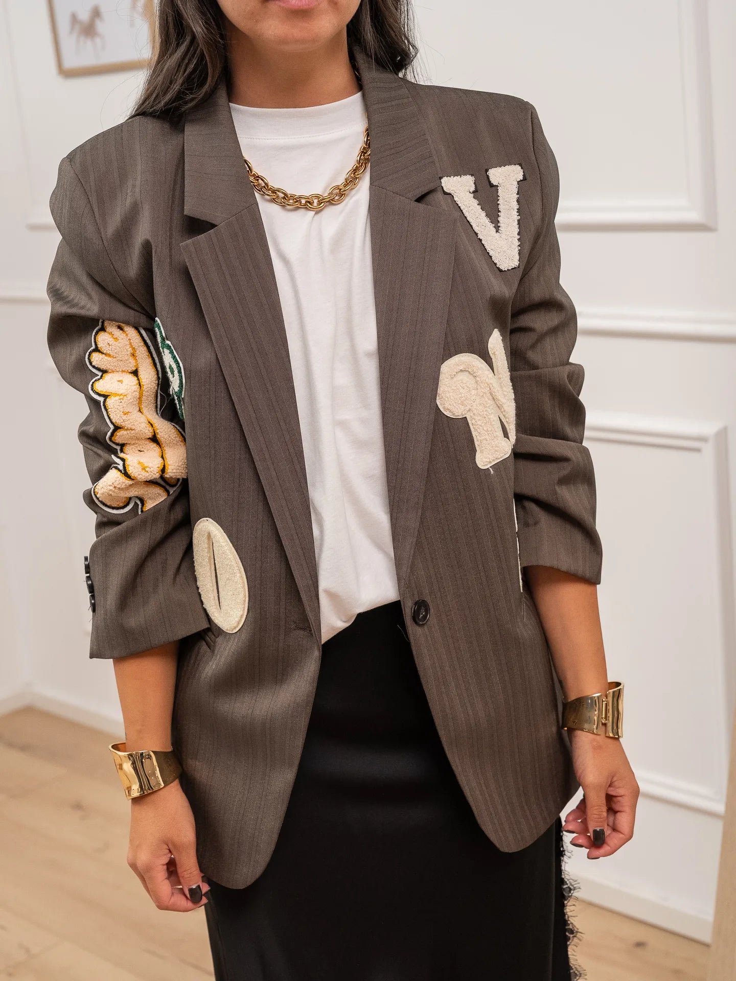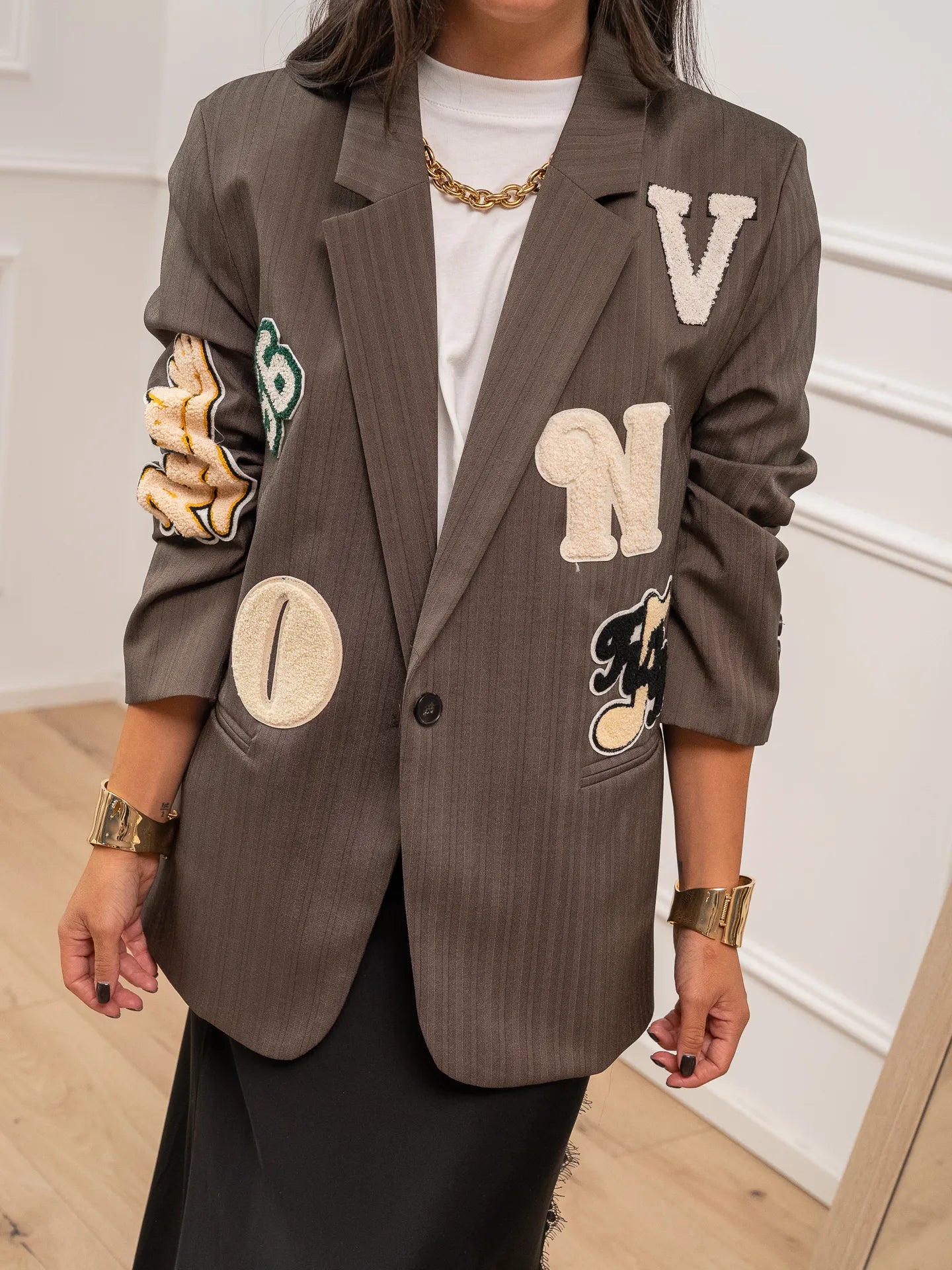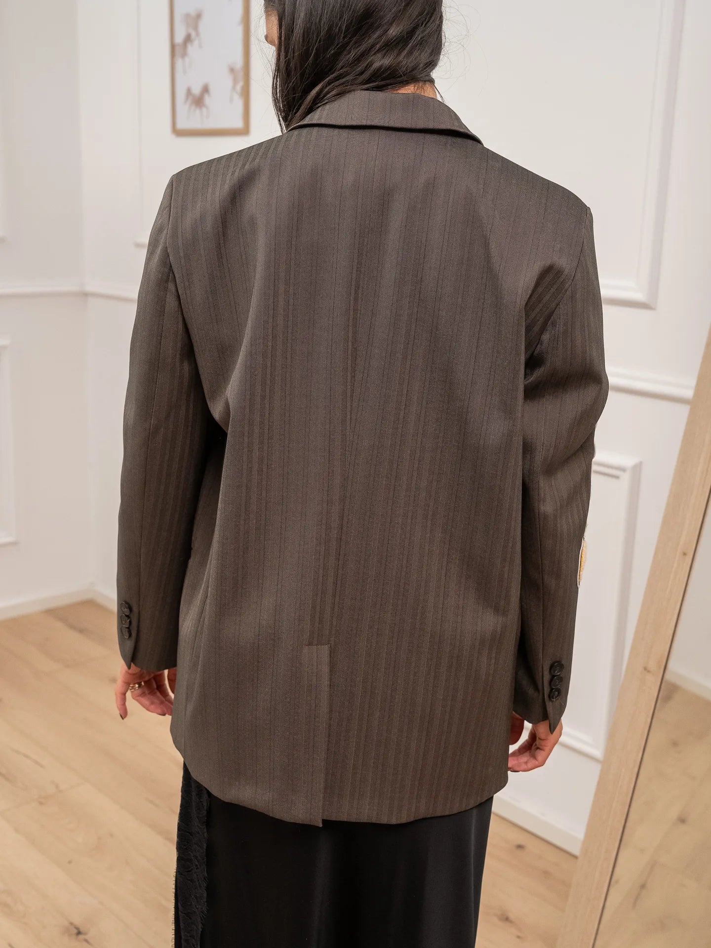 Giacca gessata moro Vicolo. Modello collo revers e chiusura frontale monopetto. Maniche lunghe e tasche a filetto. Dettaglio di patch bouclè.