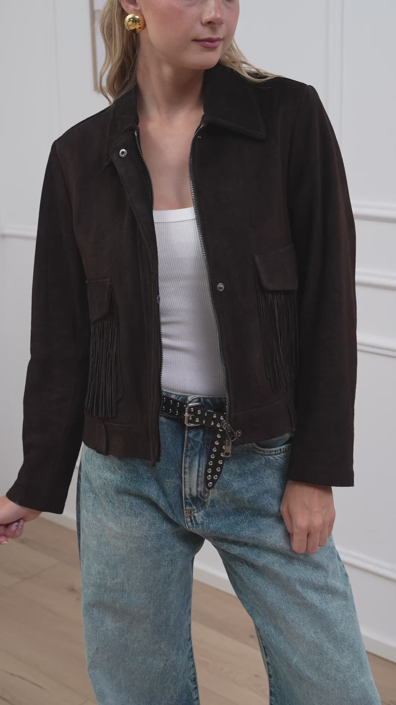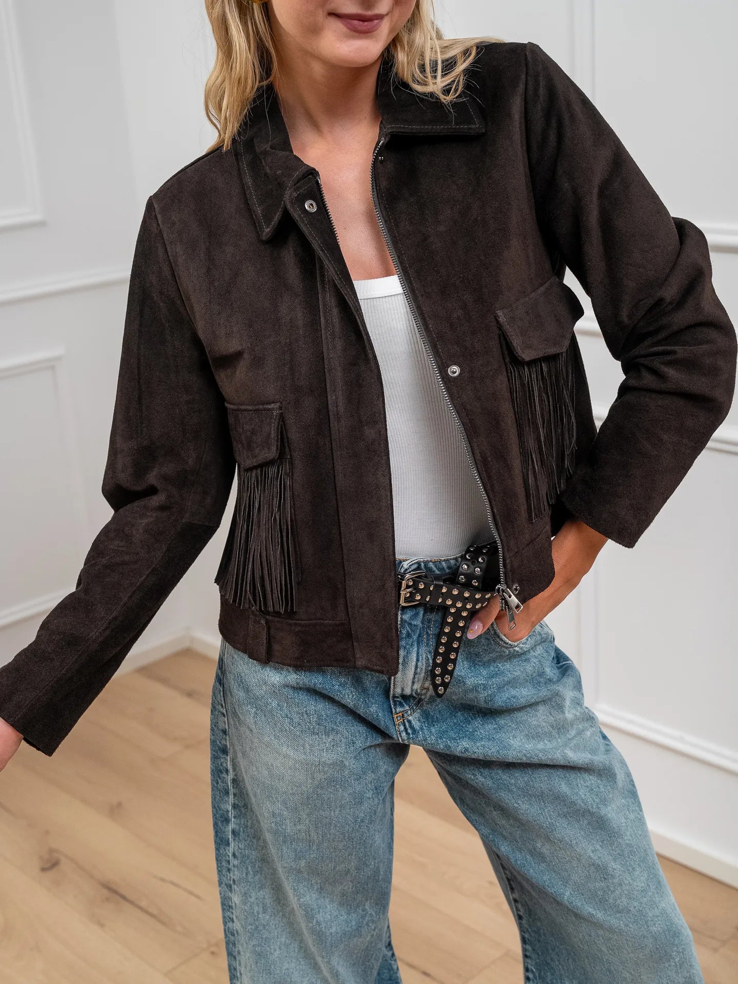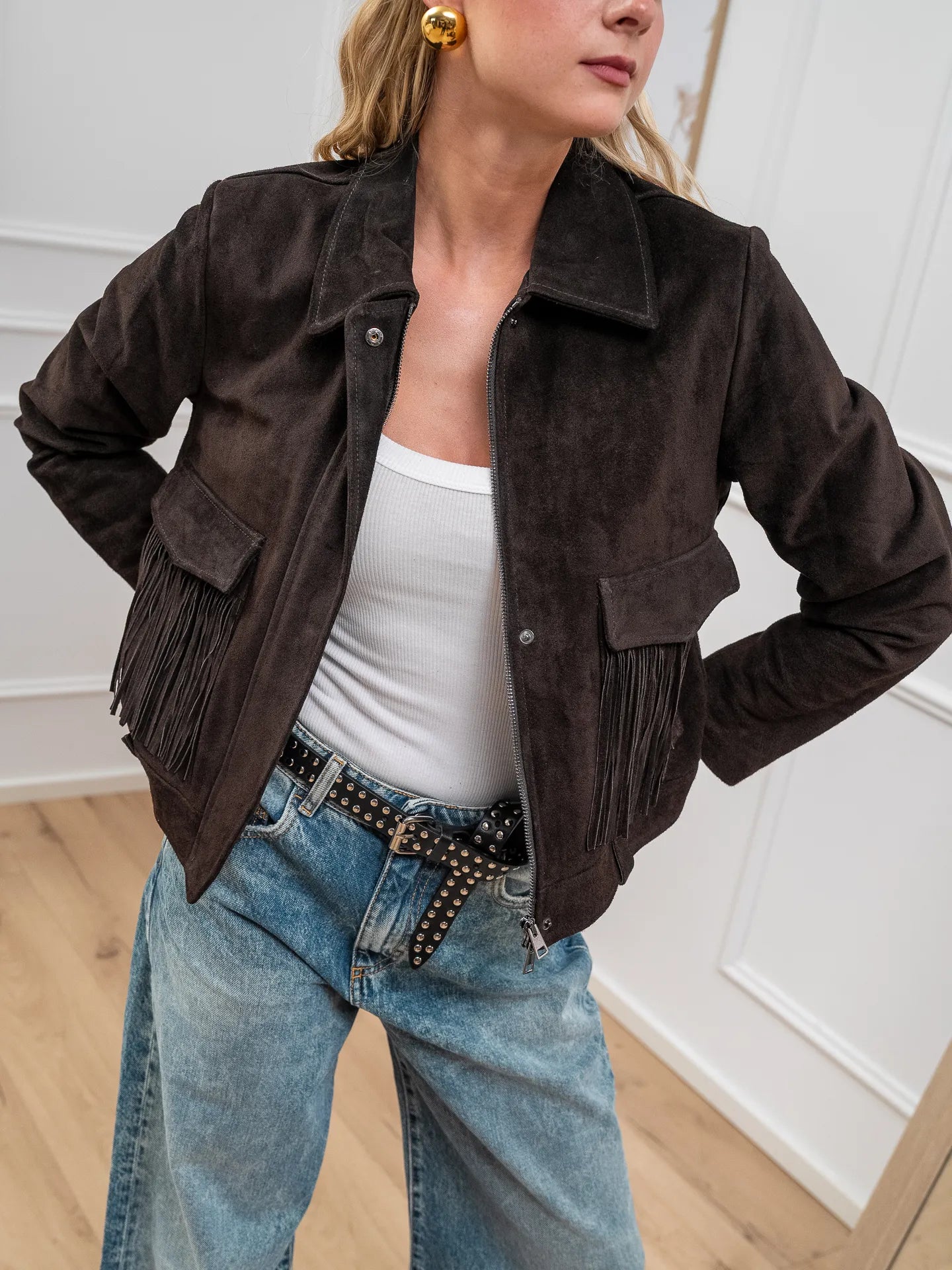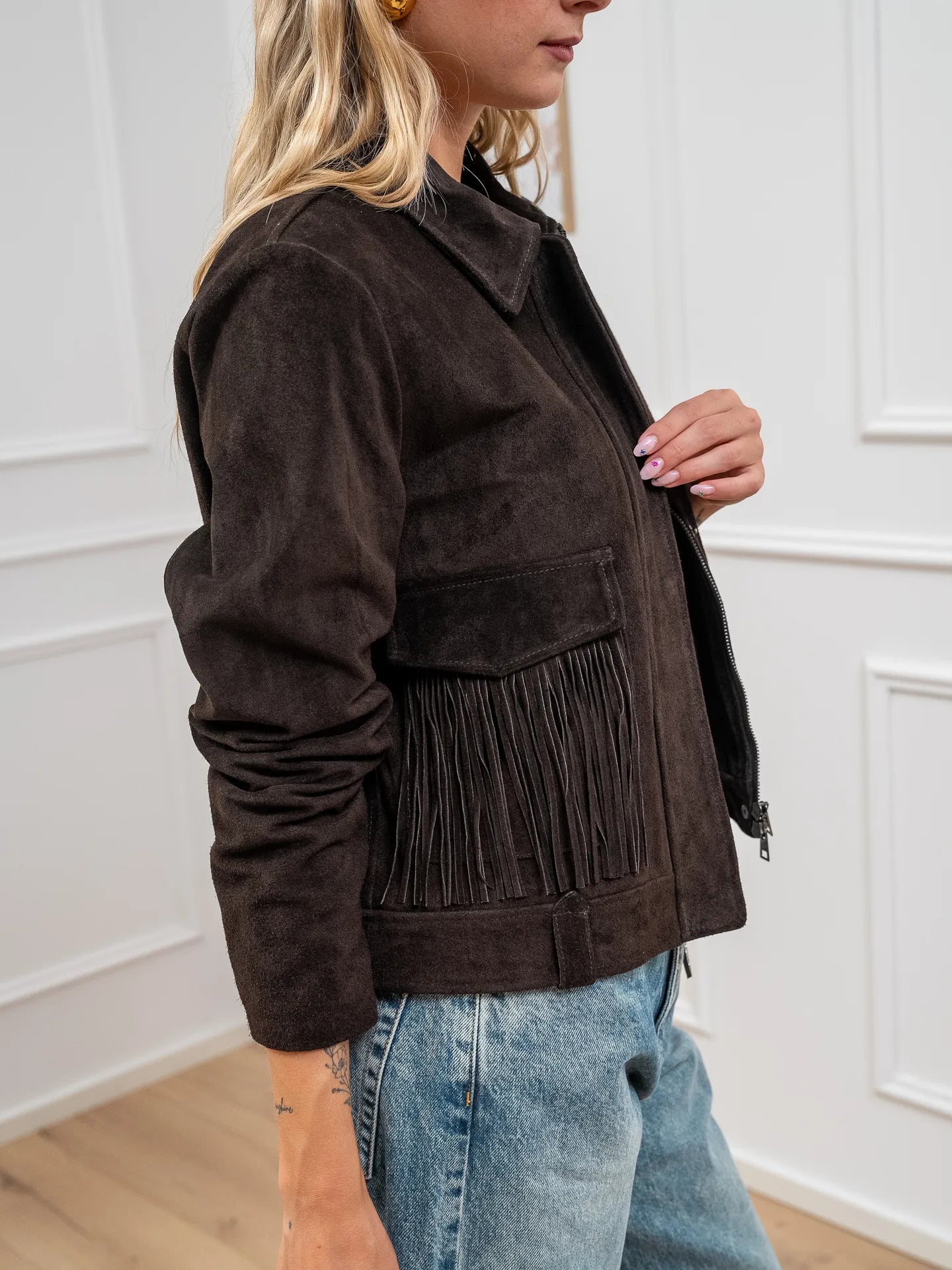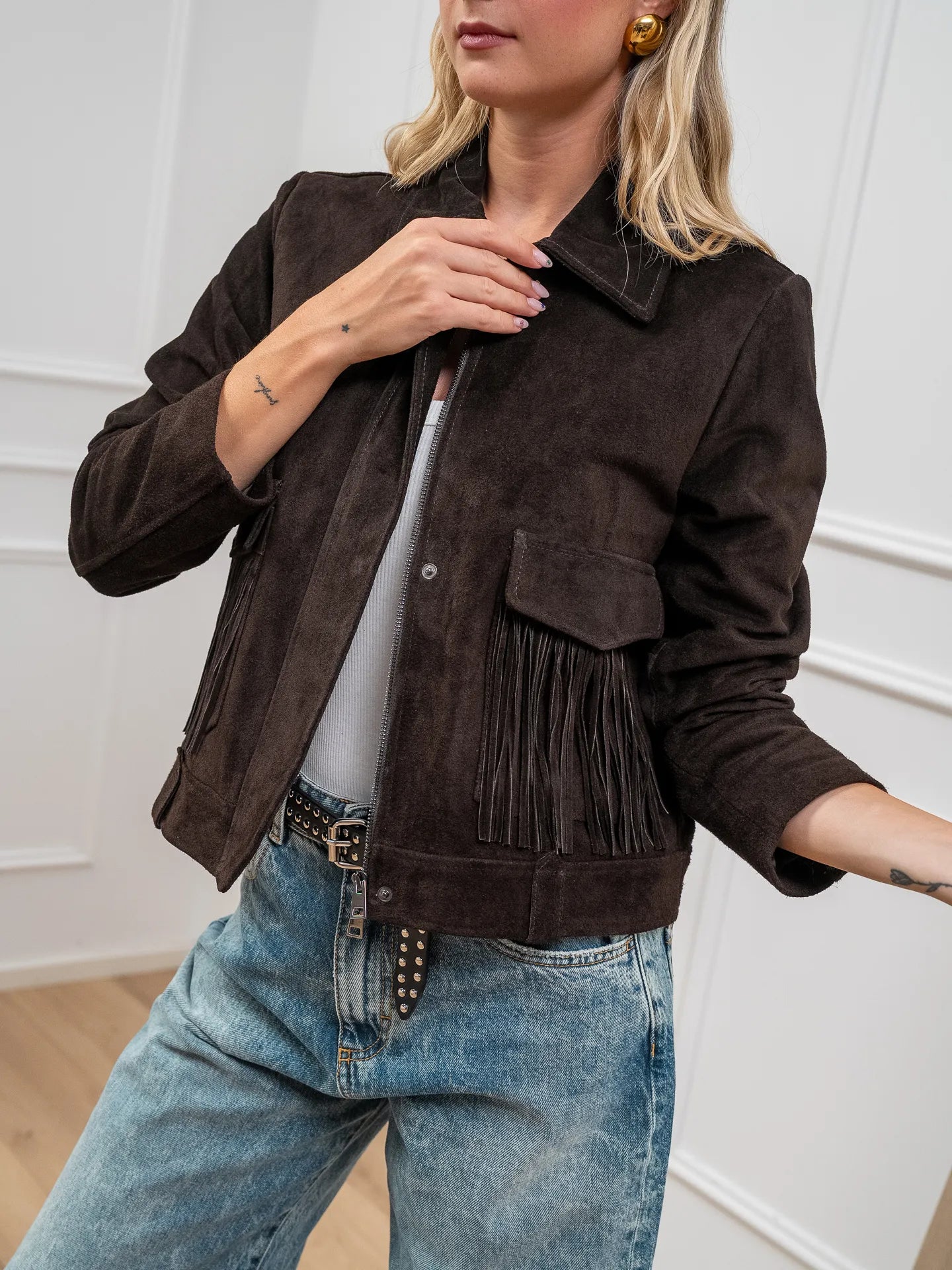 Giacca in crosta color moro Vicolo. Modello fit crop con colletto e chiusura frontale con bottoni nascosti e zip. Maxi tasche frontali con patta e dettaglio di frange.