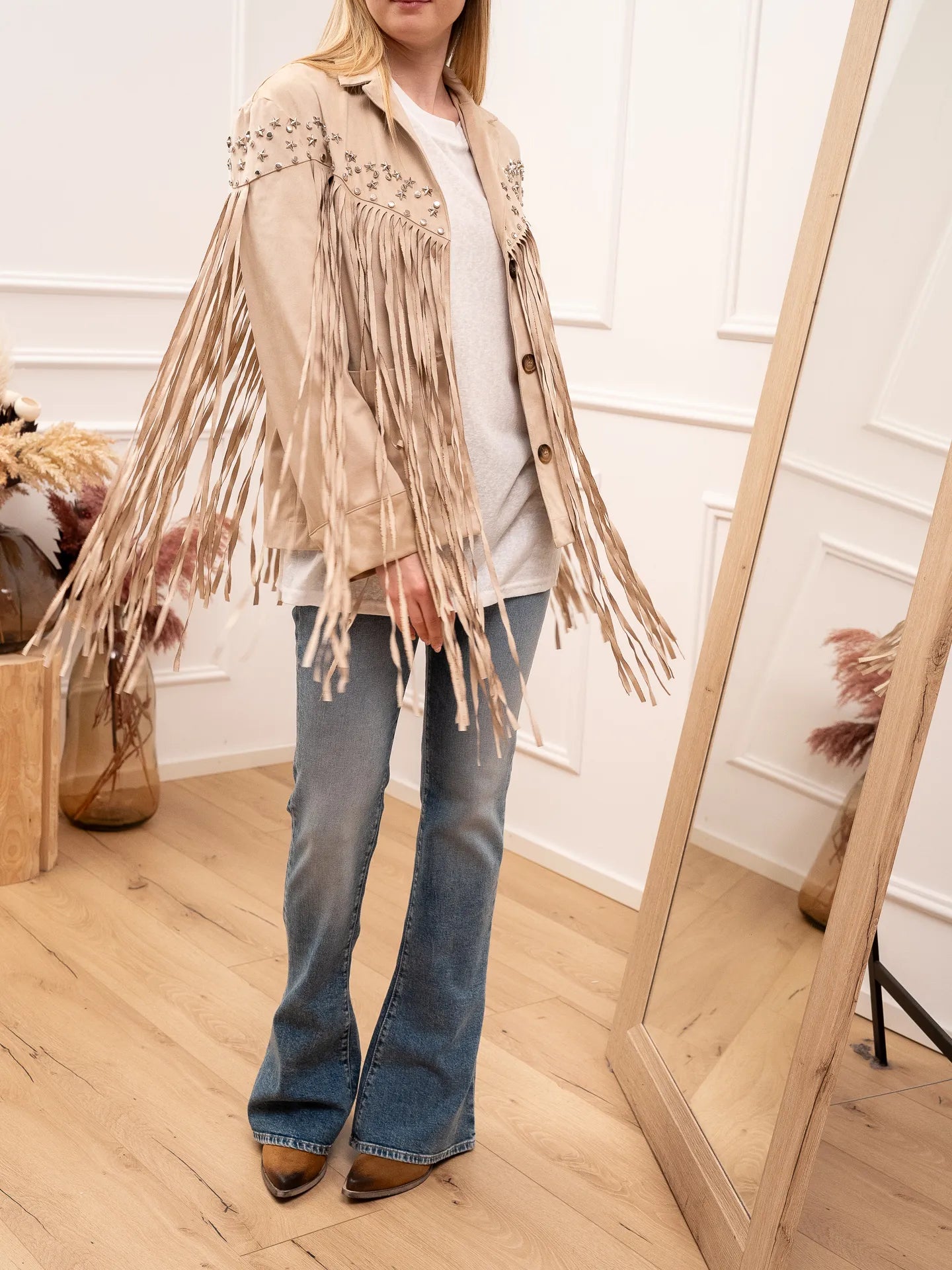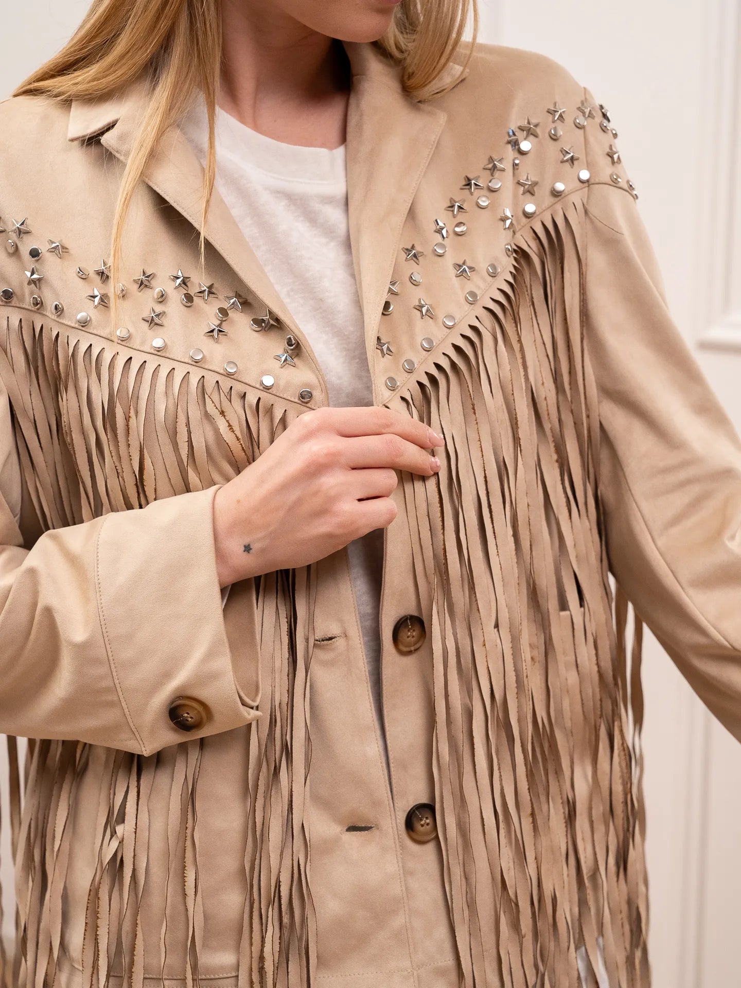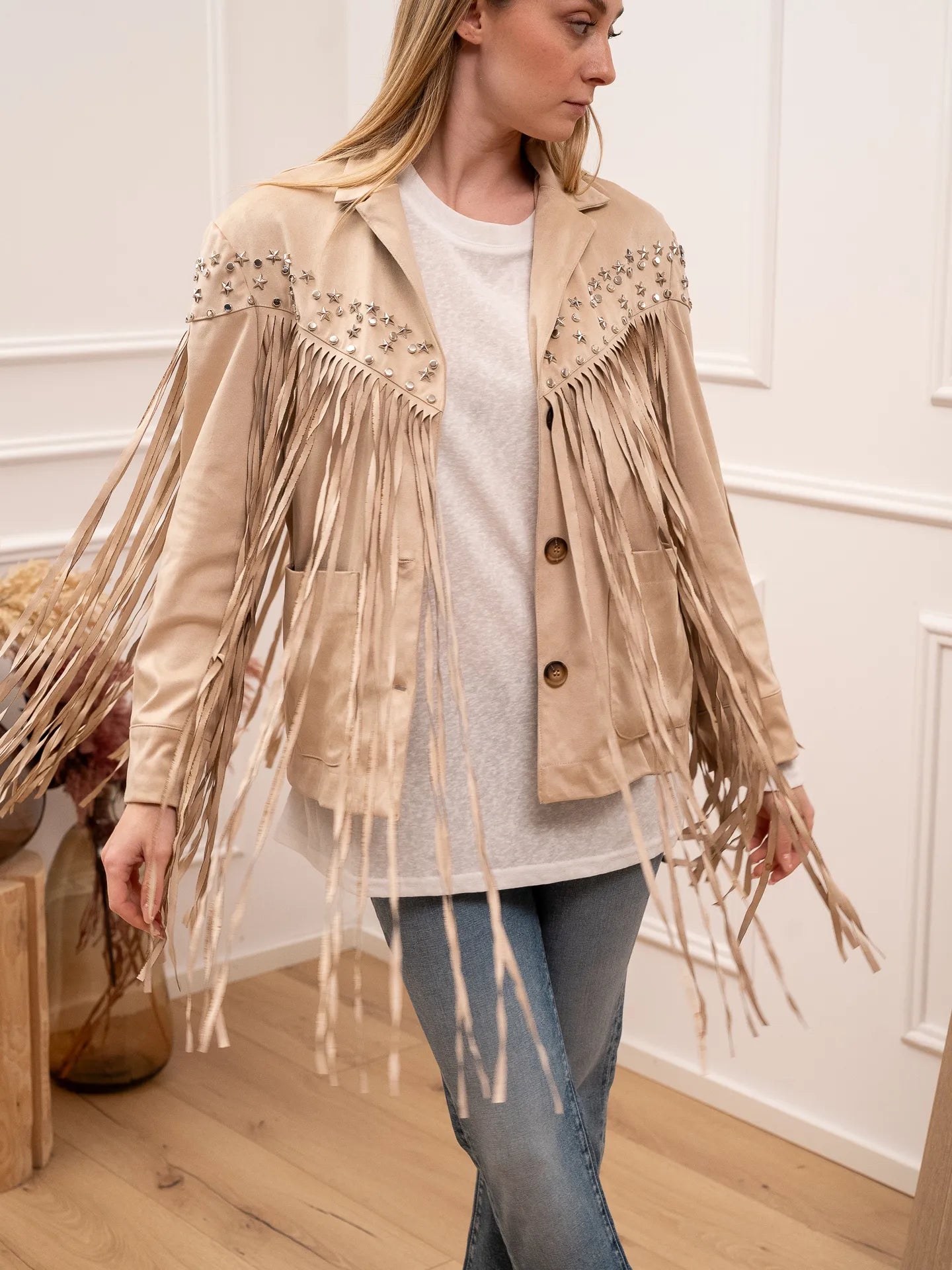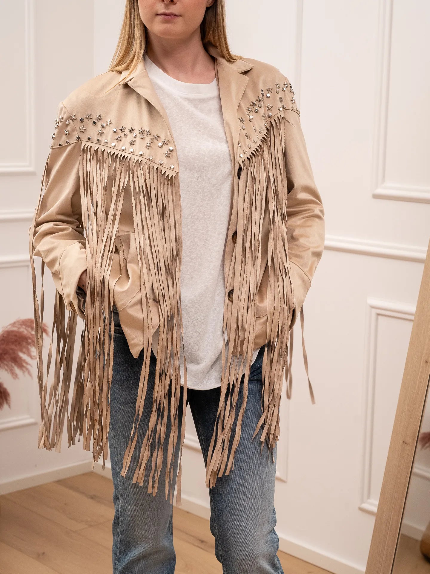 Giacca in suede beige con frange e borchie - HaveOne