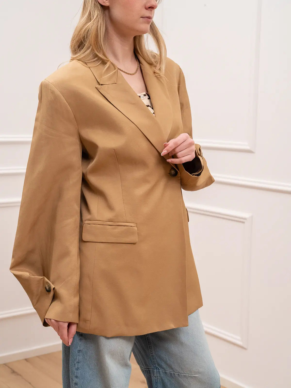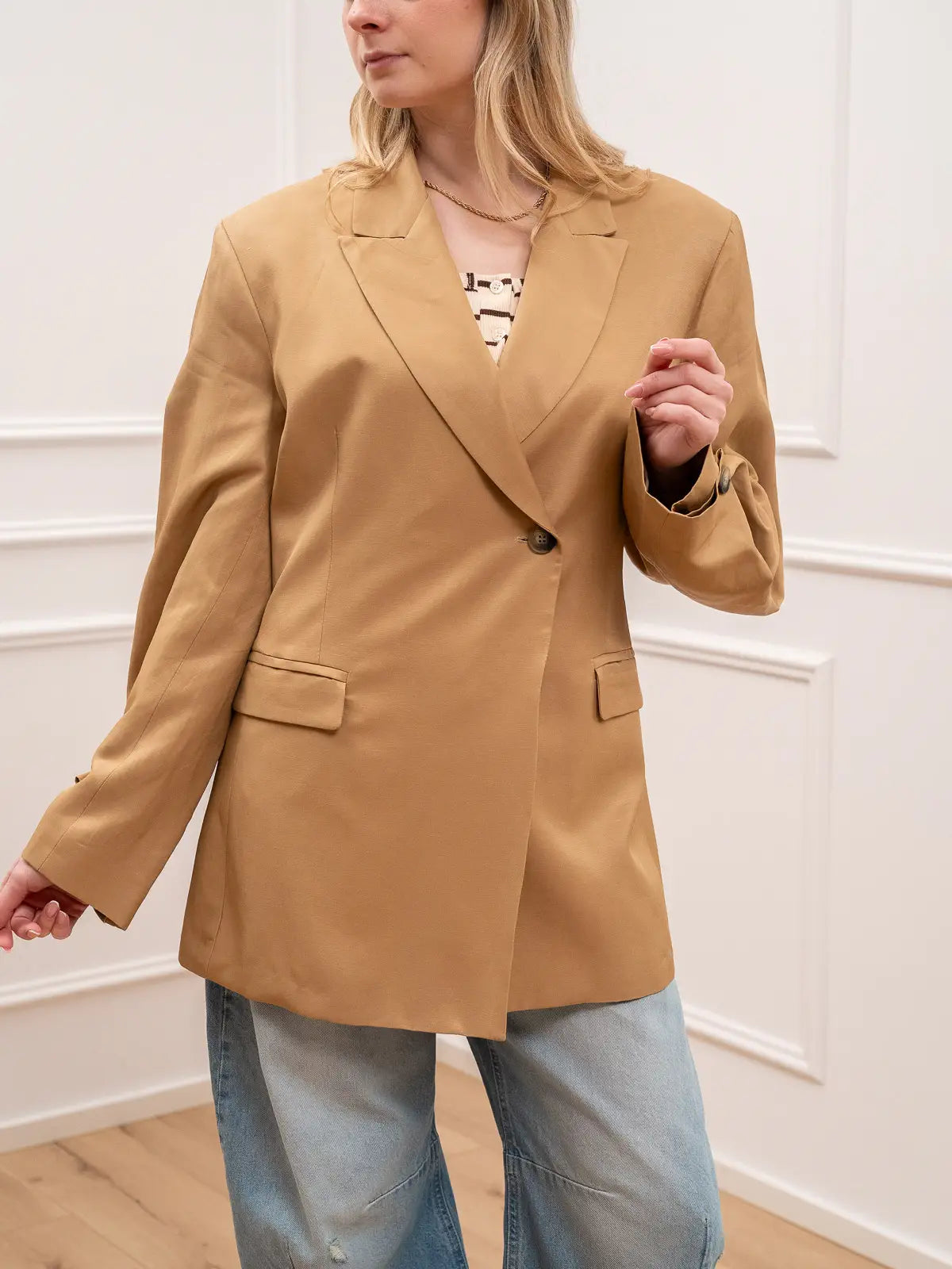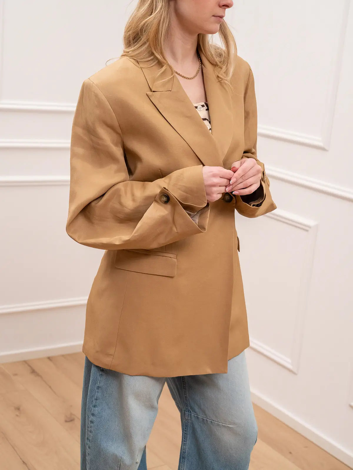 Giacca color miele in tessuto satinato HaveOne. Modello collo revers e chiusura doppiopetto. Dettaglio di manica a prosciutto con bottone sul fondo. Tasche frontali con patta.
