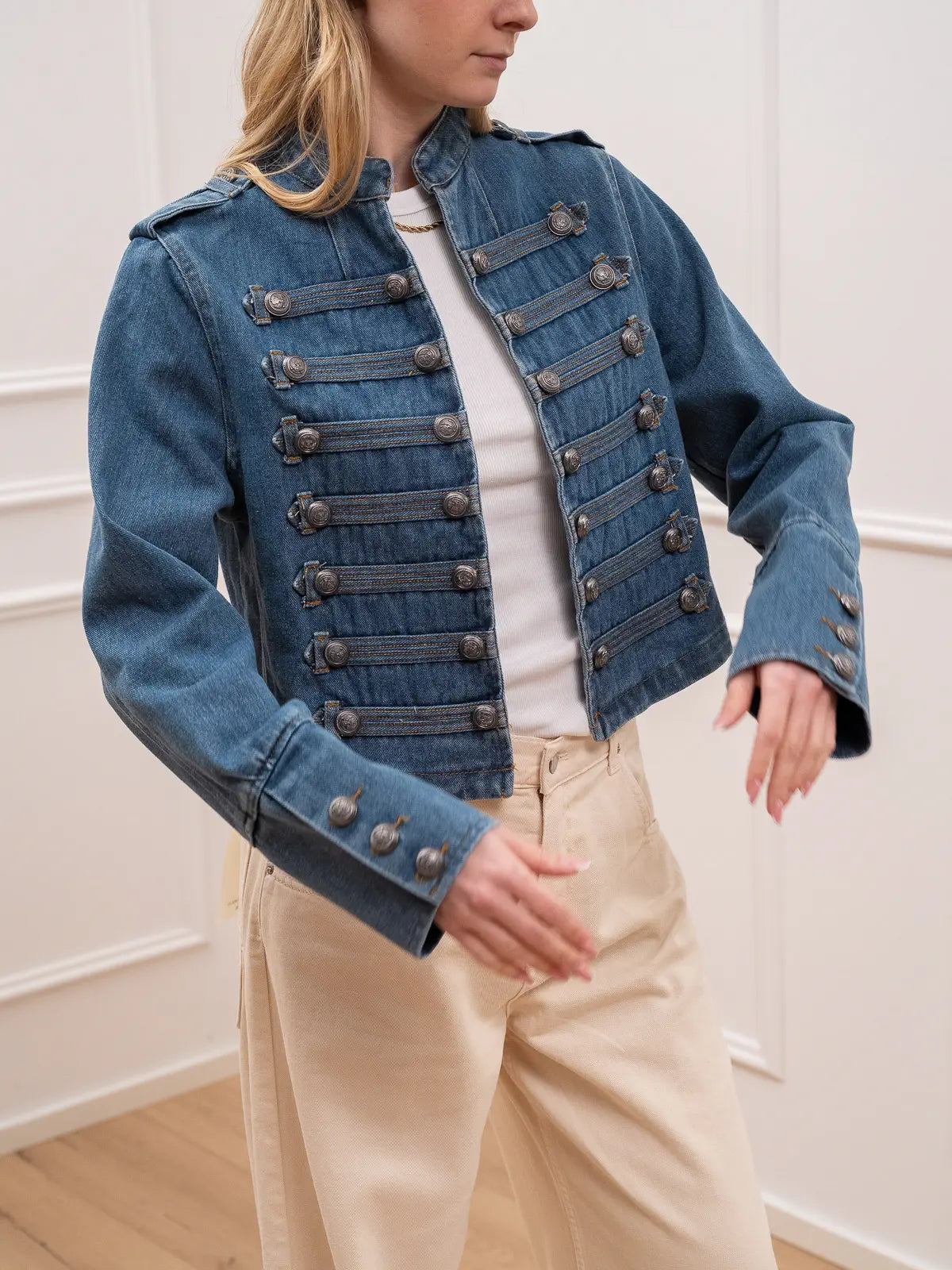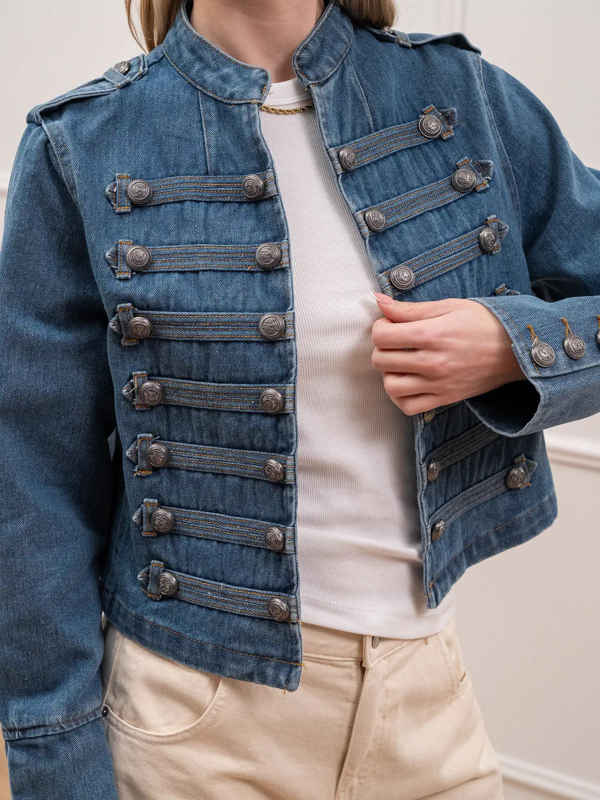Giacca Napoleon in denim 100% cotone Tensione In. Modello fit cropped con chiusura frontale cona alamari. Maniche lunghe con bottoni sul fondo.