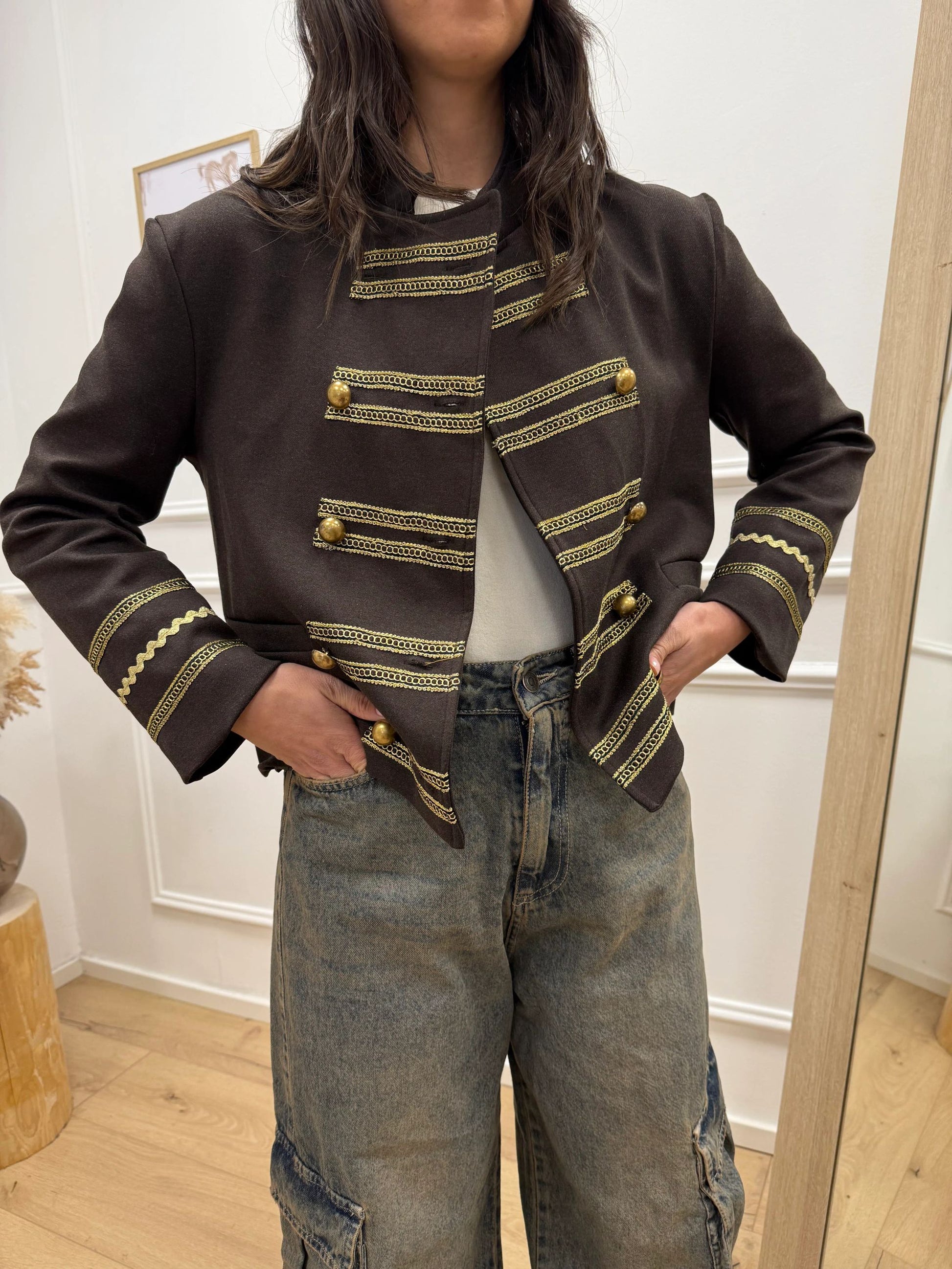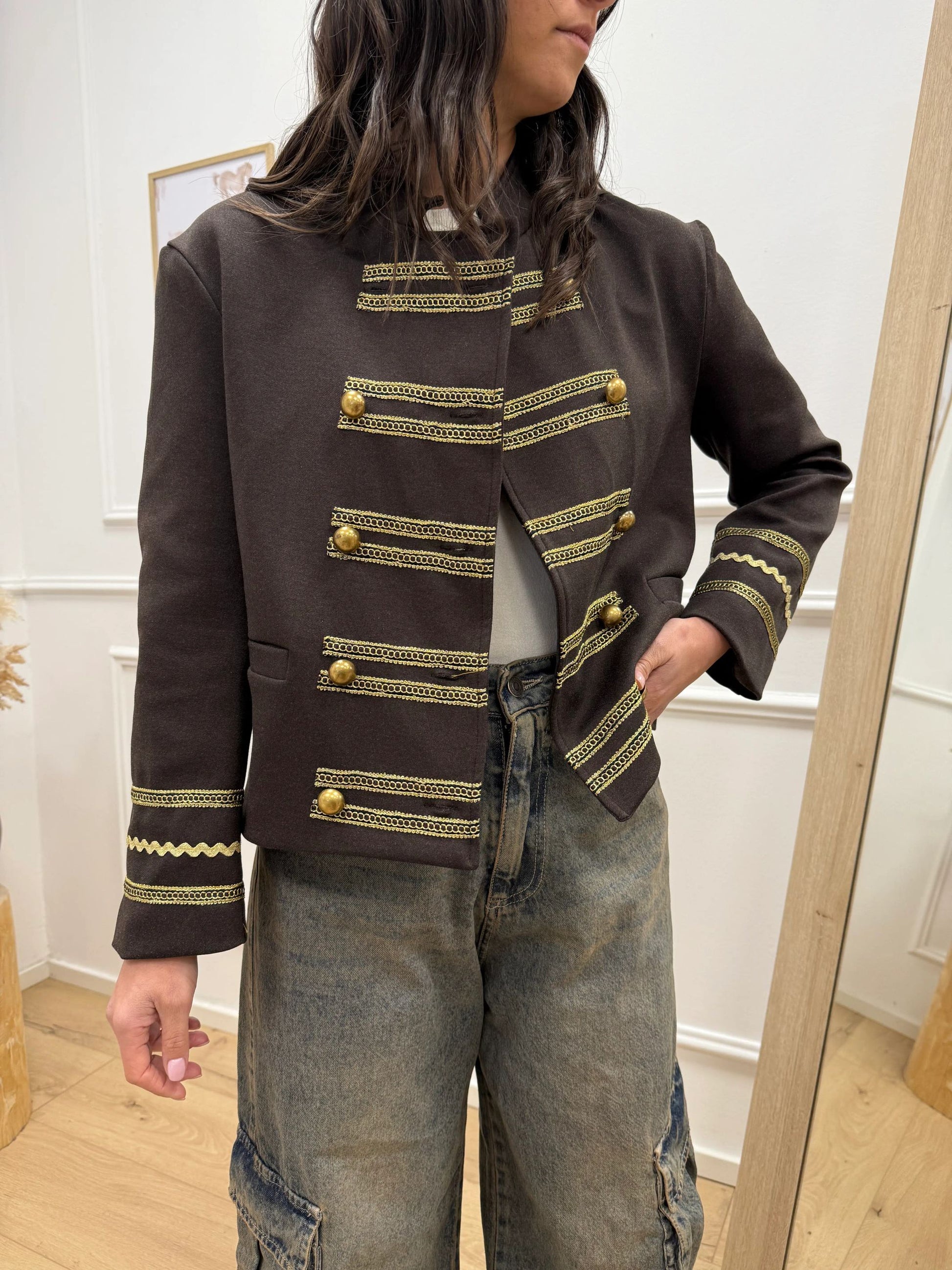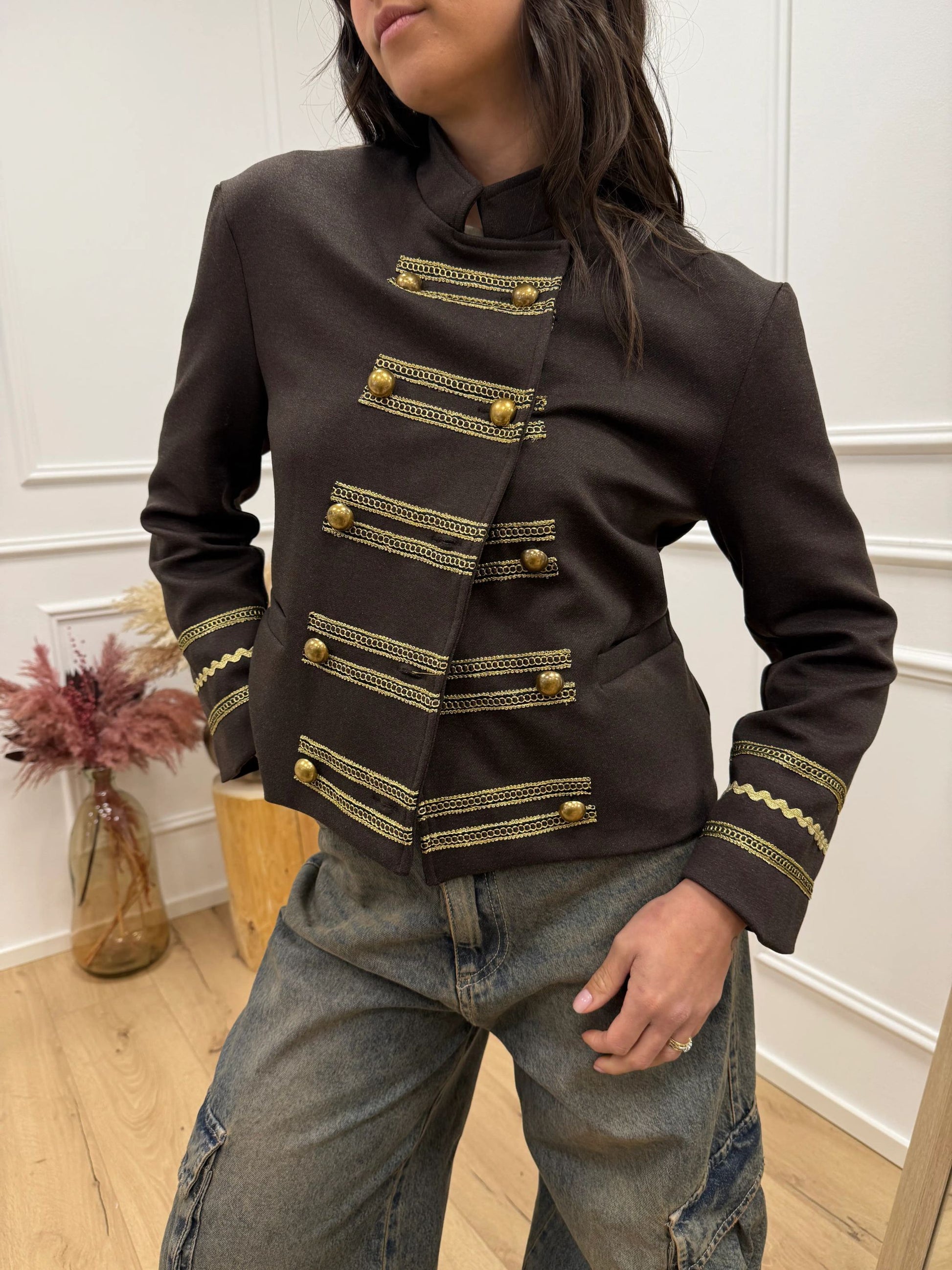 Giacca Napoleone color moro HaveOne. Modello girocollo, chiusura frontale con bottoni dorati. Dettaglio di ricami dorati e tasche a filetto.