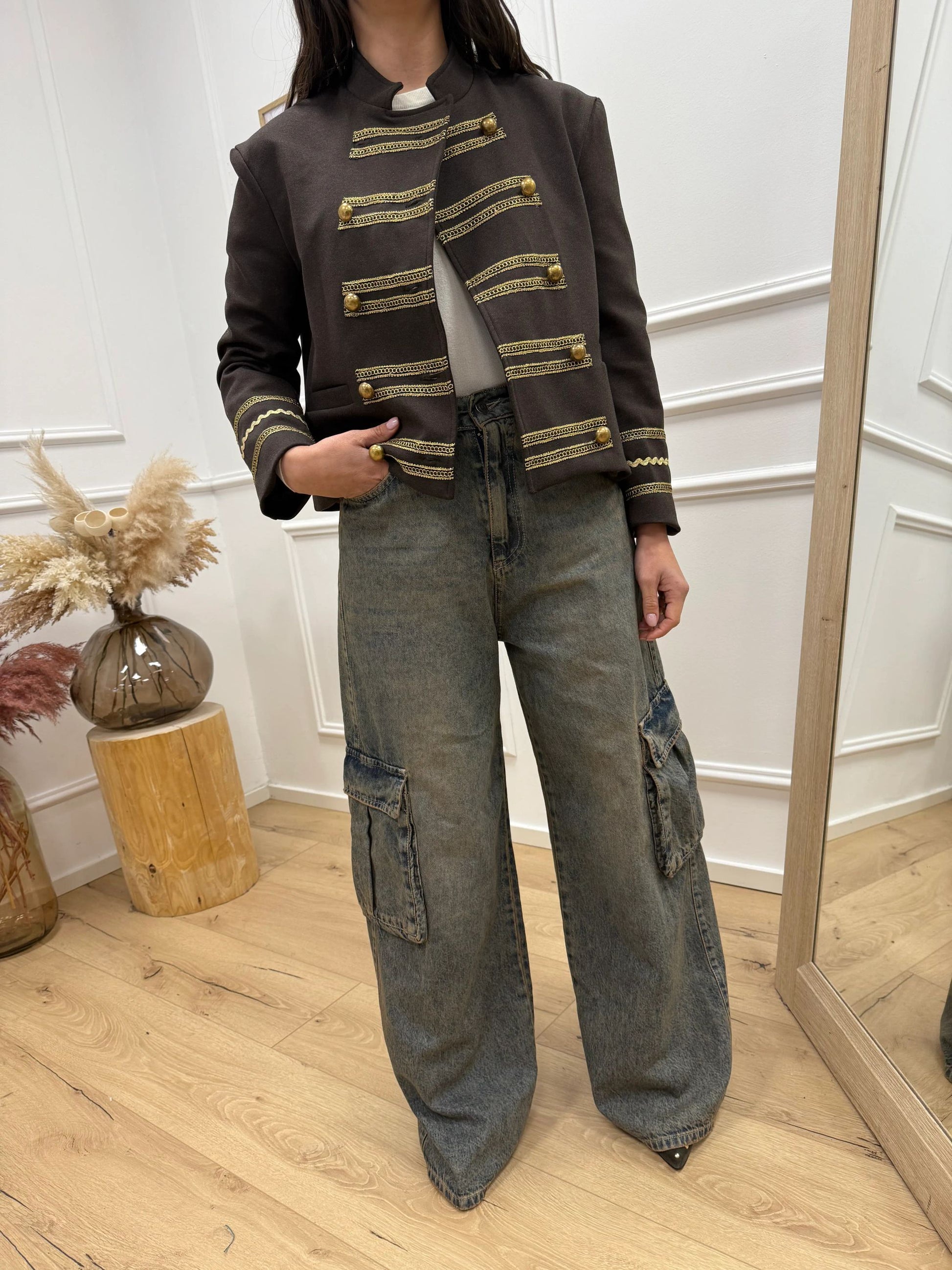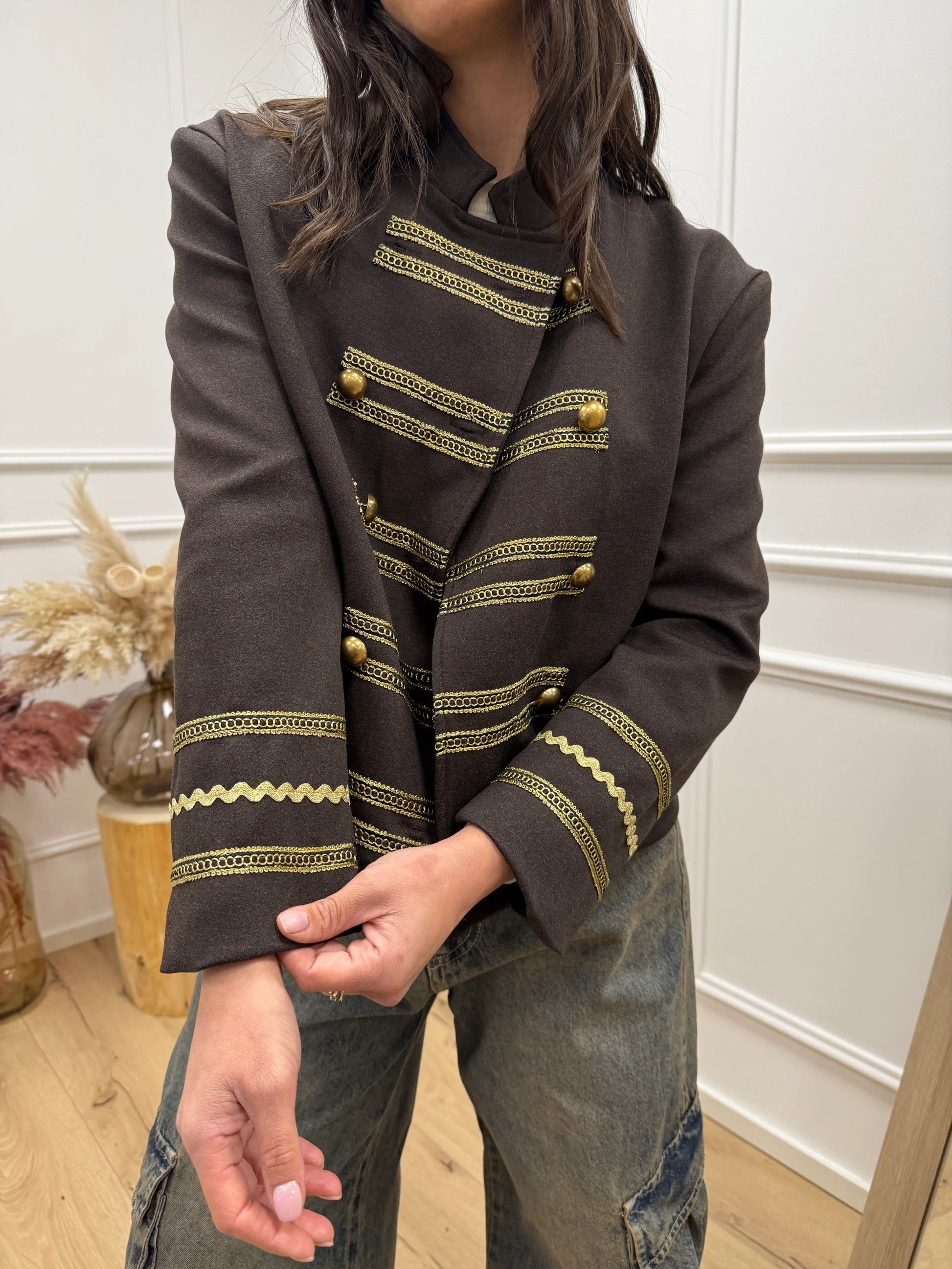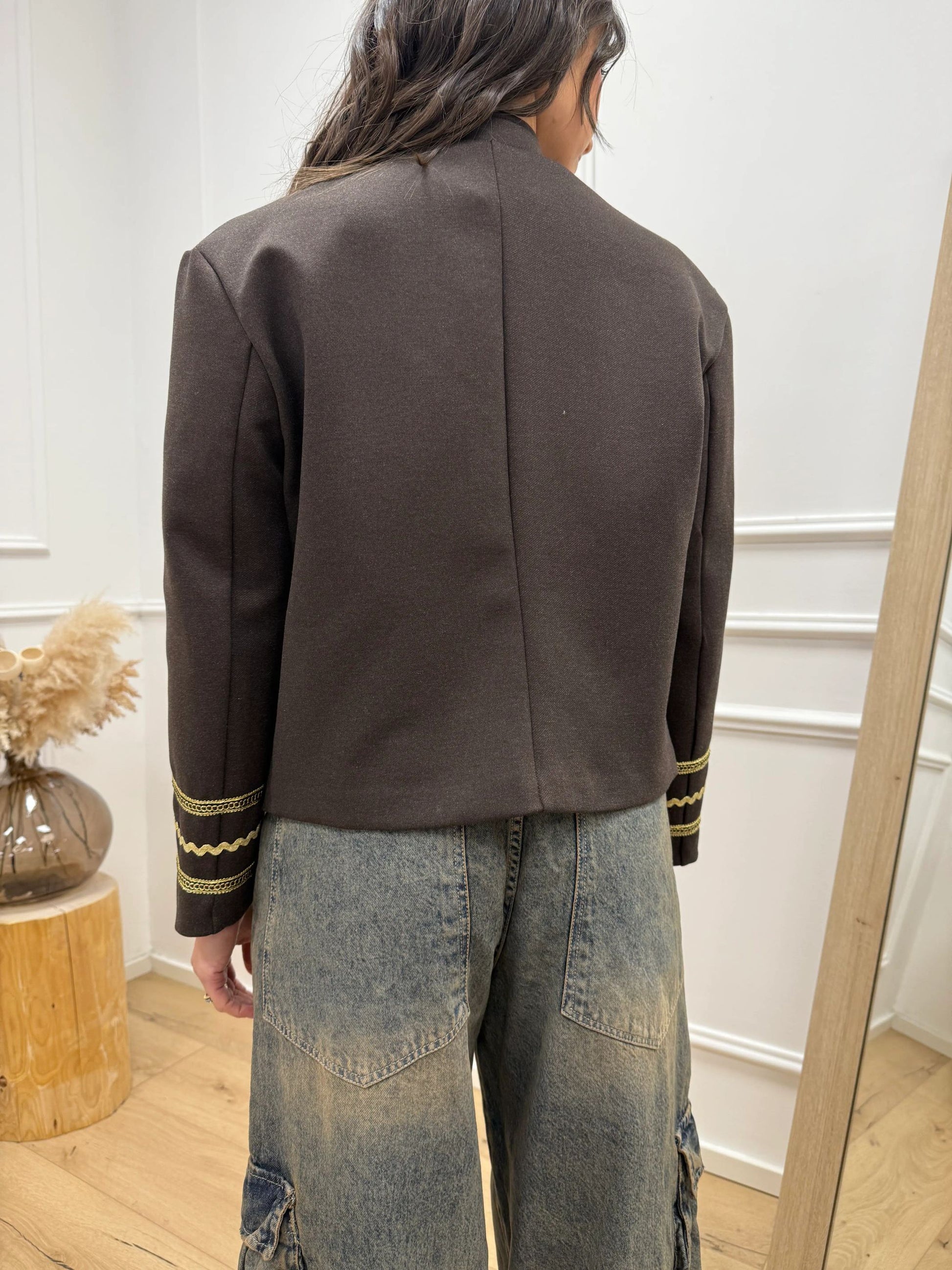 Giacca Napoleone color moro HaveOne. Modello girocollo, chiusura frontale con bottoni dorati. Dettaglio di ricami dorati e tasche a filetto.