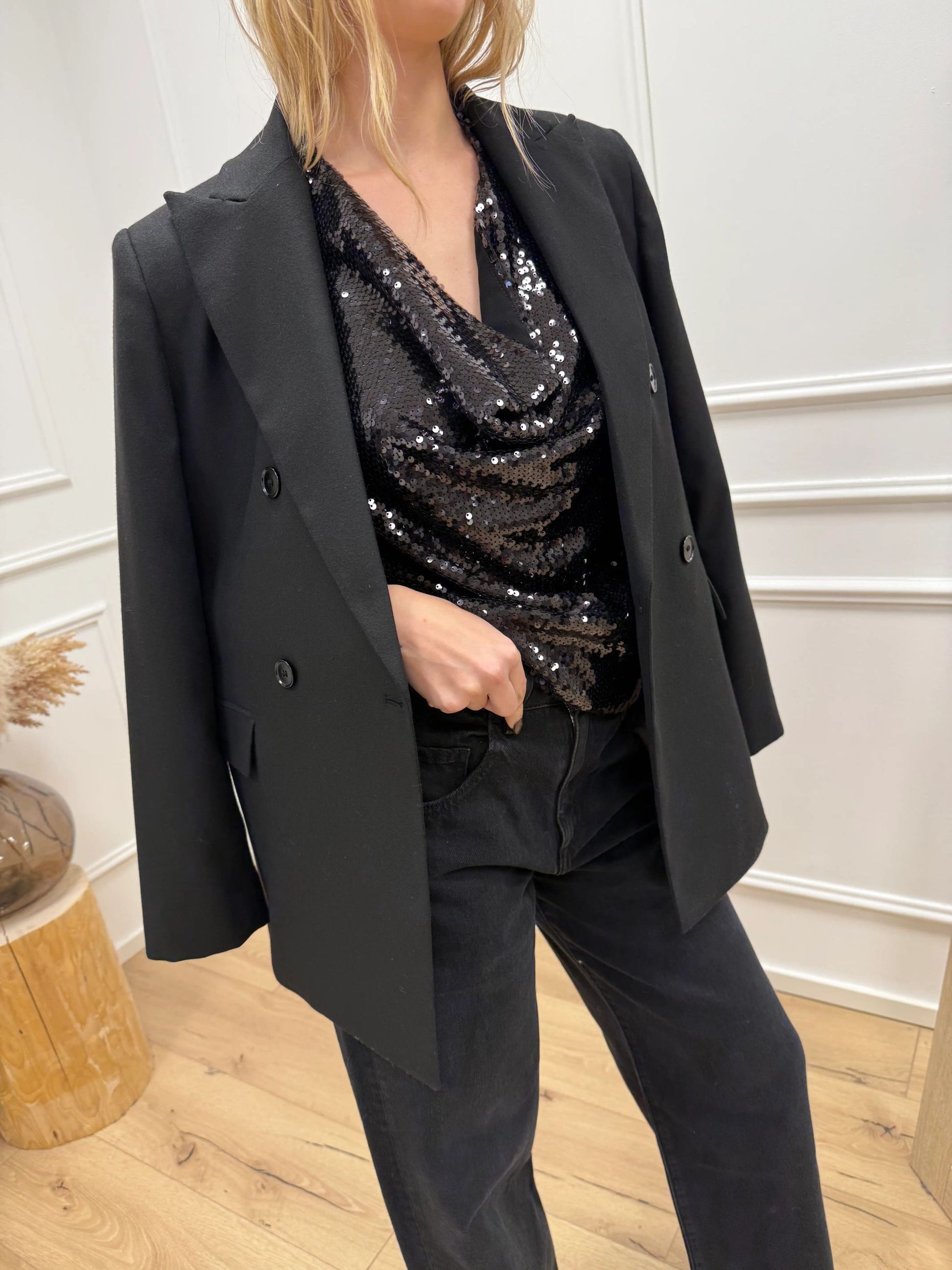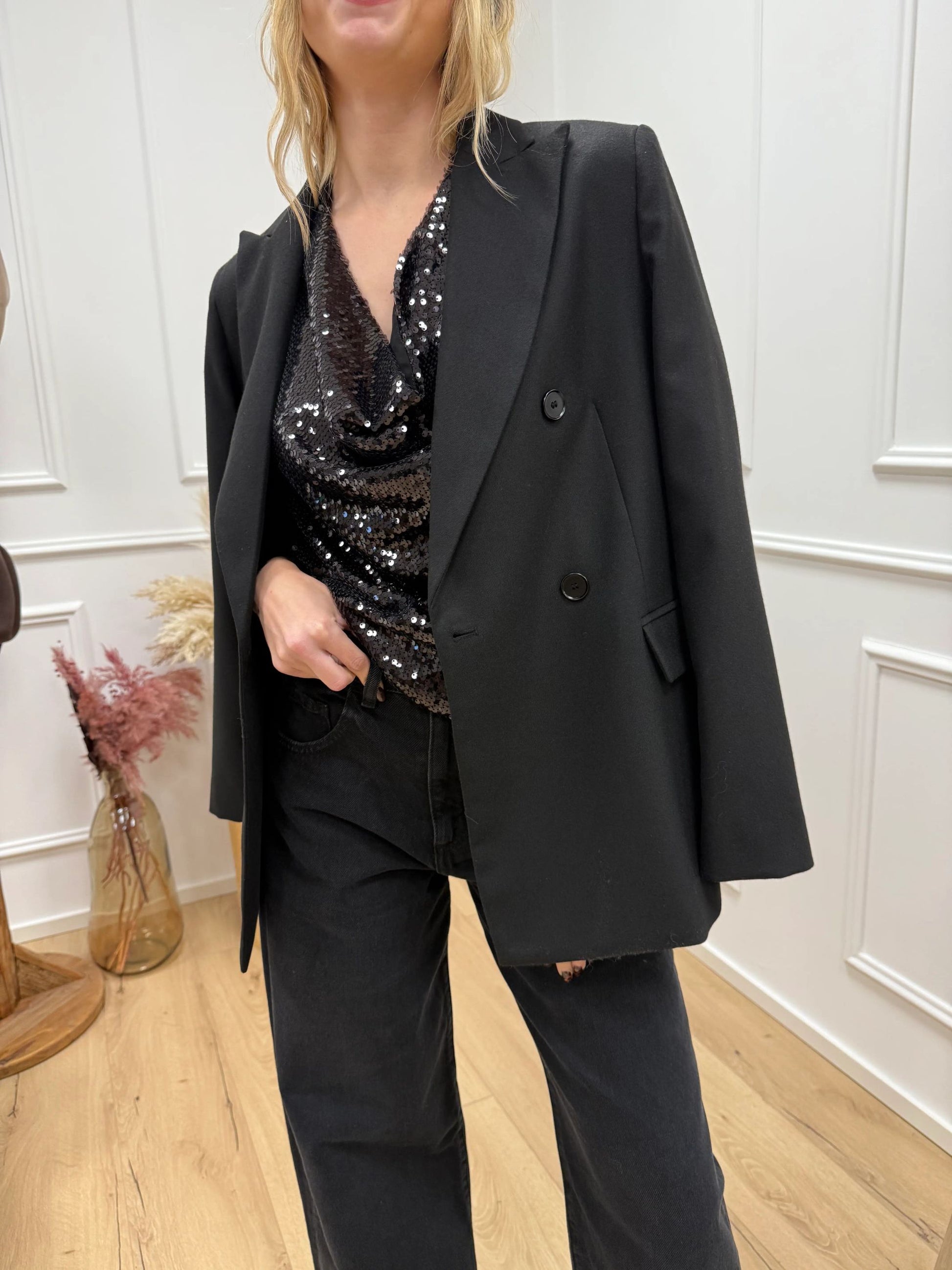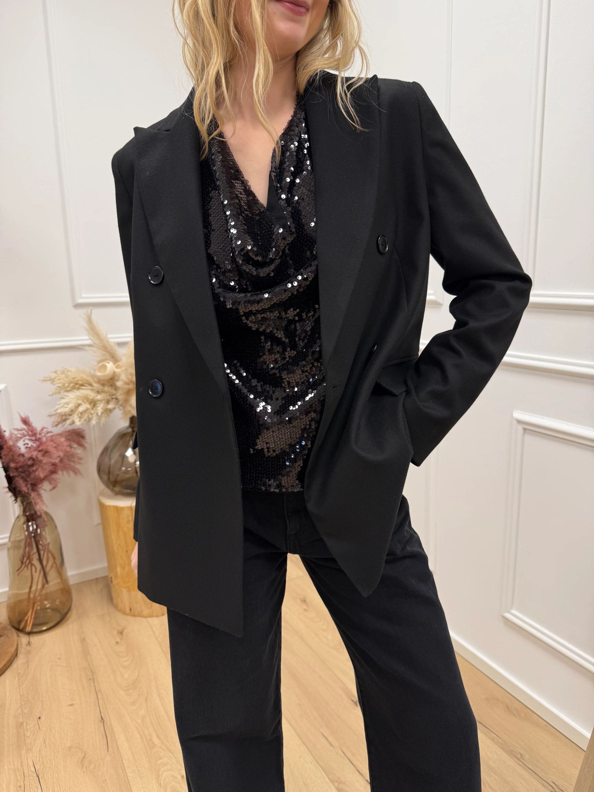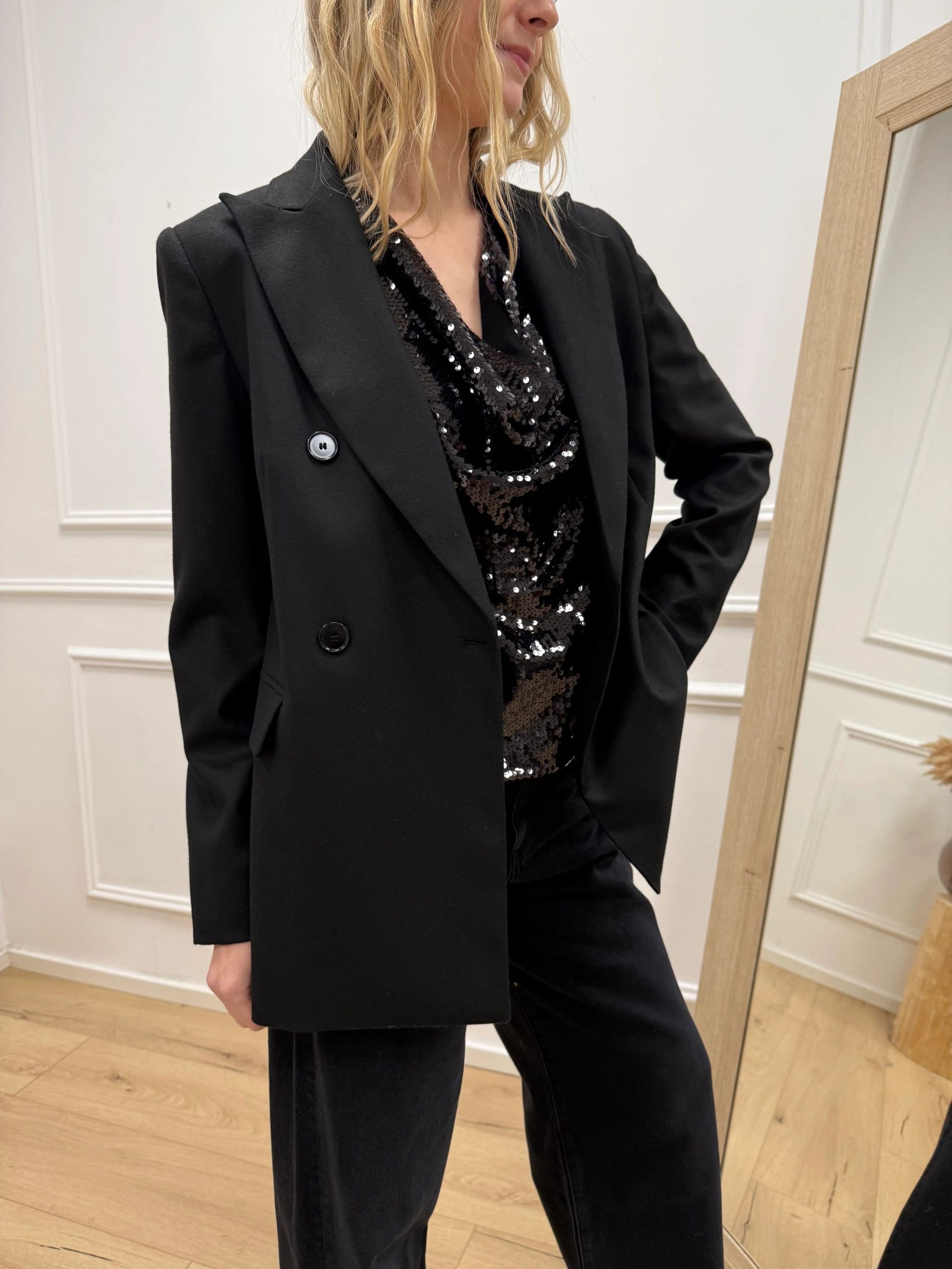 Giacca color nero Kontatto. Modello basic con chiusura doppiopetto, collo revers e tasche con patta frontali.