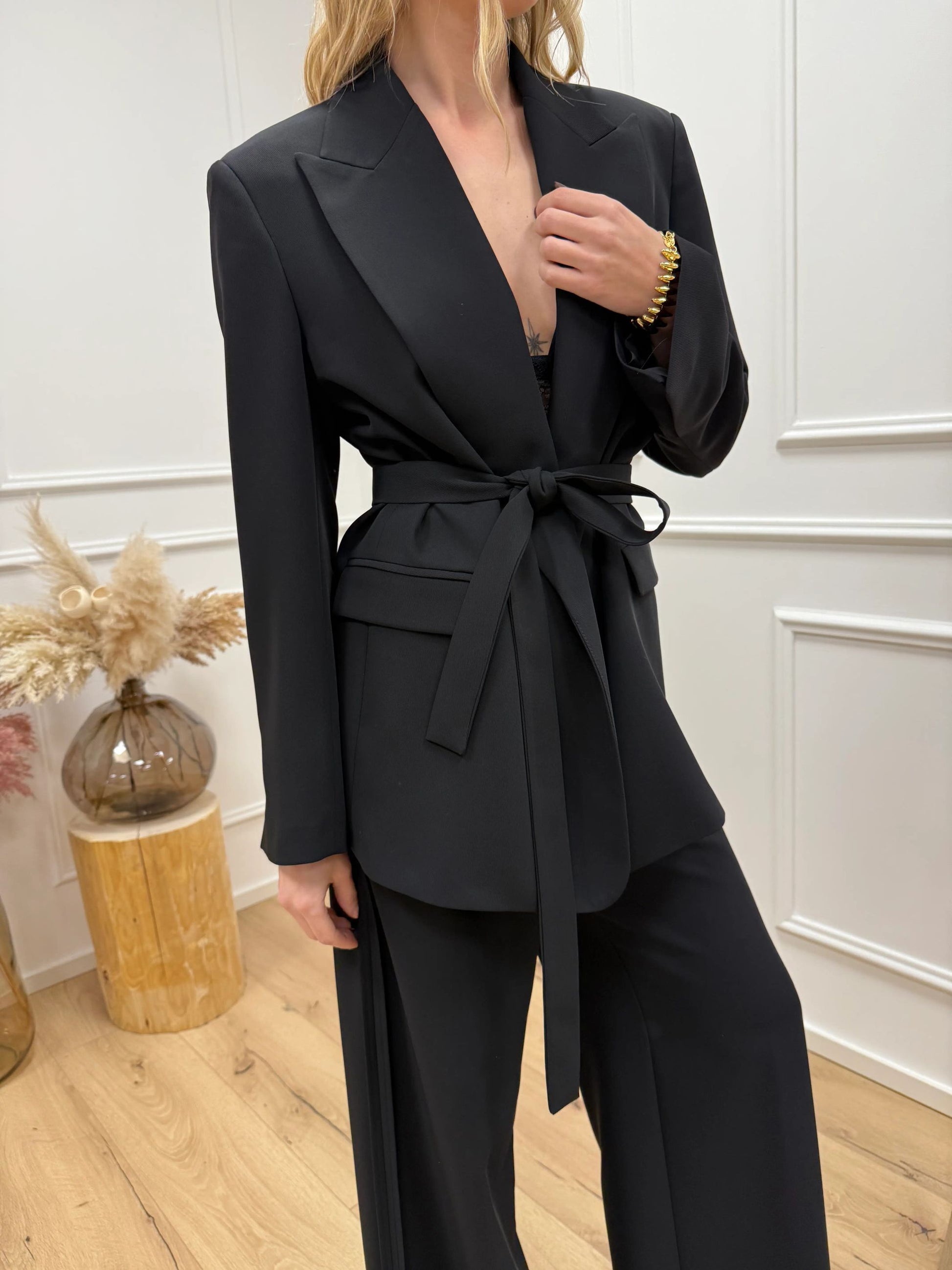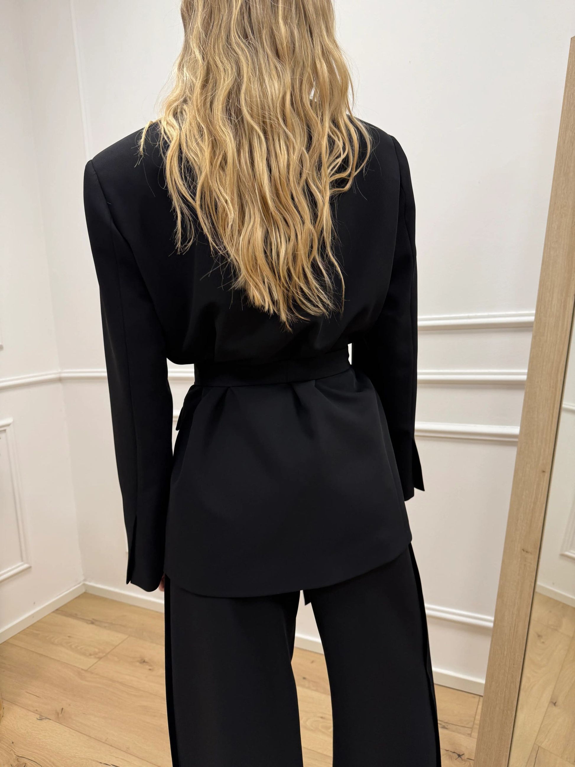Giacca color nero sartoriale Vicolo. Modello collo revers senza chiusura con dettaglio di fusciacca da annodare in vita. Tasche con patta.