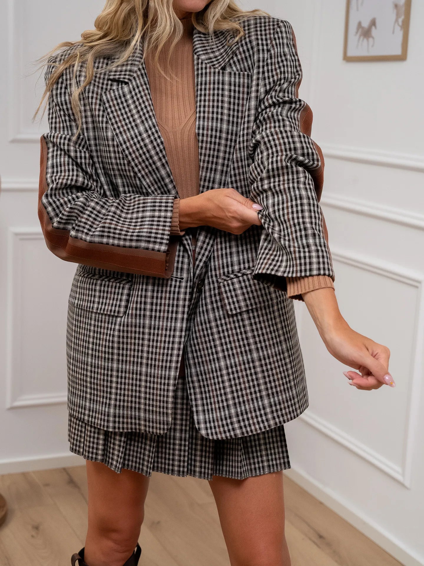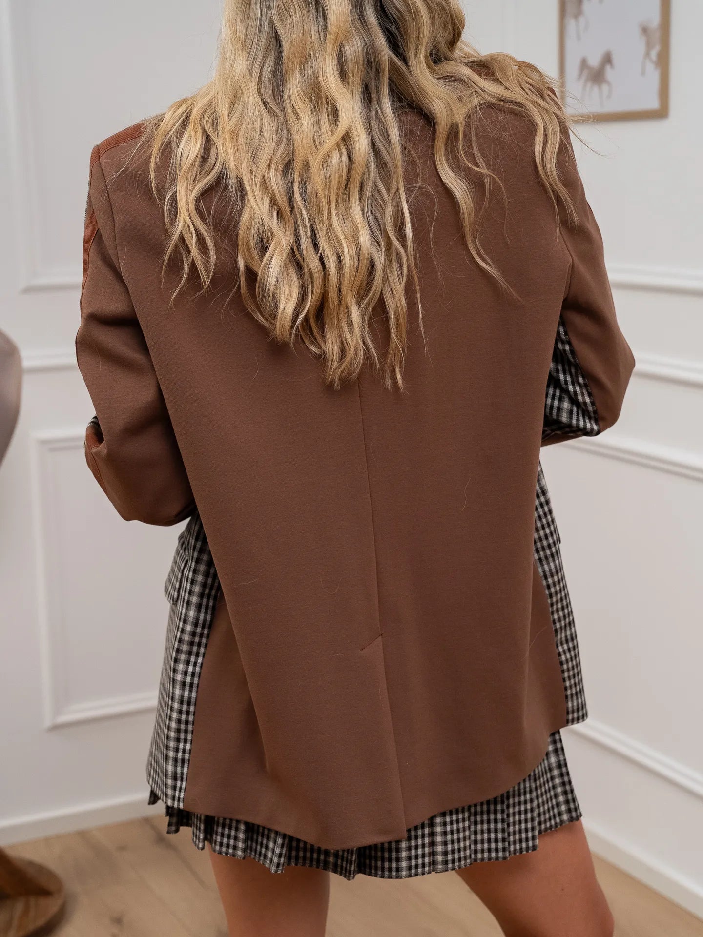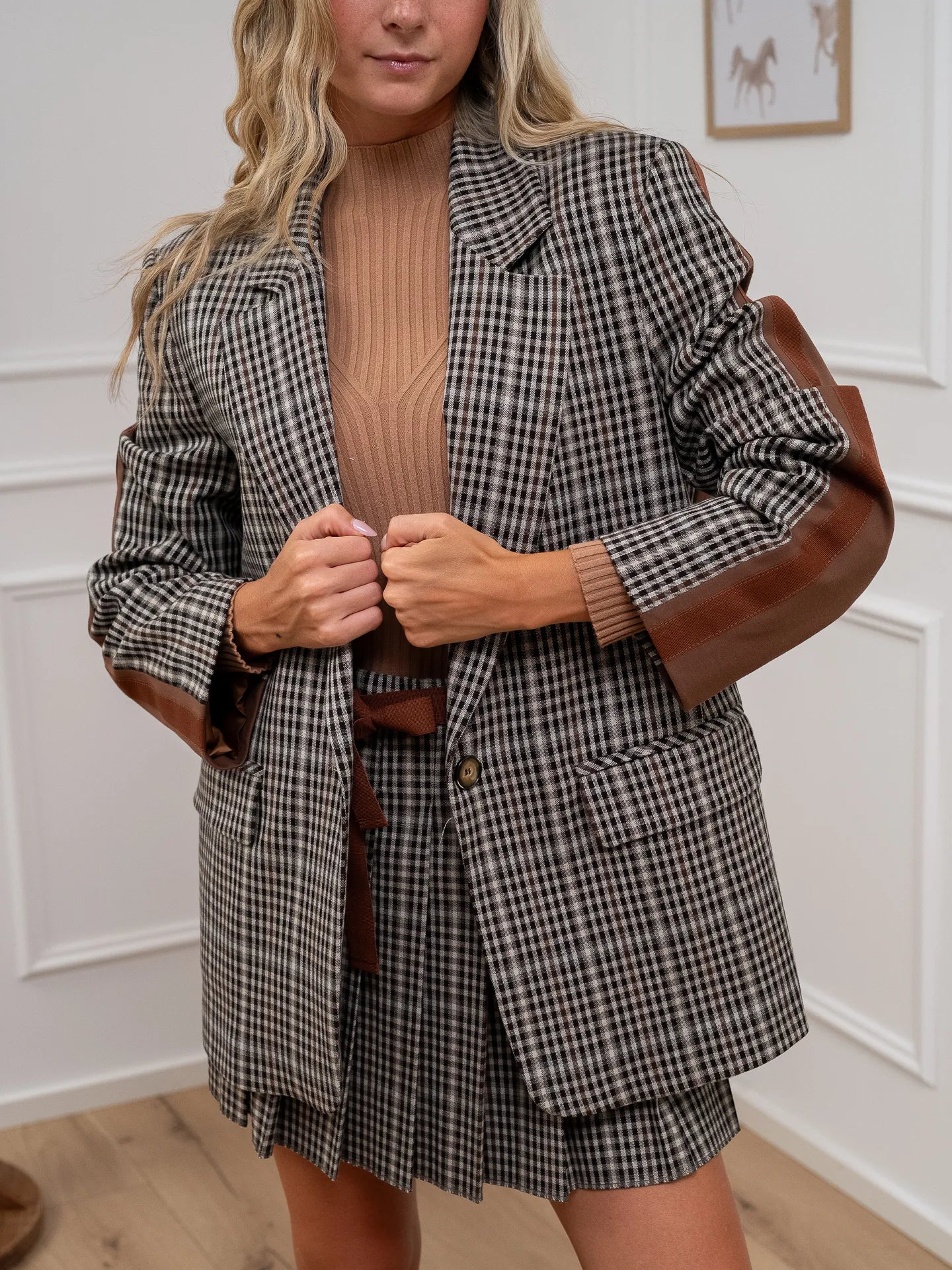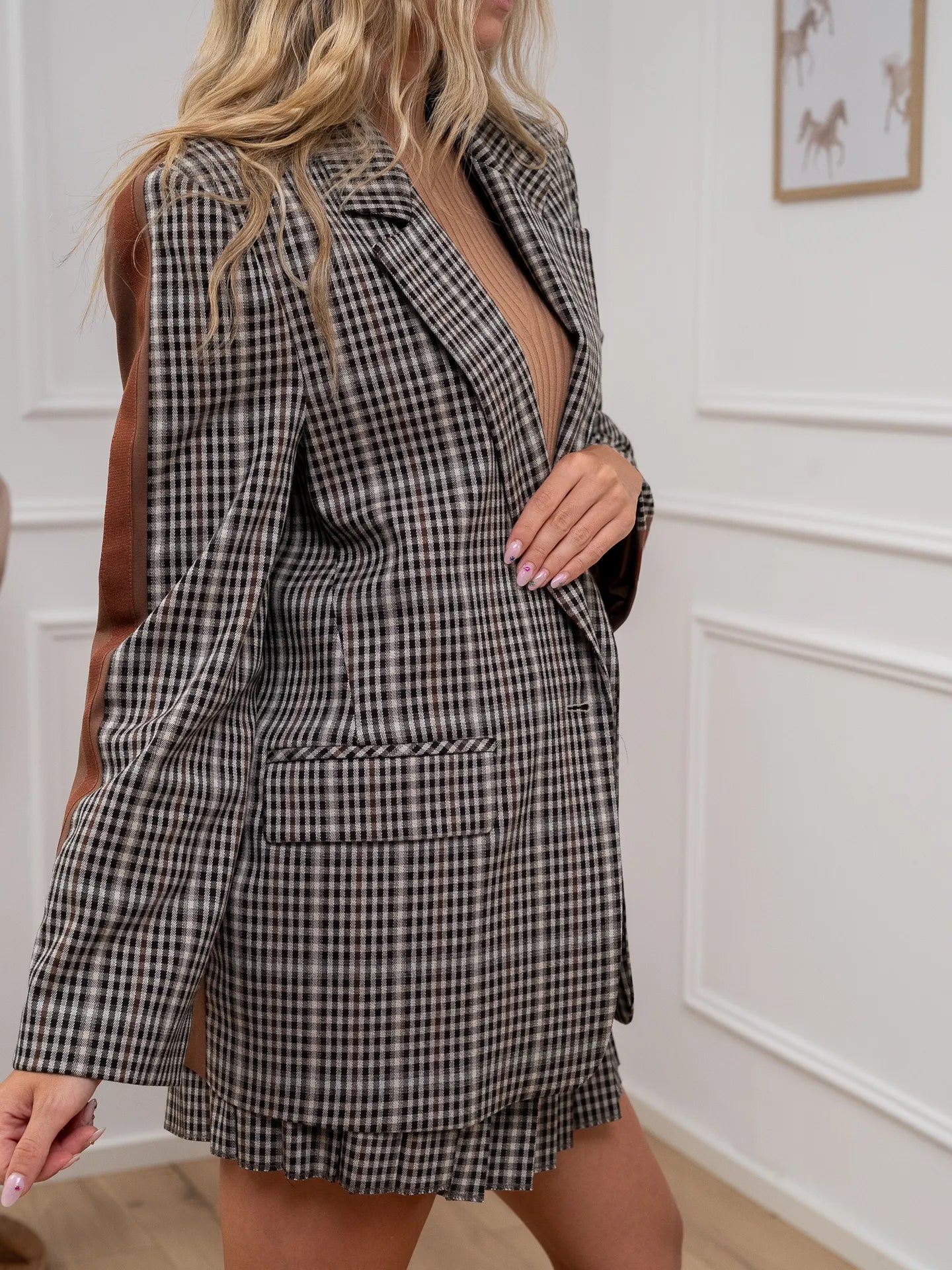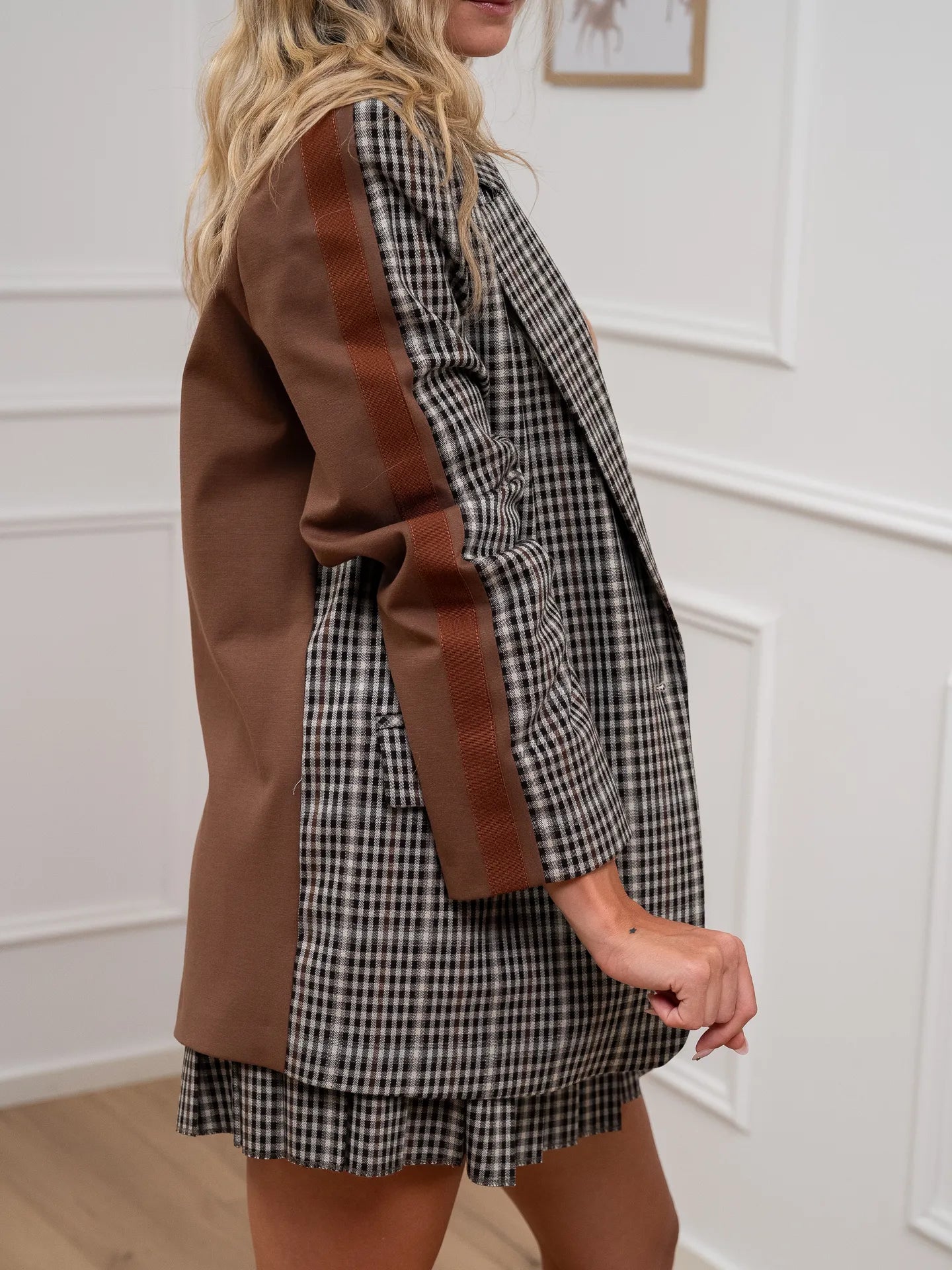Giacca fantasia quadri nero e cioccolato Kontatto. Modello fit oversize con chiusura monopetto frontale. Retro in tinta unica con spacco sul fondo e manica lunghe con dettaglio di bande patch.