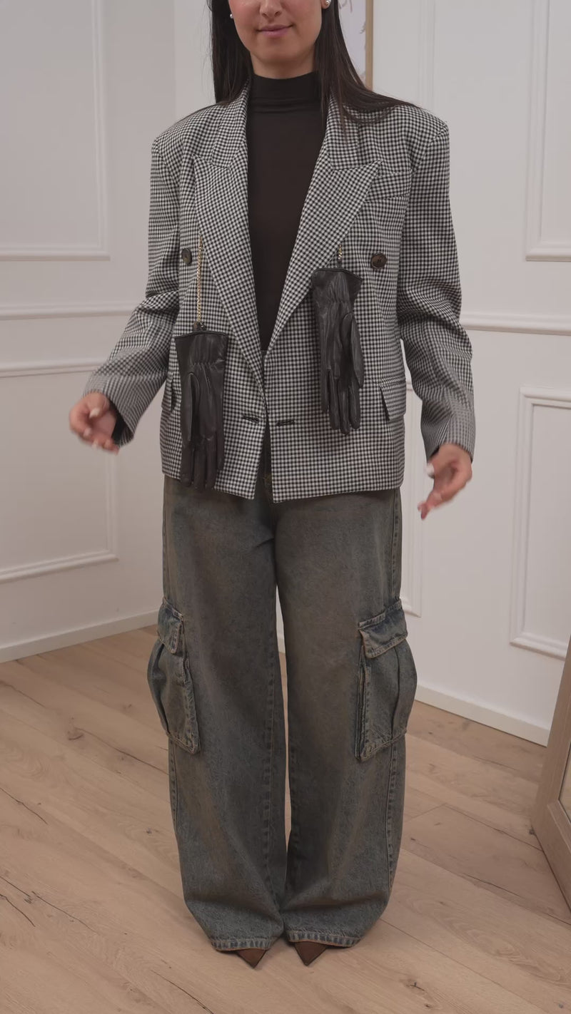 Giacca pied de poule sui toni del moro Tensione In. Modello fit corto collo revers e chiusura doppiopetto a sei bottoni. Spacchetti laterali sul retro e dettaglio di guanti in ecopelle con catena dorata. Tasche con patta.