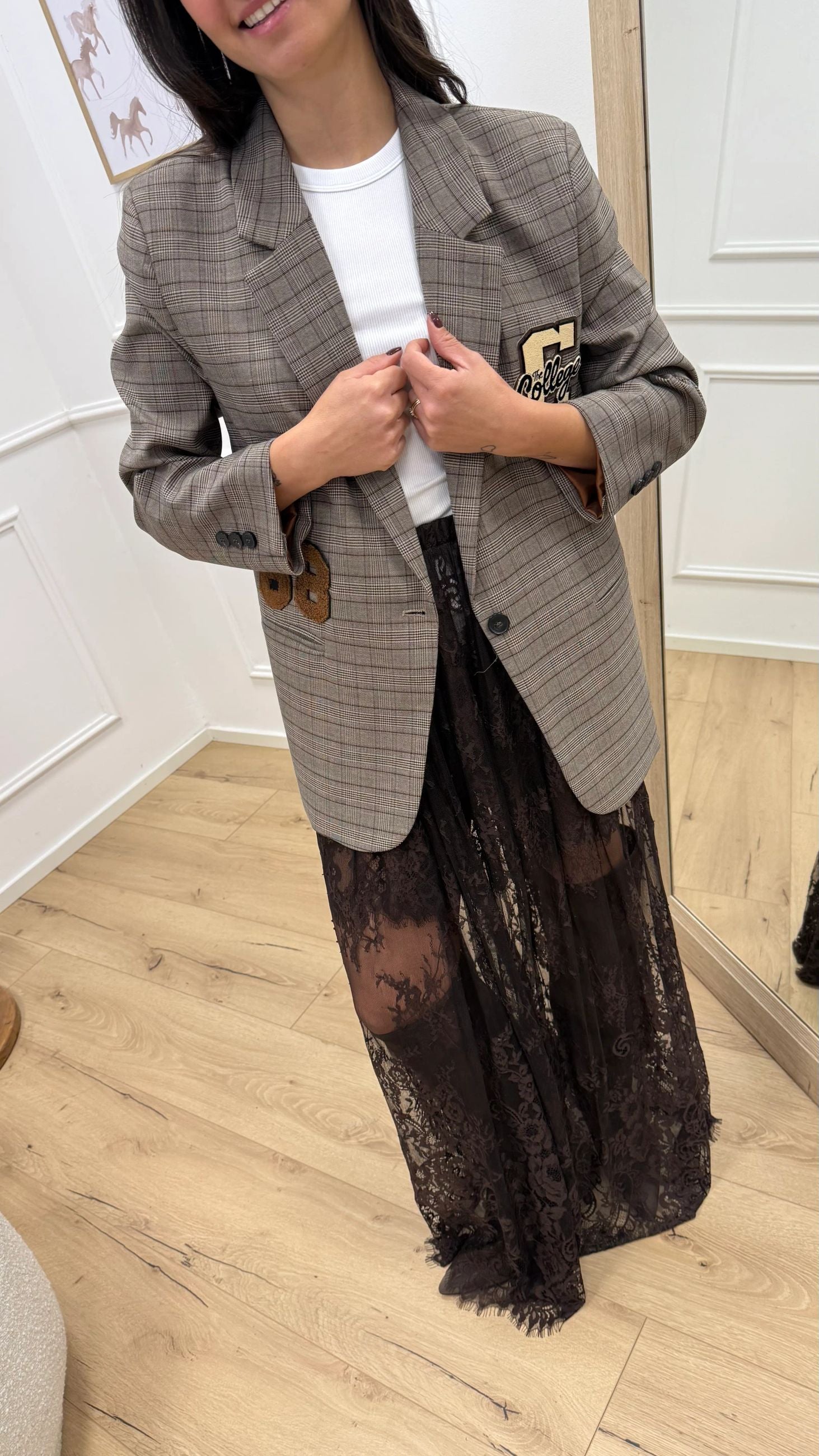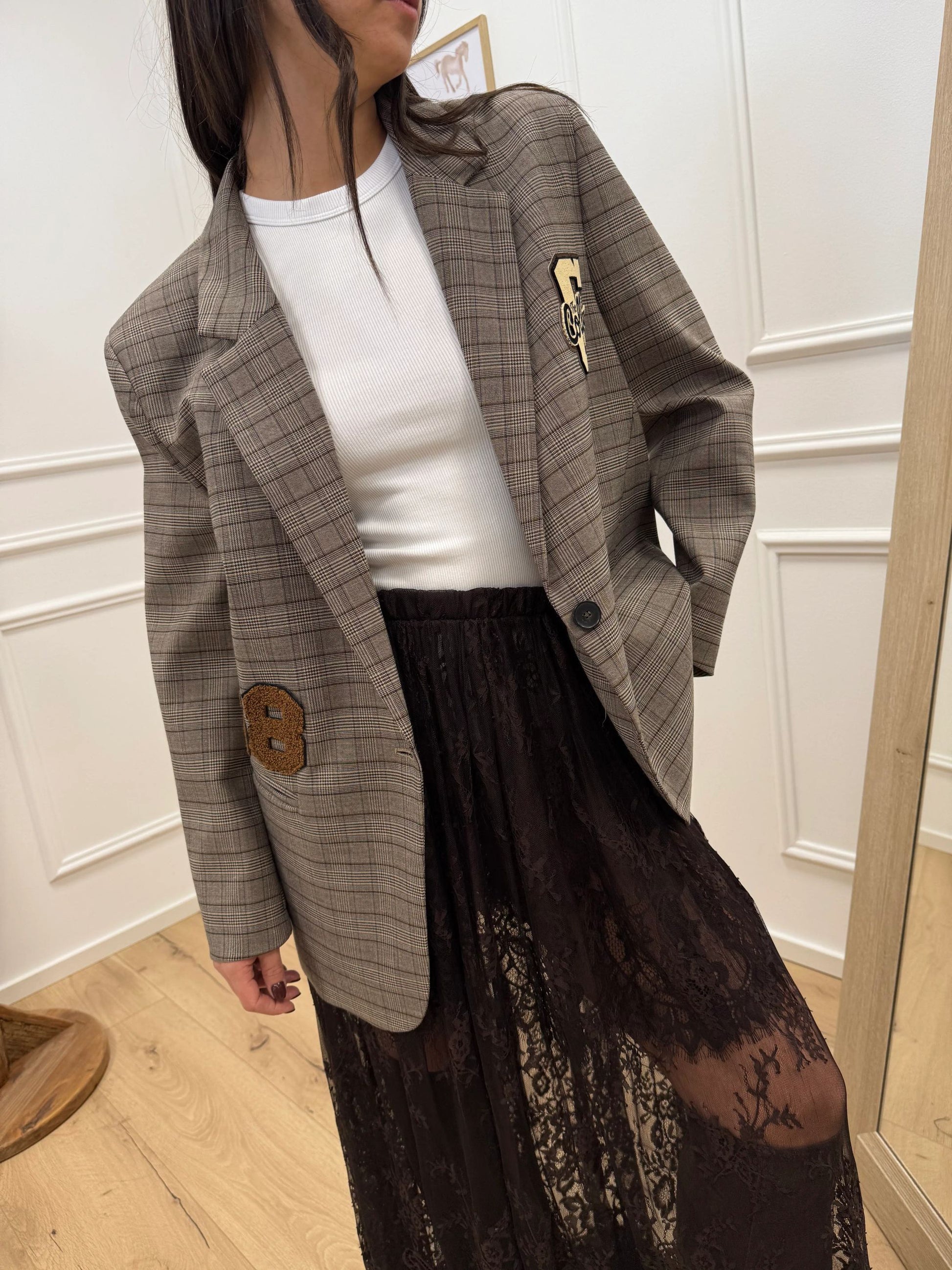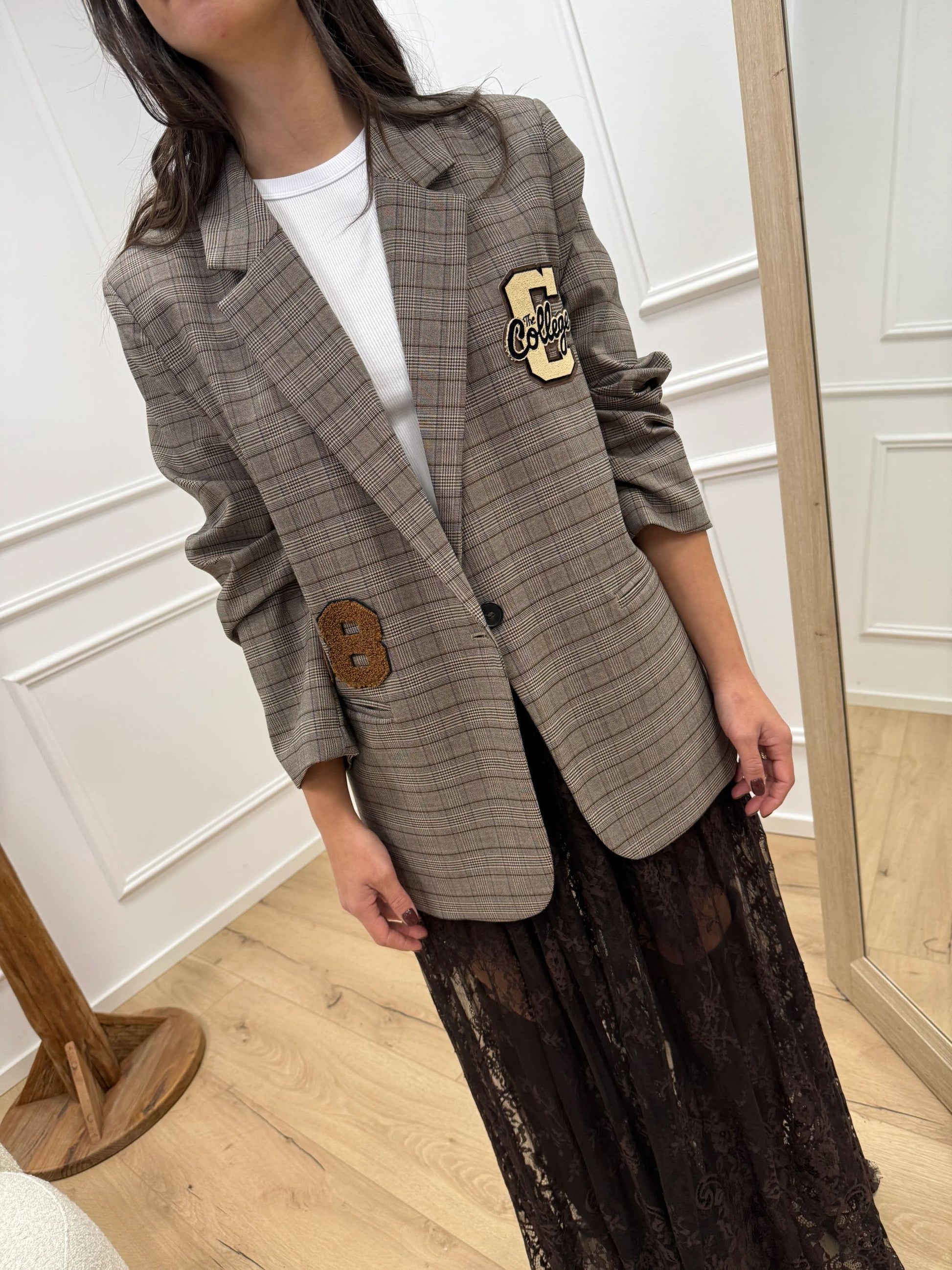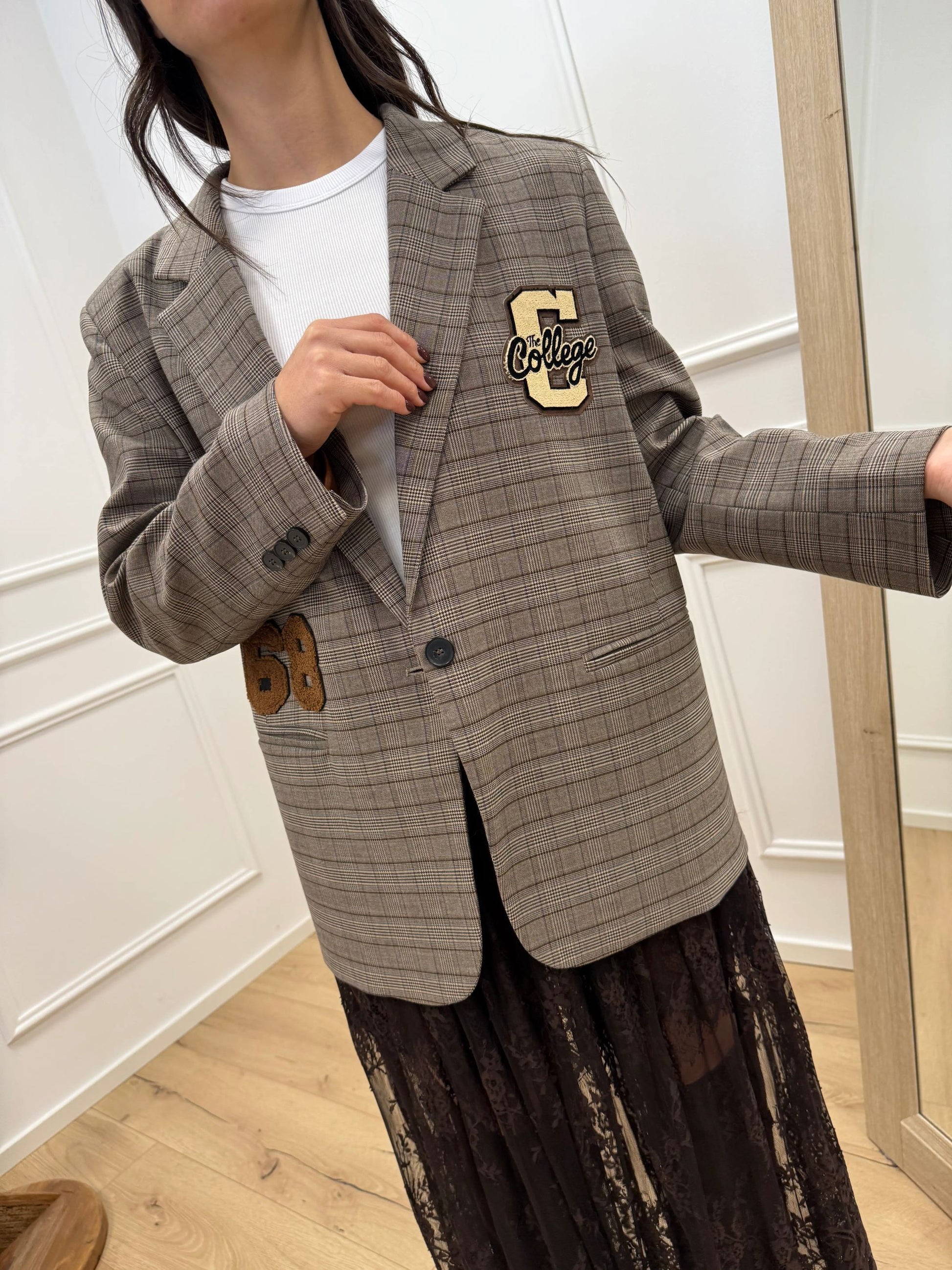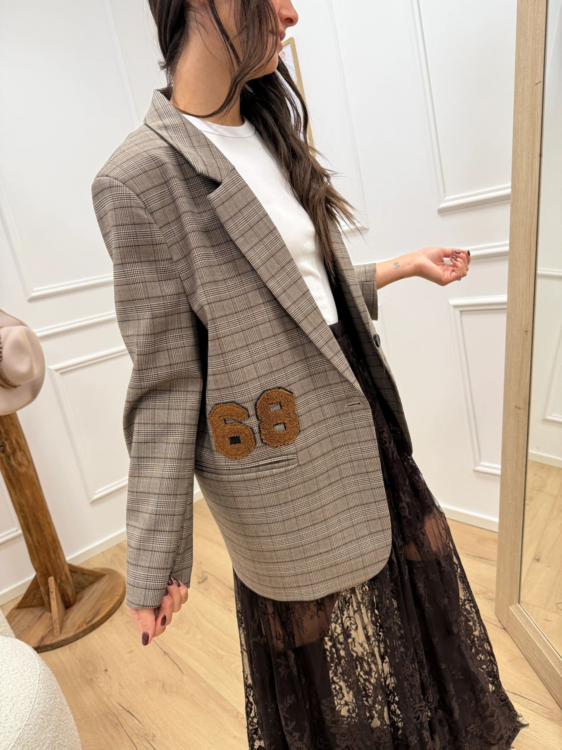 Giacca principe di galles Vicolo. Modello fit oversize con collo revers e chiusura frontale monopetto. Dettaglio di patch frontali e sul retro teddy. Tasche a filetto laterali.