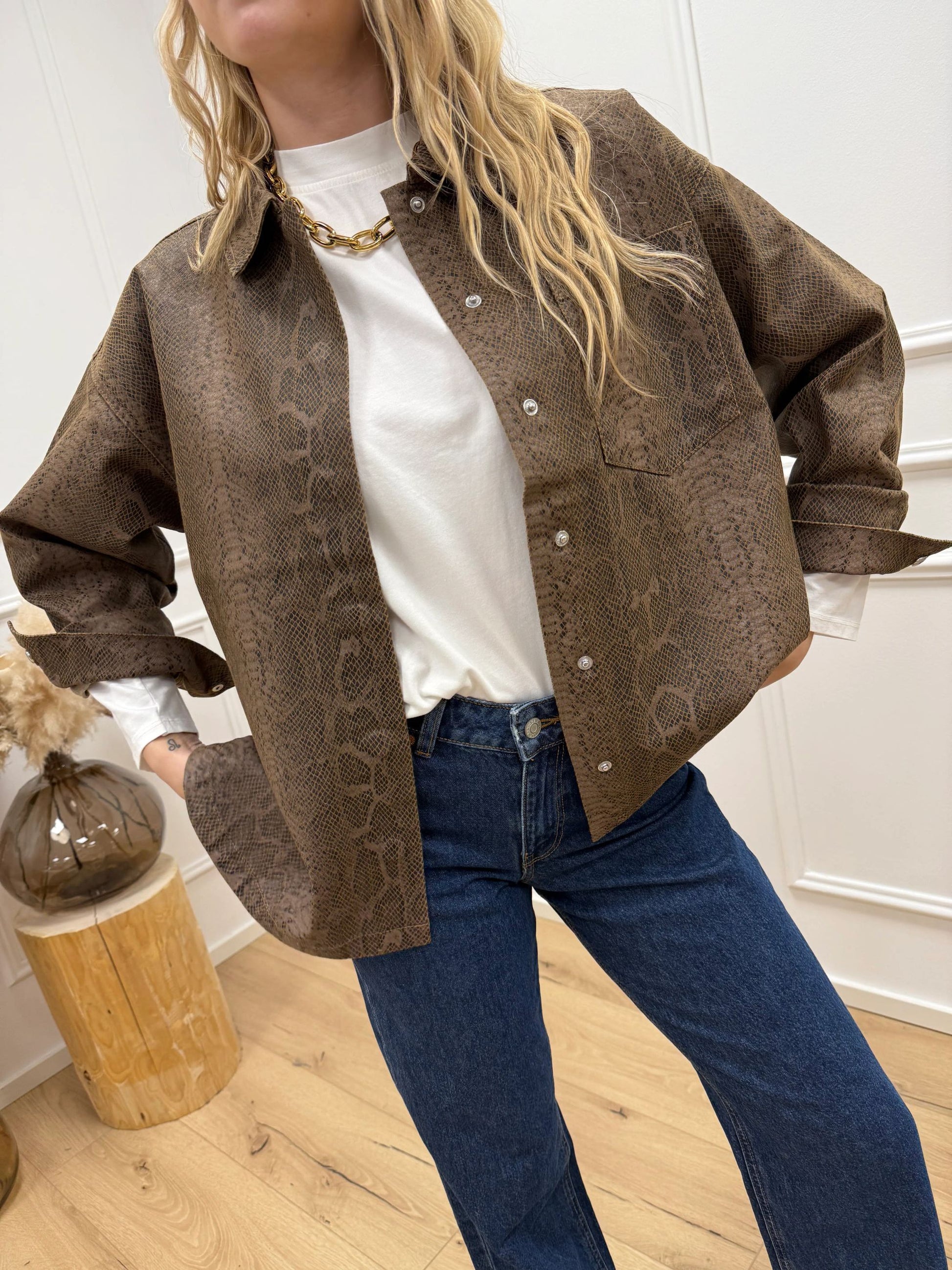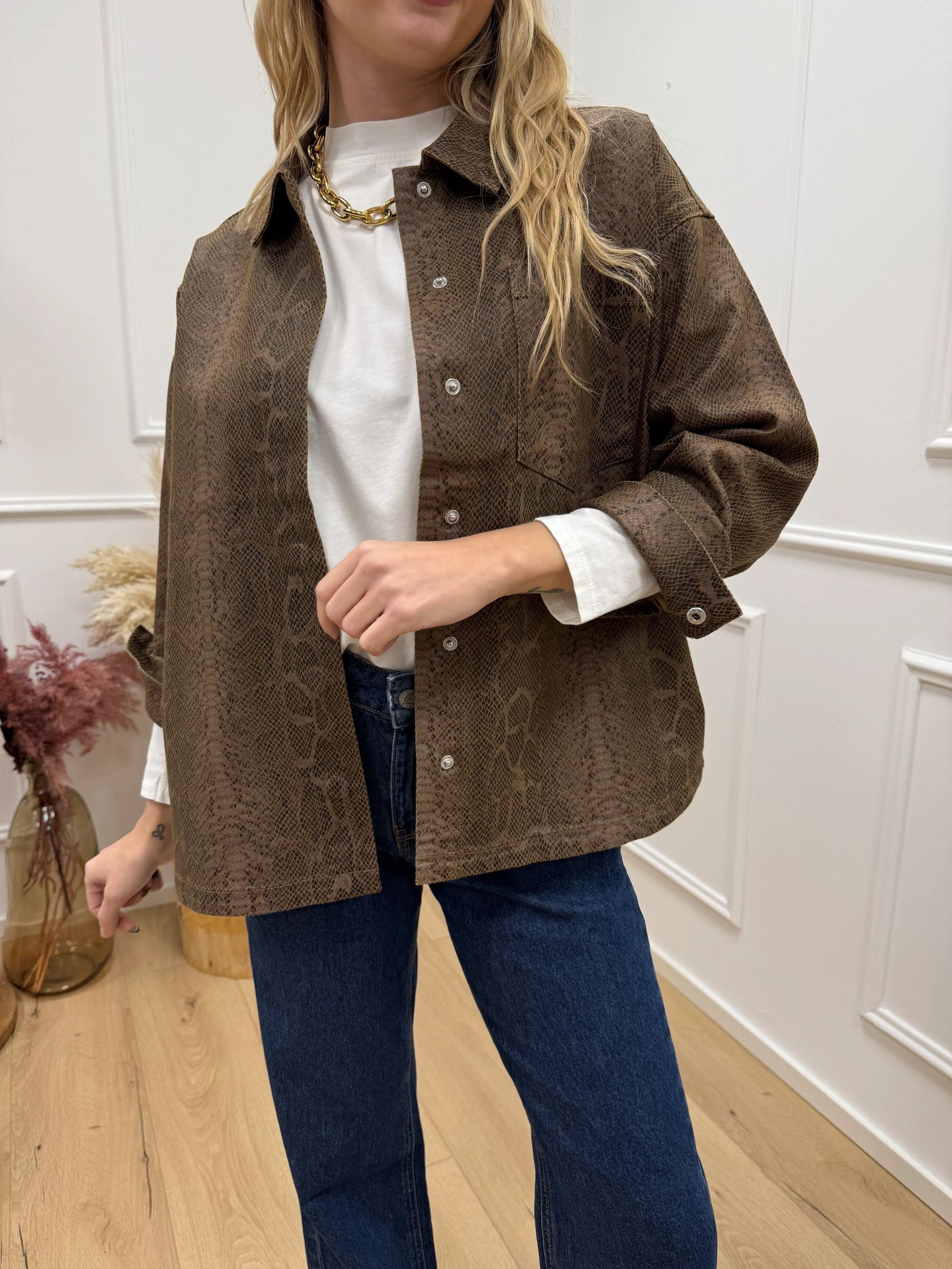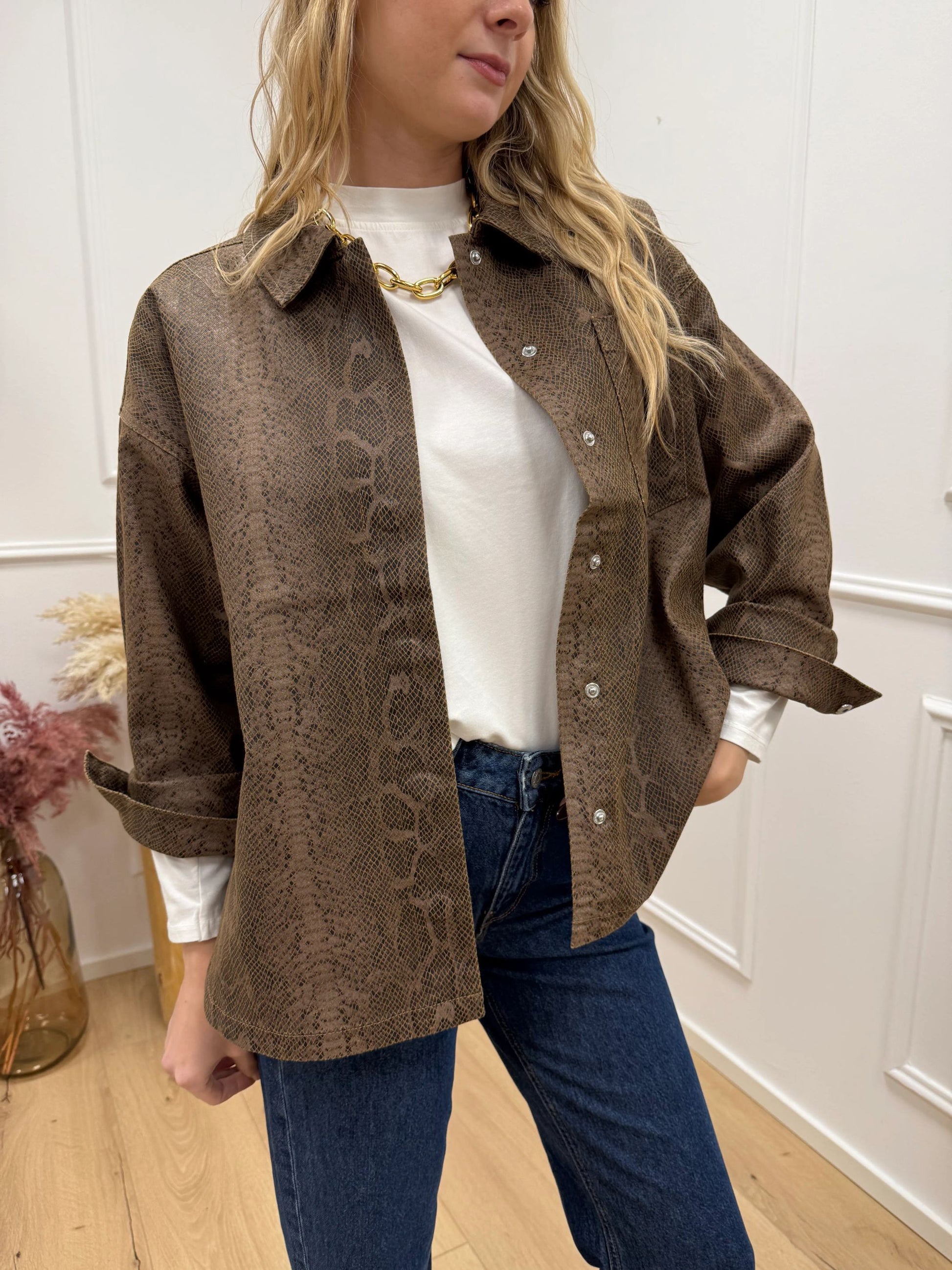 Giacca camicia snake sui toni del moro JJXX. Modello fit regolare morbido, colletto e chiusura frontale con bottoni. Tasche lato cuore. Maniche lunghe con polsino sul fondo.
