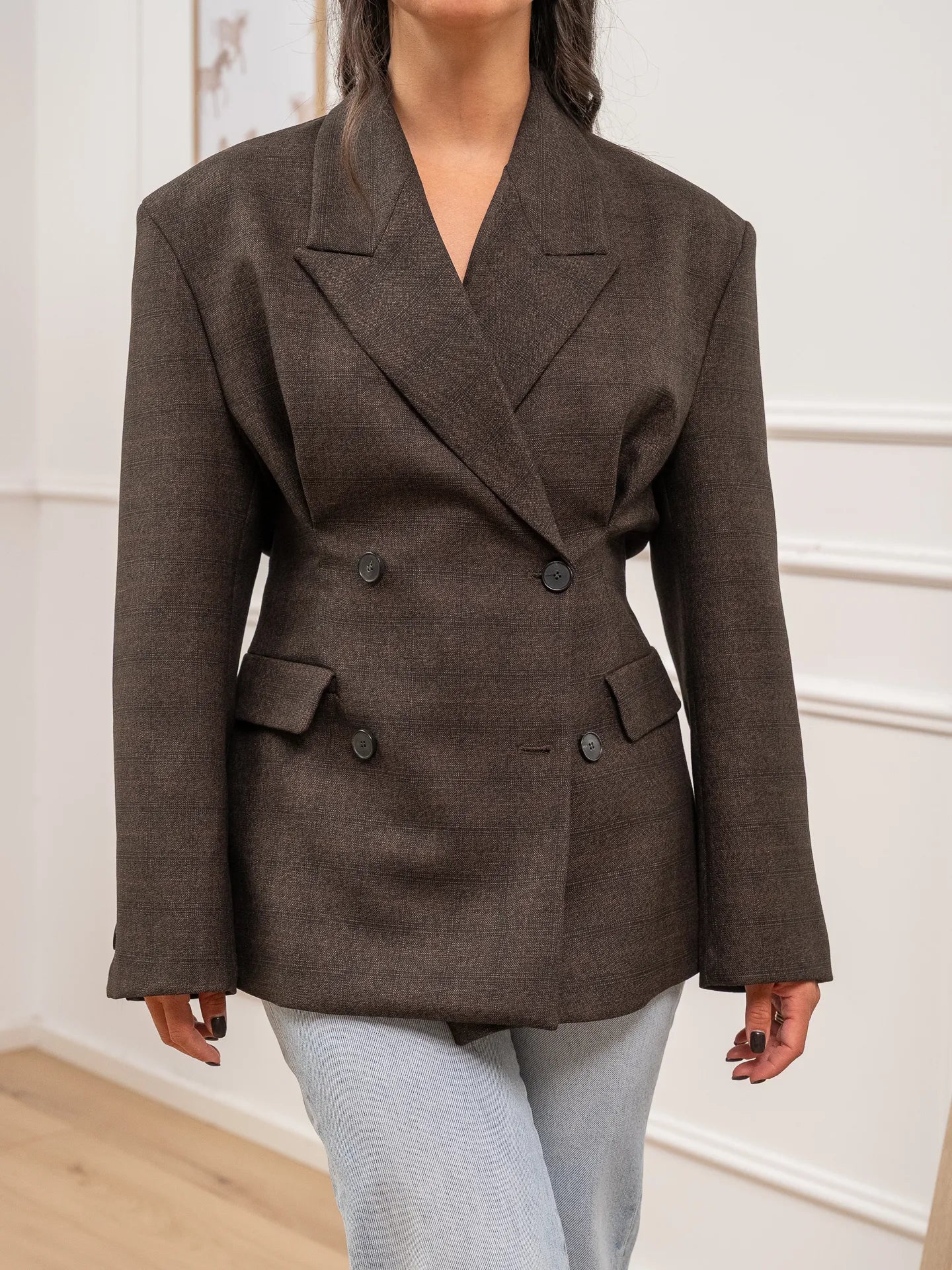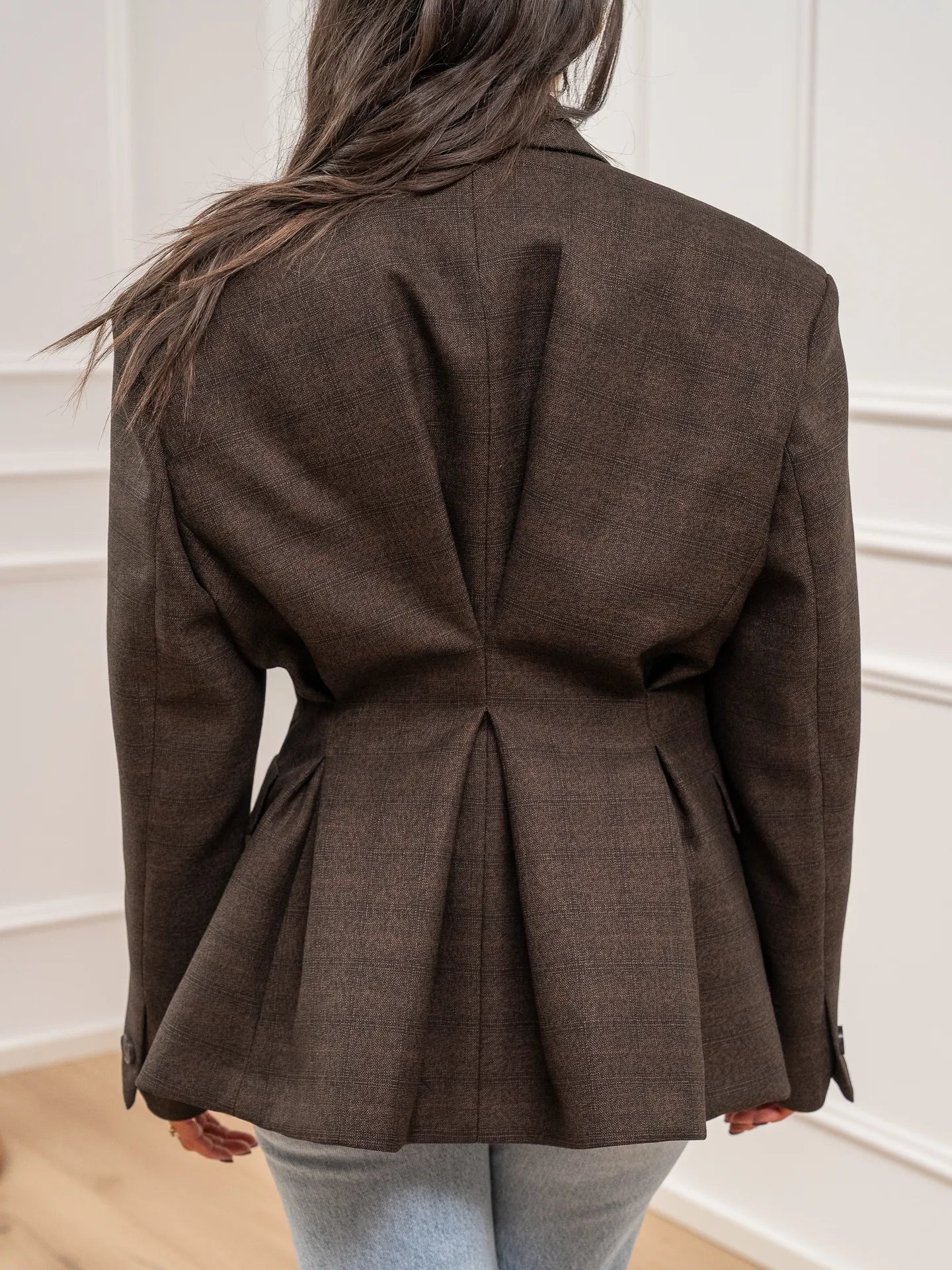 Giacca Valery fantasia sui toni del moro Vicolo. Modello sfiancata sul retro con chiusura doppiopetto frontale. Collo revers e maniche lunghe.