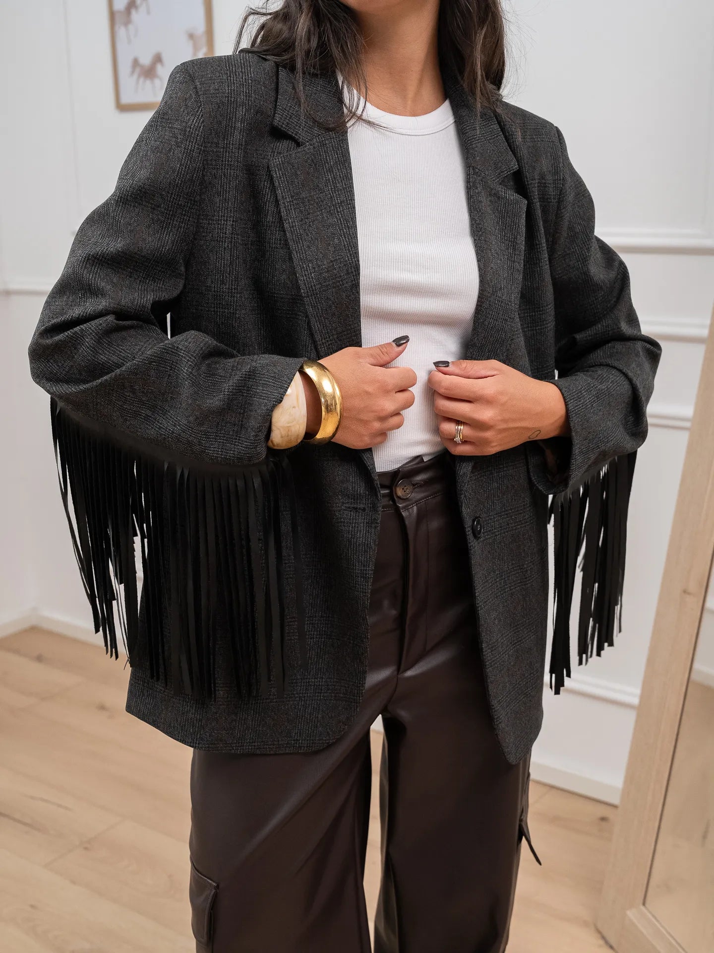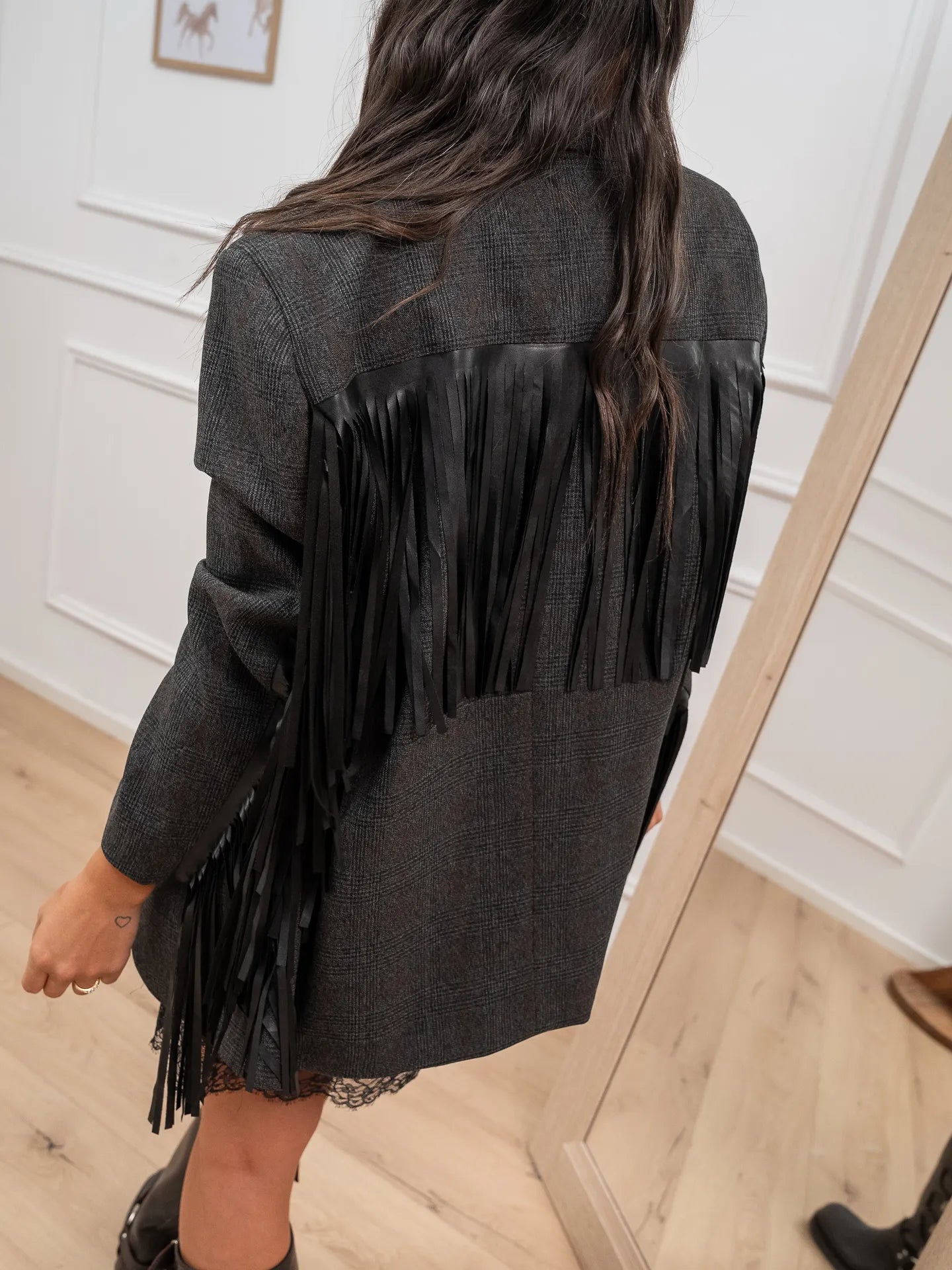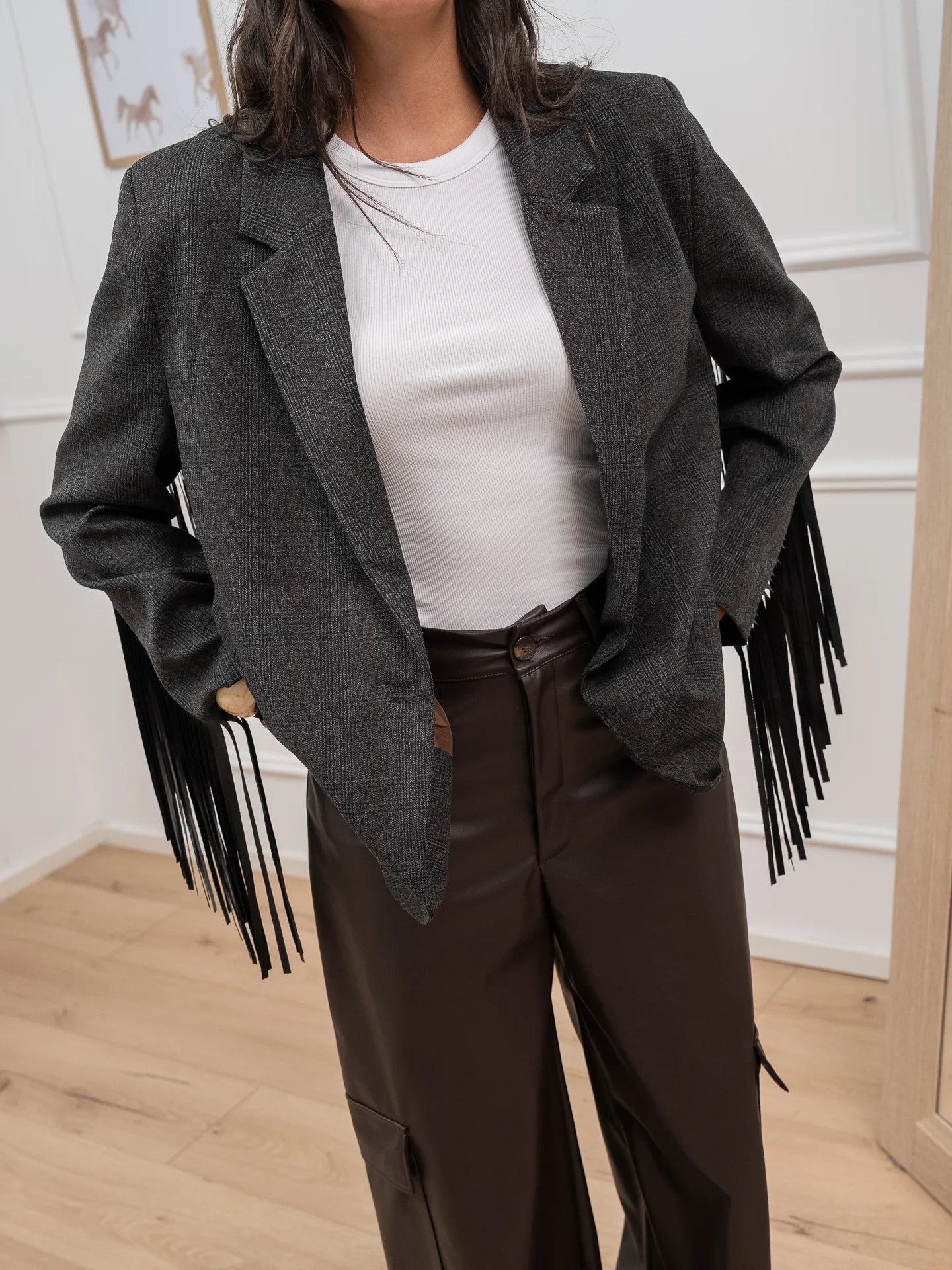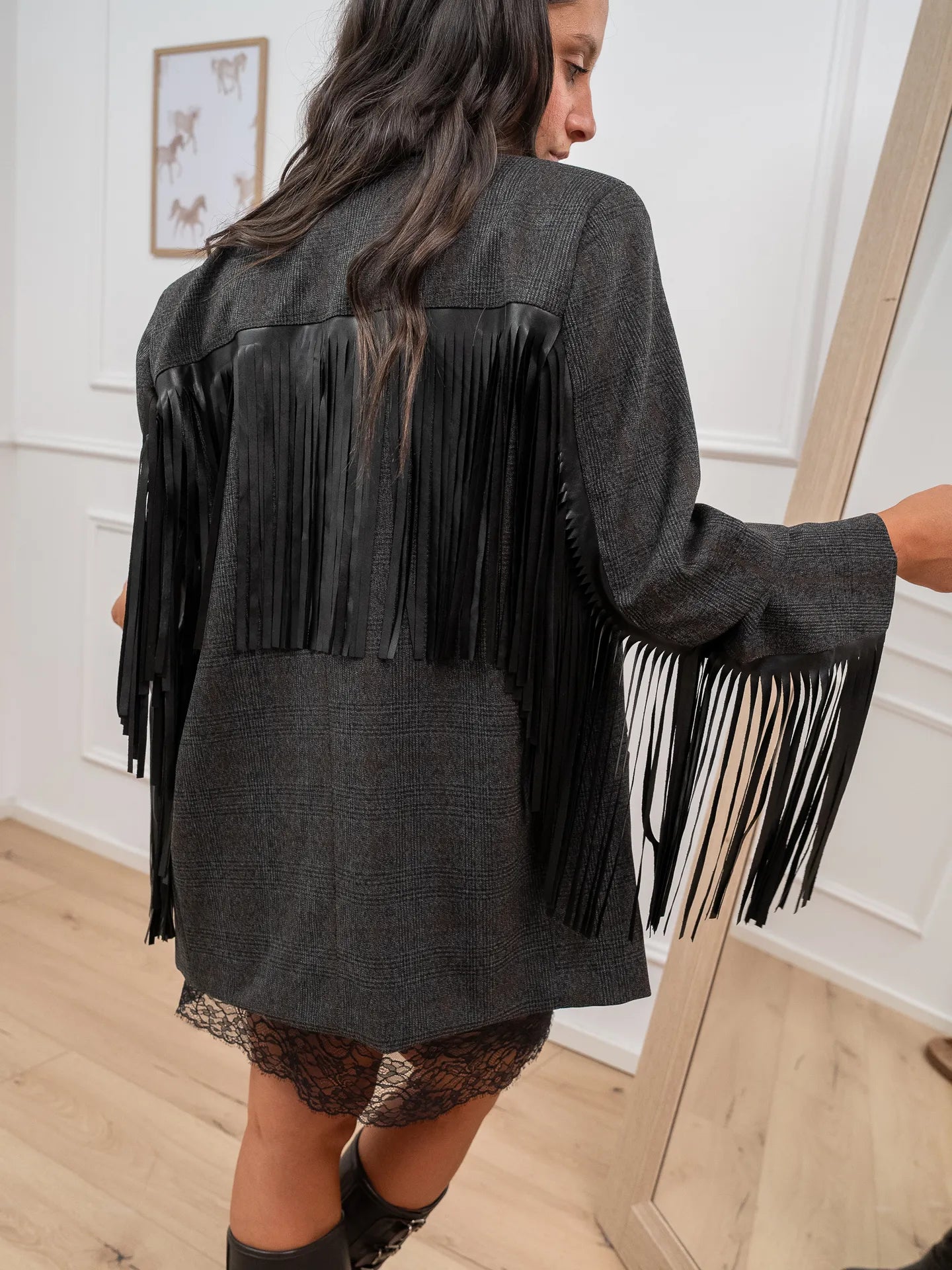 Giacca West fantasia check grigia scuro Vicolo. Modello chiusura frontale monopetto. Dettaglio di frange nere e tasche a filetto laterali.