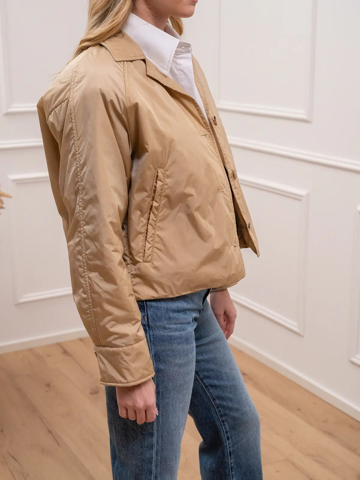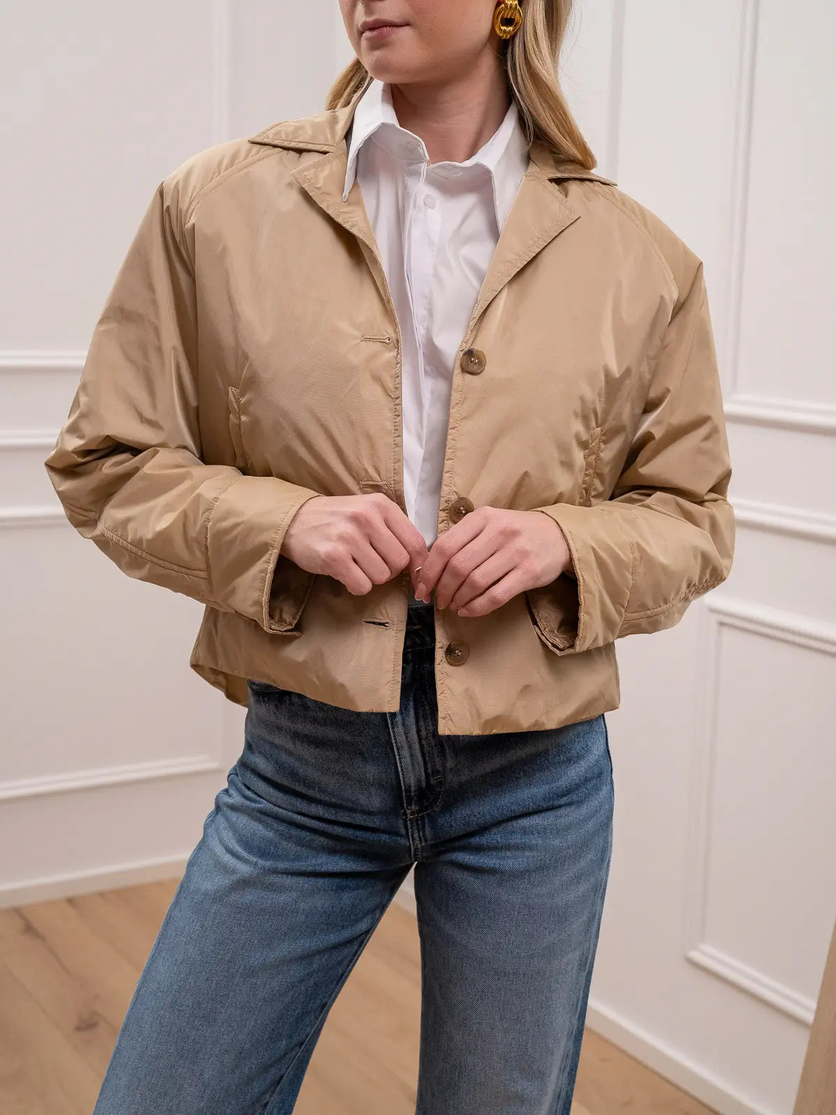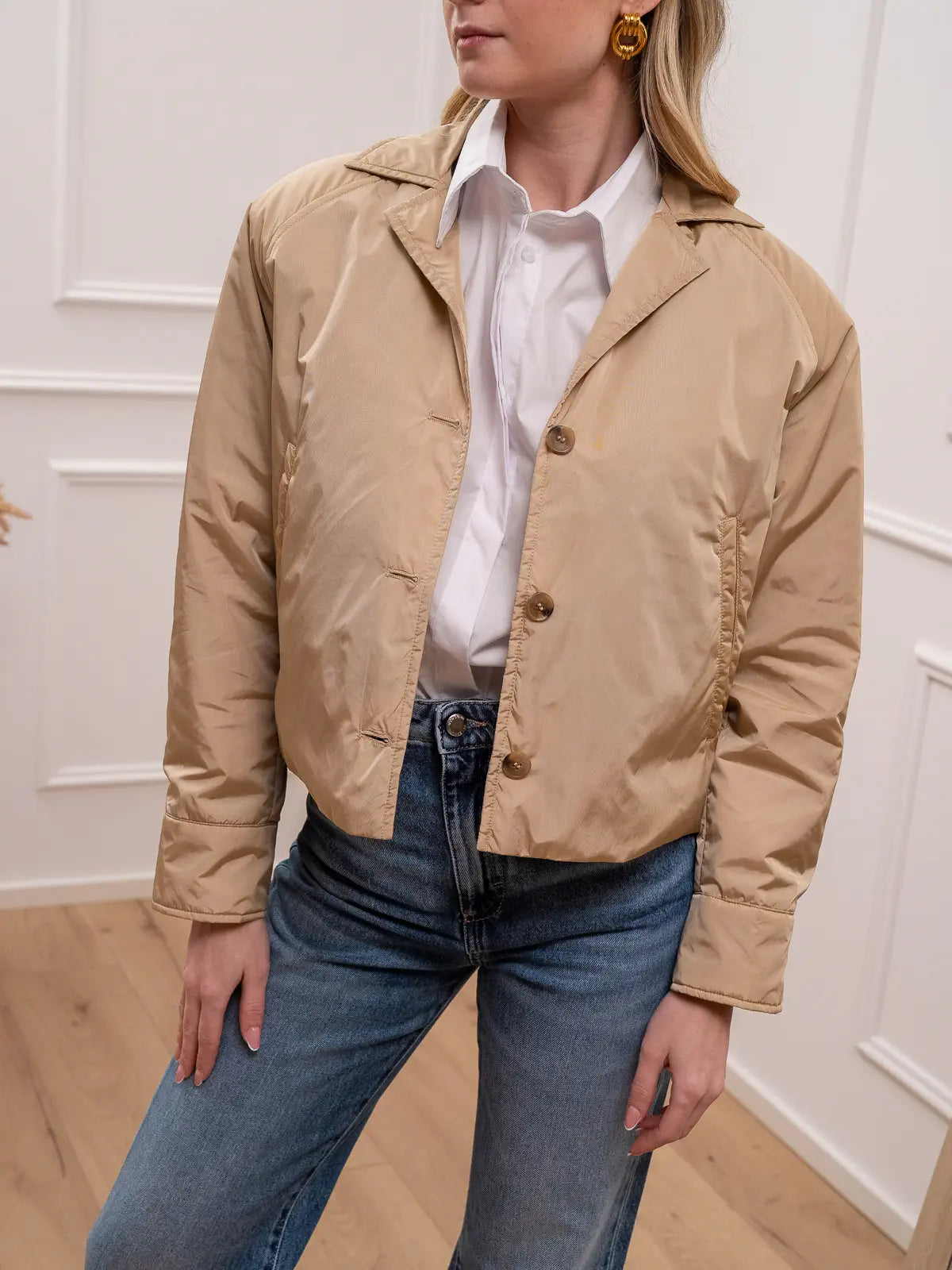 Giacchetto Sonora Aura 100 grammi color beige Vicolo. Modello impermeabile fit cropped con colletto e chiusura frontale con bottoncini. Tasche a filetto oblique.