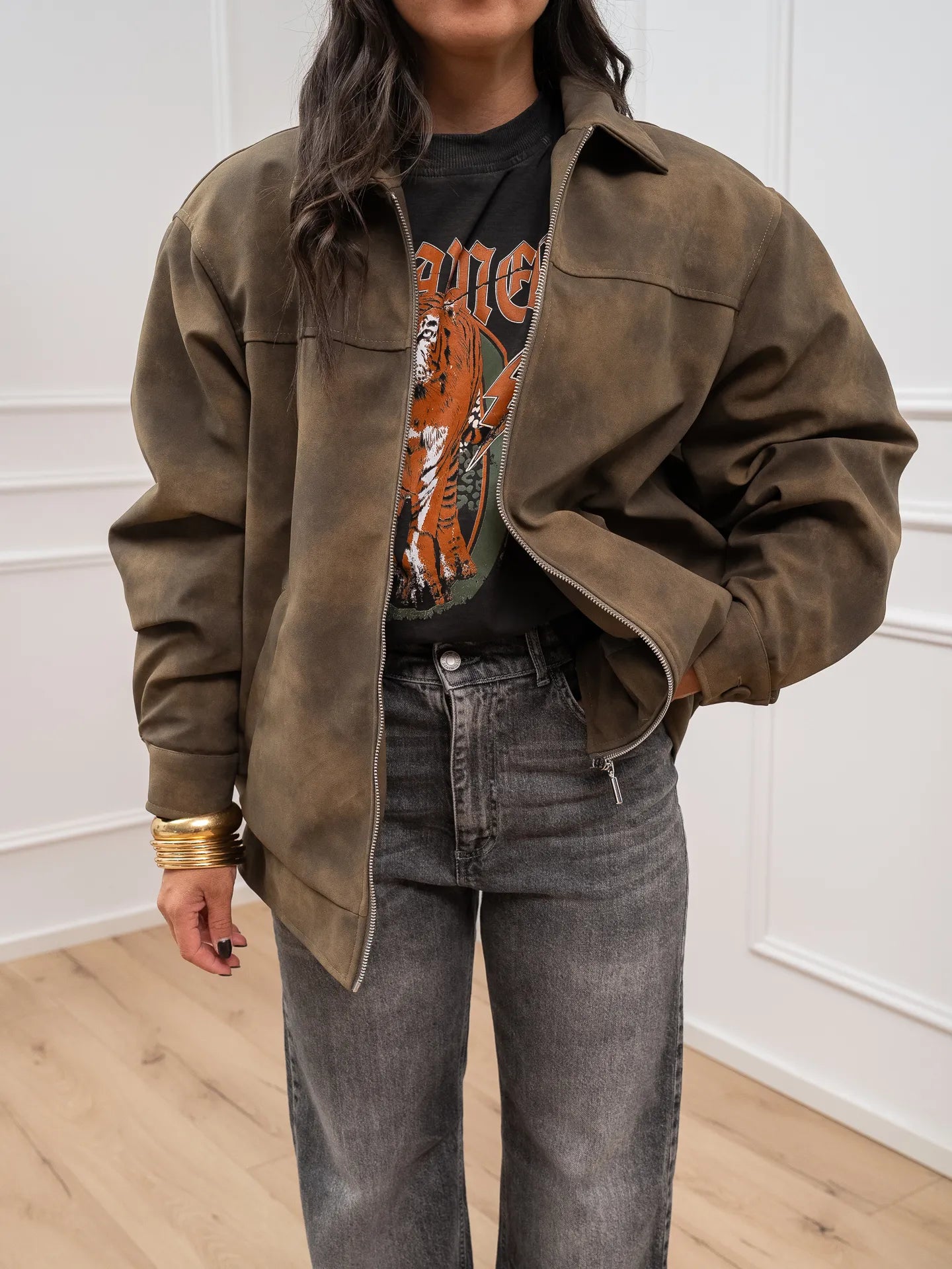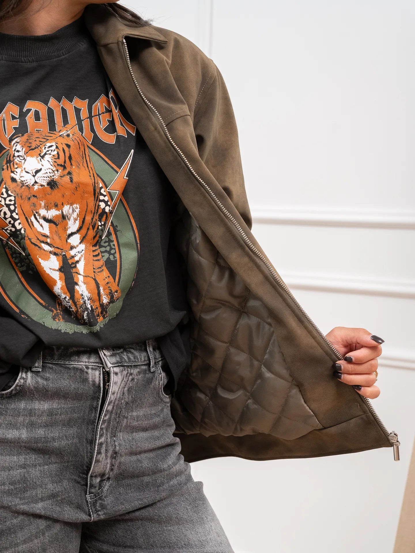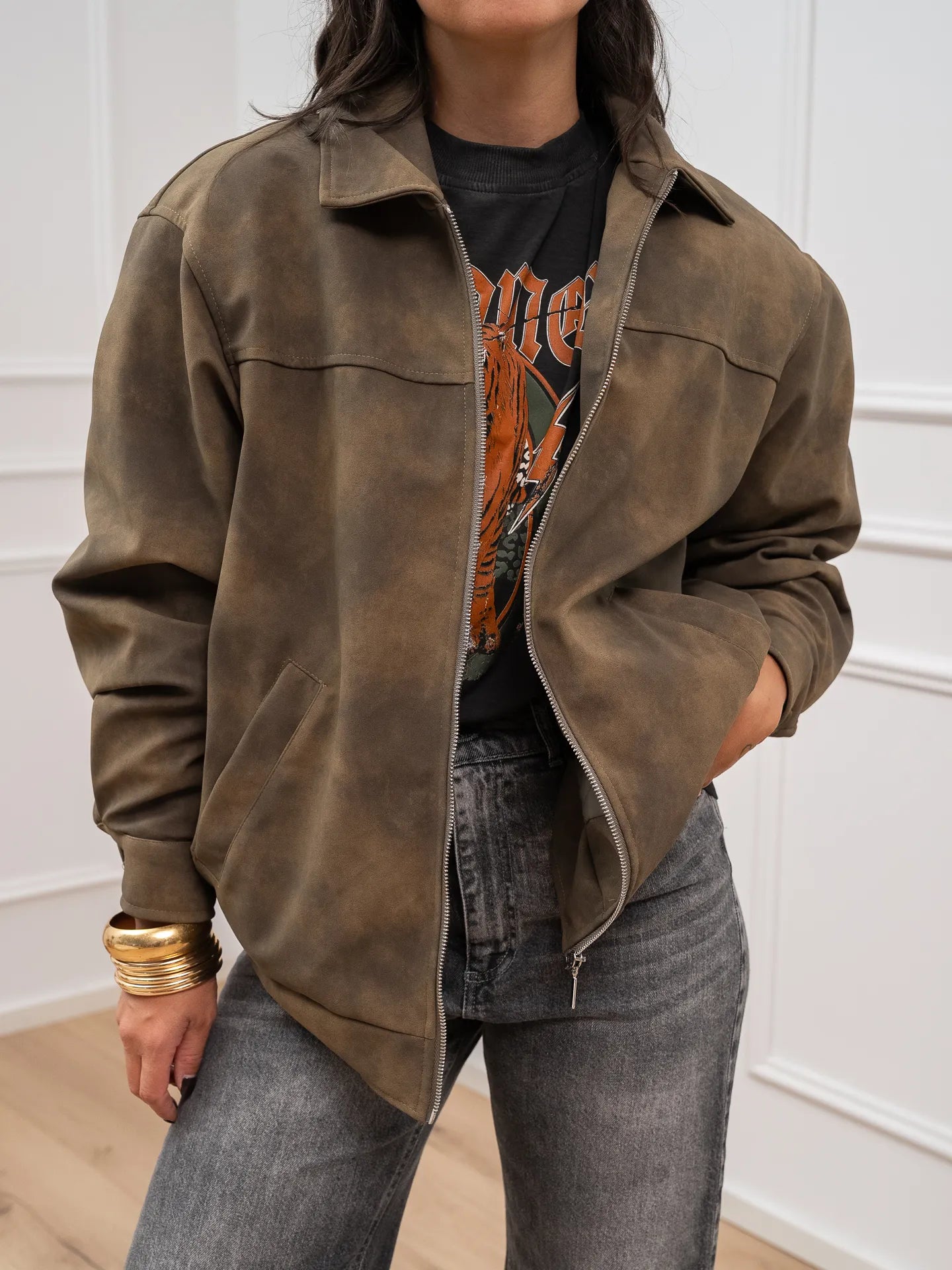 Giacchetto aviatore in suede color verde militare HaveOne. Modello fit oversize leggermente imbottito con interno trapuntato. Chiusura frontale con zip. Finte tasche a filetto e manica lunga con polsino sul fondo.