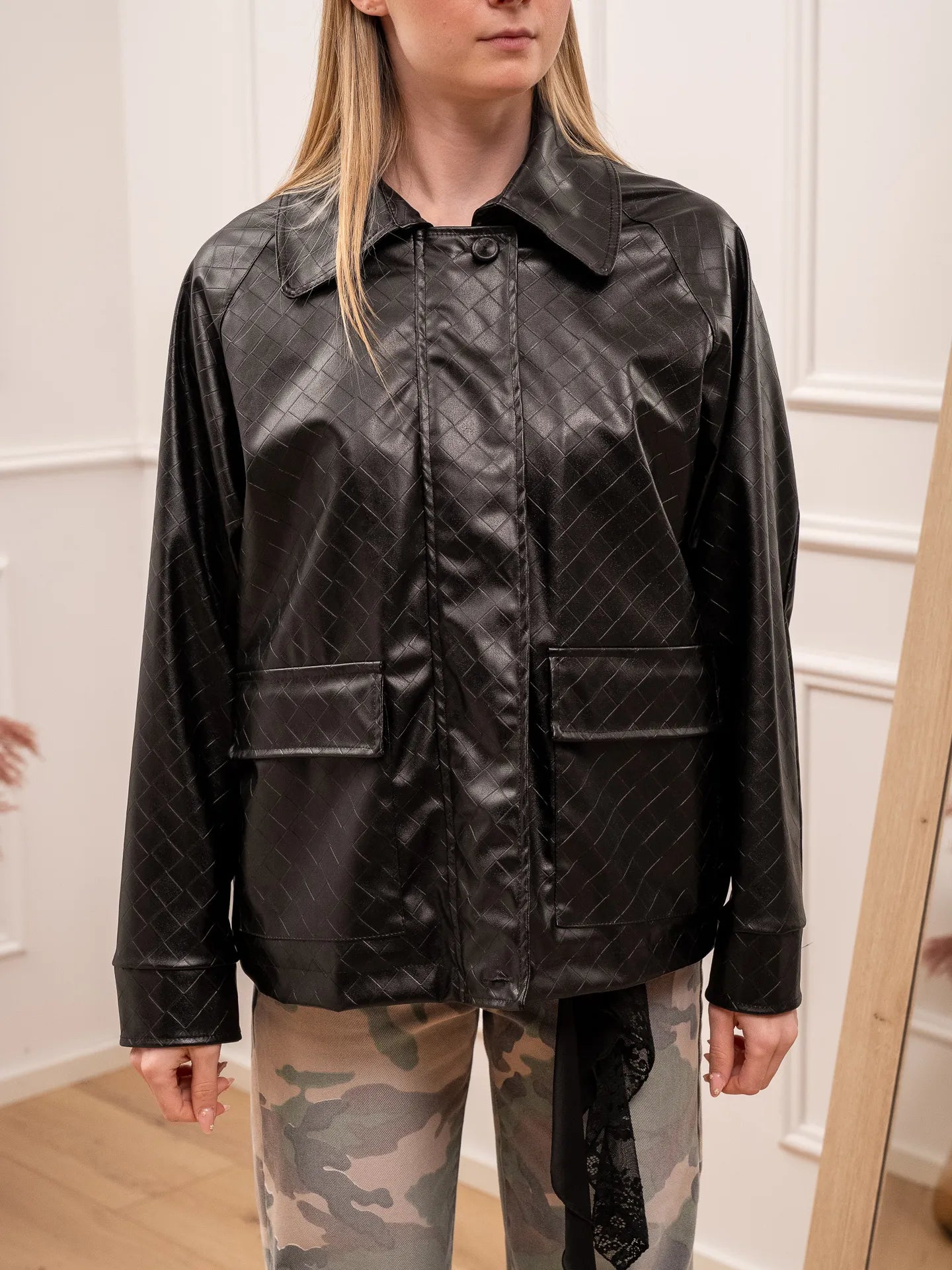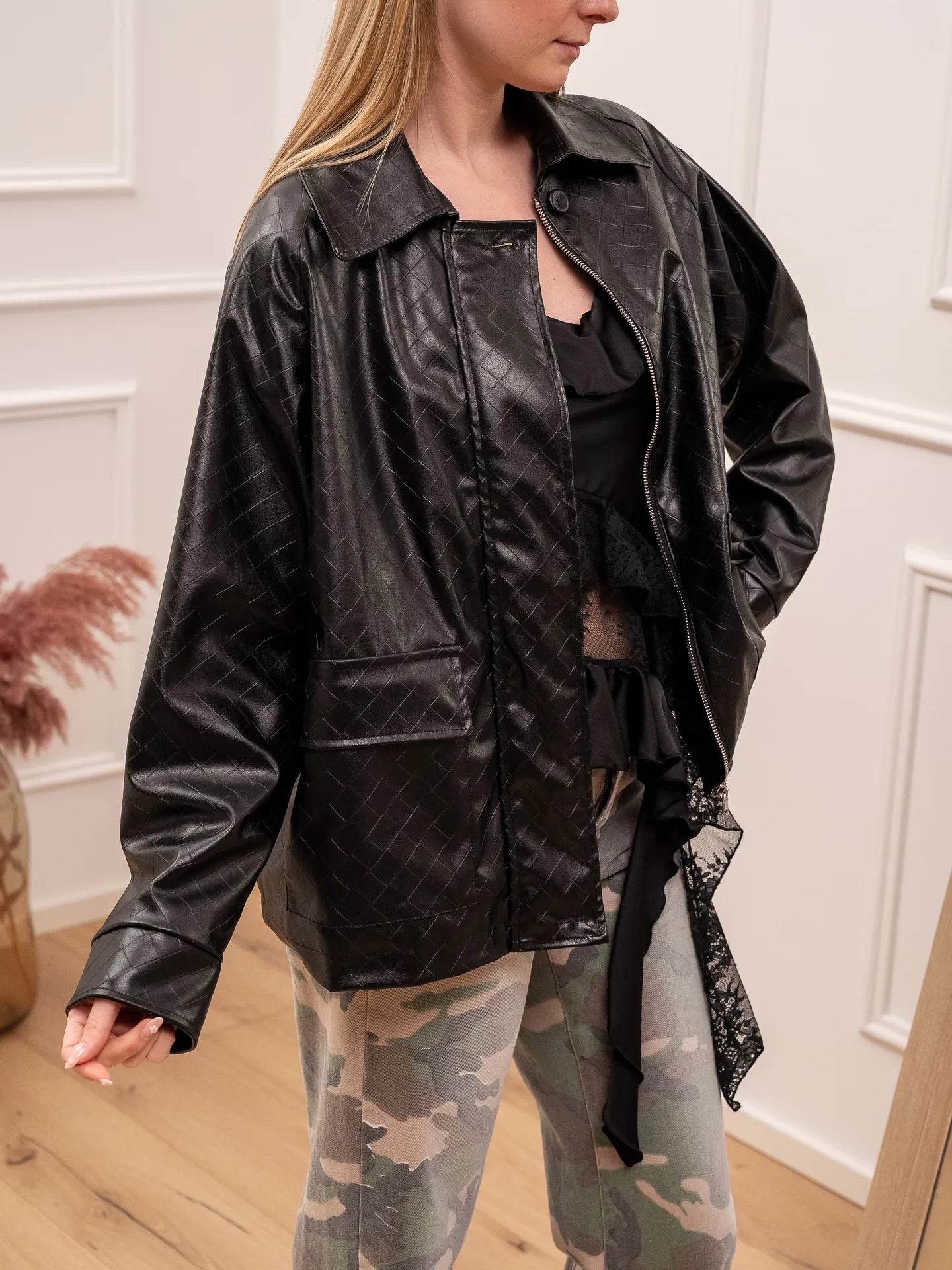 Giacchetto over nero in ecopelle effetto intrecciato - Vicolo