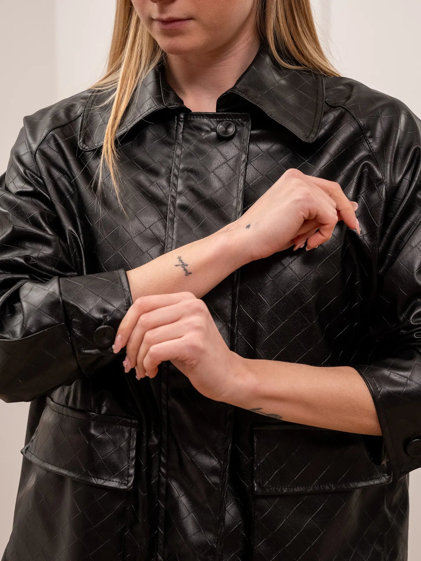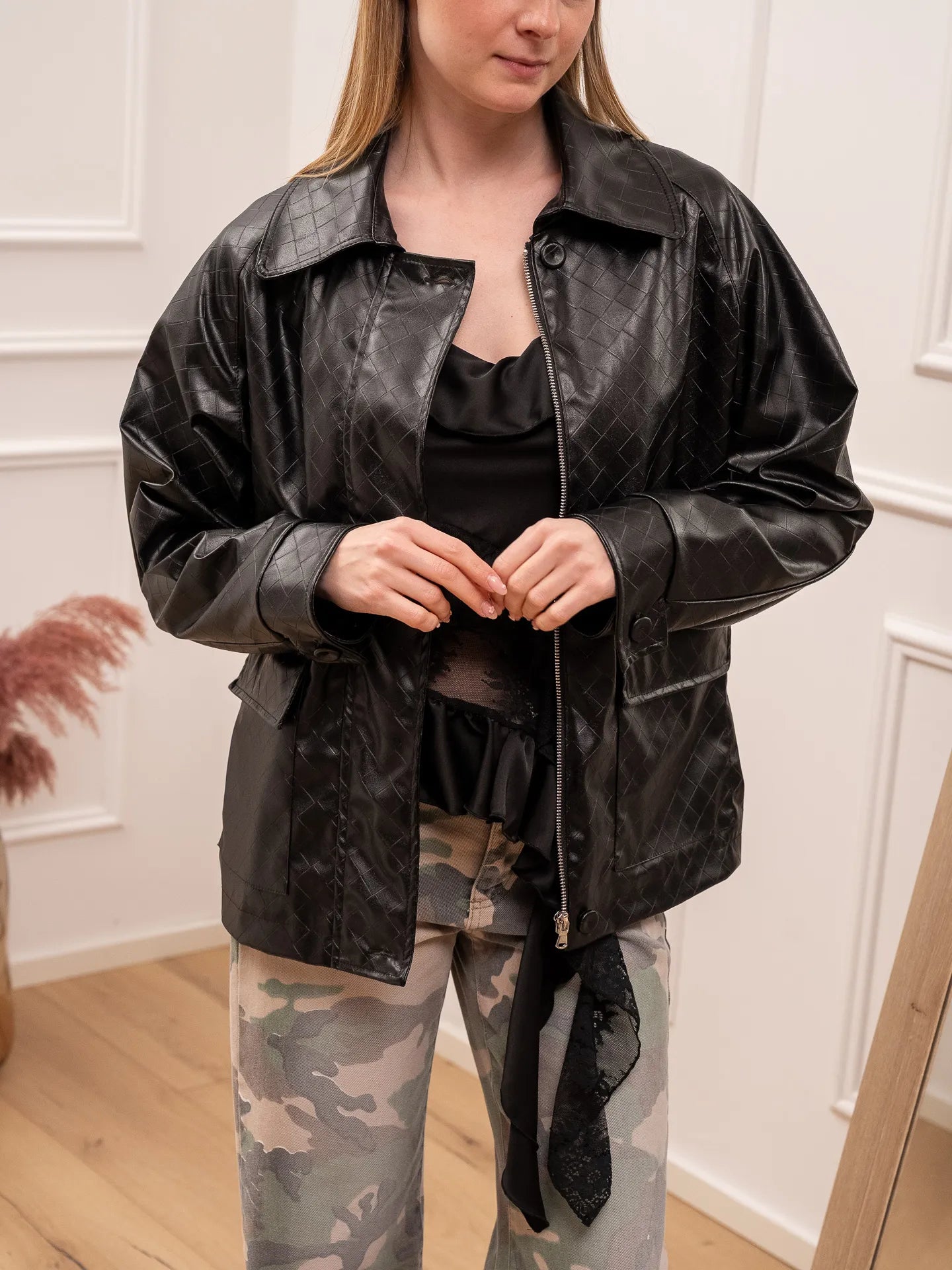 Giacchetto color nero in ecopelle effetto intrecciato Vicolo. Modello con colletto e chiusura frontale con zip nascosta. Tasche con patta frontali. Manica lunga con polsino sul fondo.