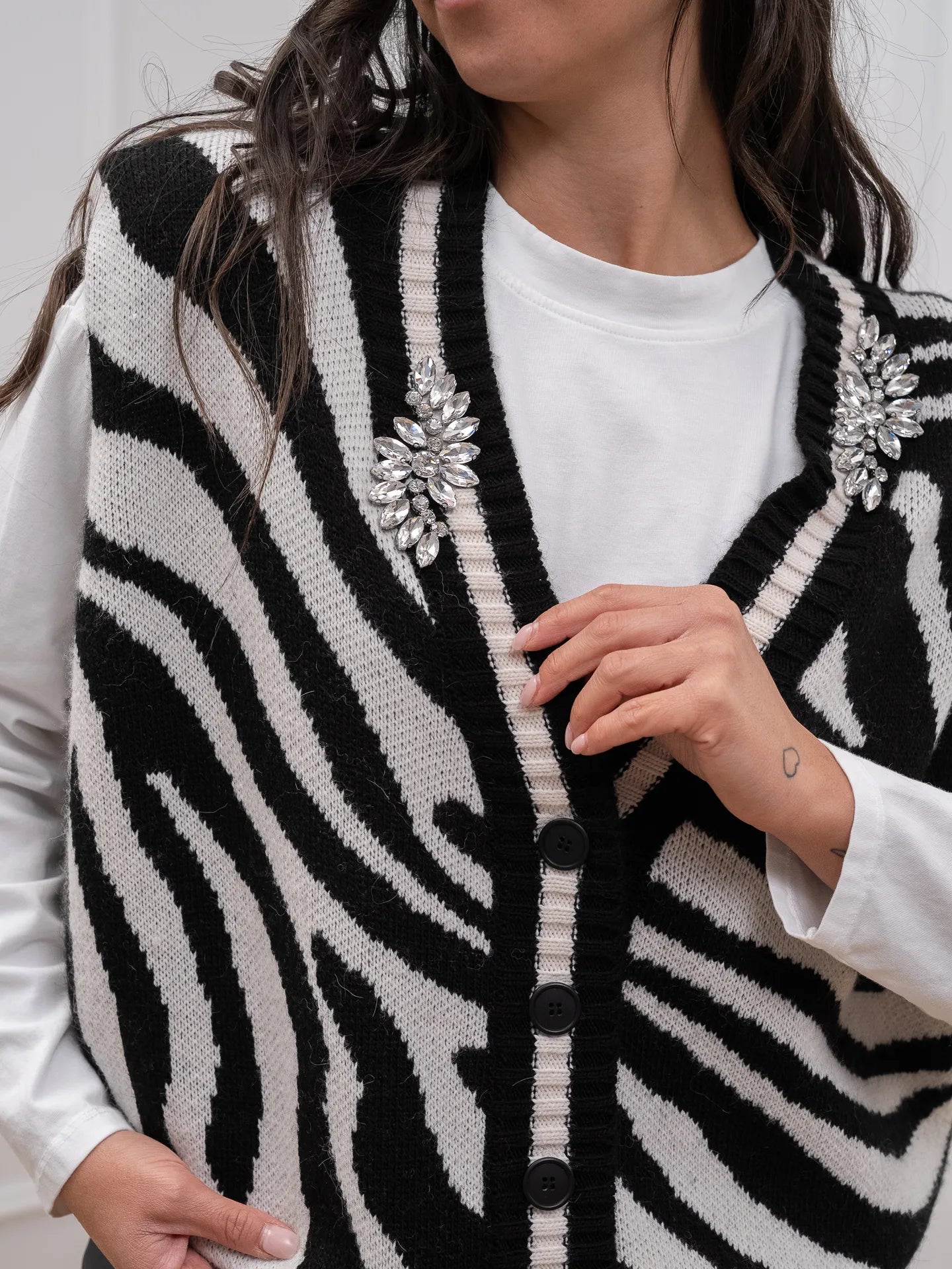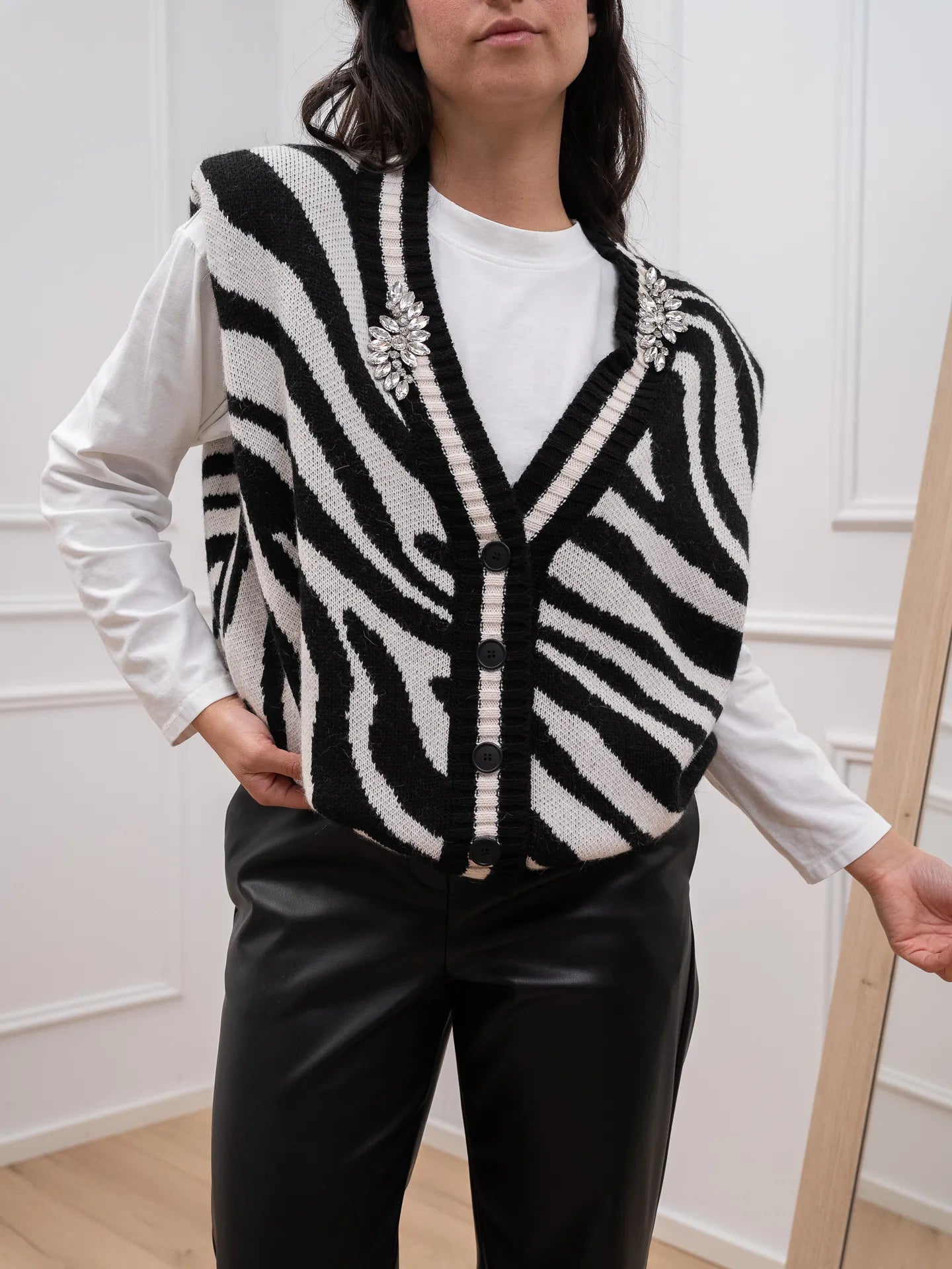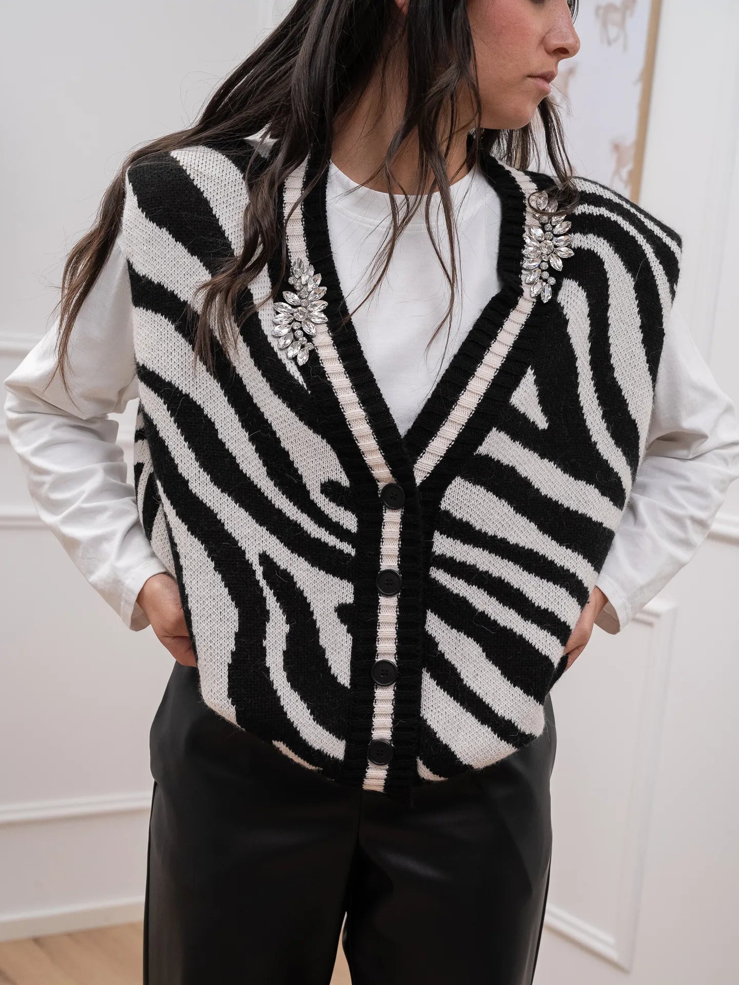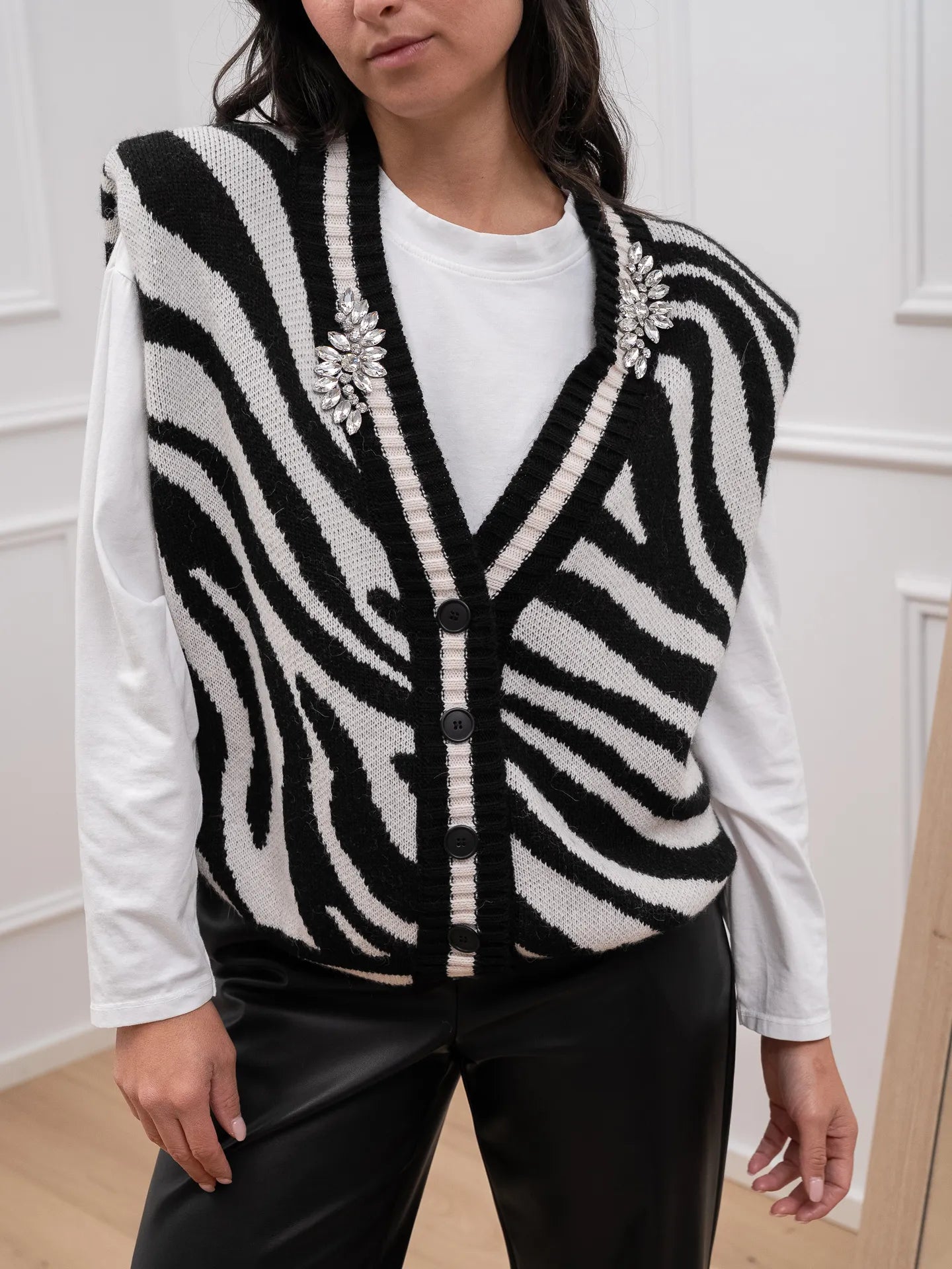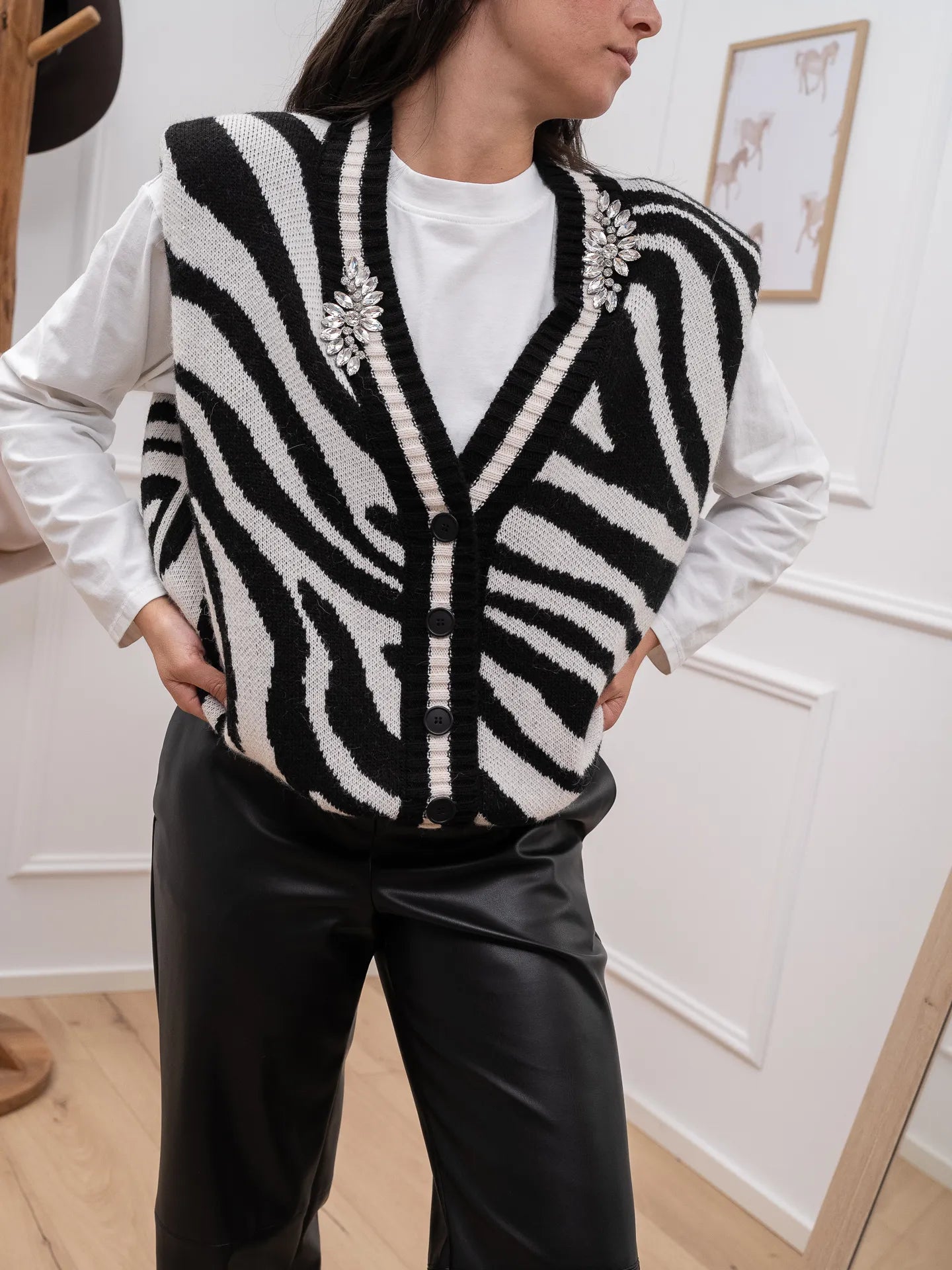 Gilet in maglia panna, nero Dixie. Modello fit morbido con scollo a v e spalline imbottite. Dettaglio di cabochon e chiusura con bottoni.