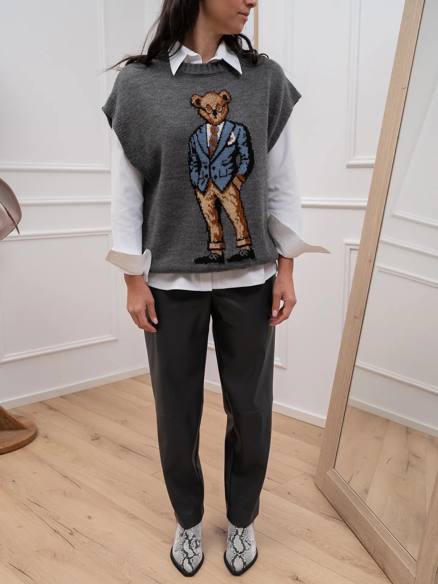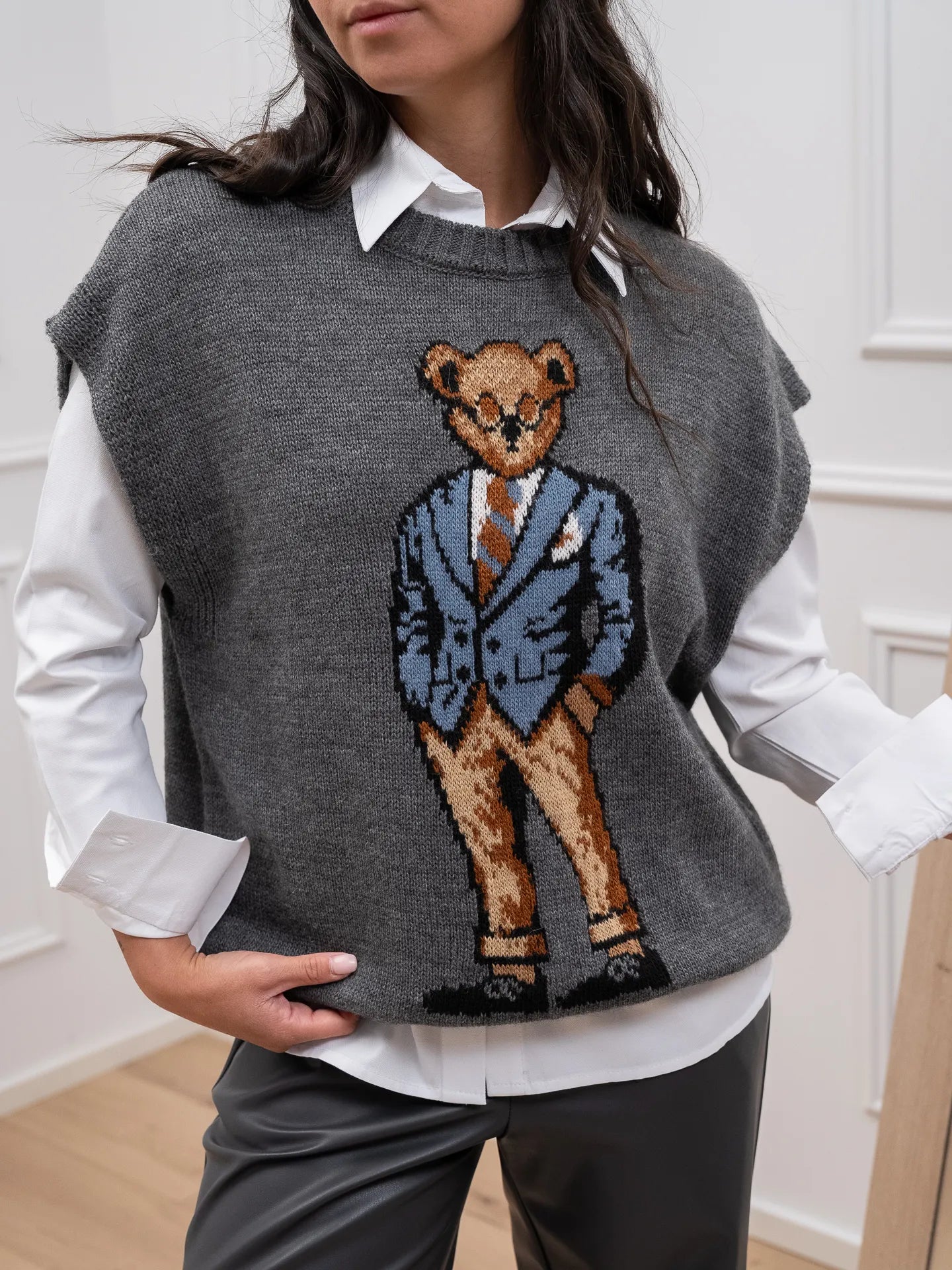 Gilet color grigio antracite HaveOne. Modello girocollo smanicato, fit oversize con finiture a coste. Dettaglio di orsetto frontale con blazer azzurro.