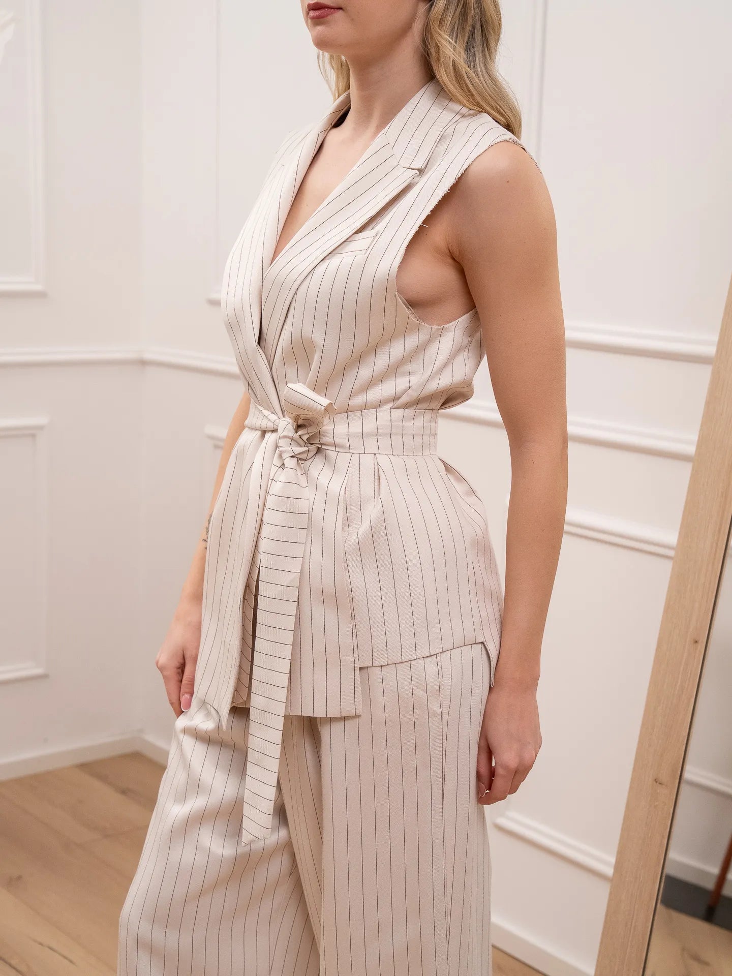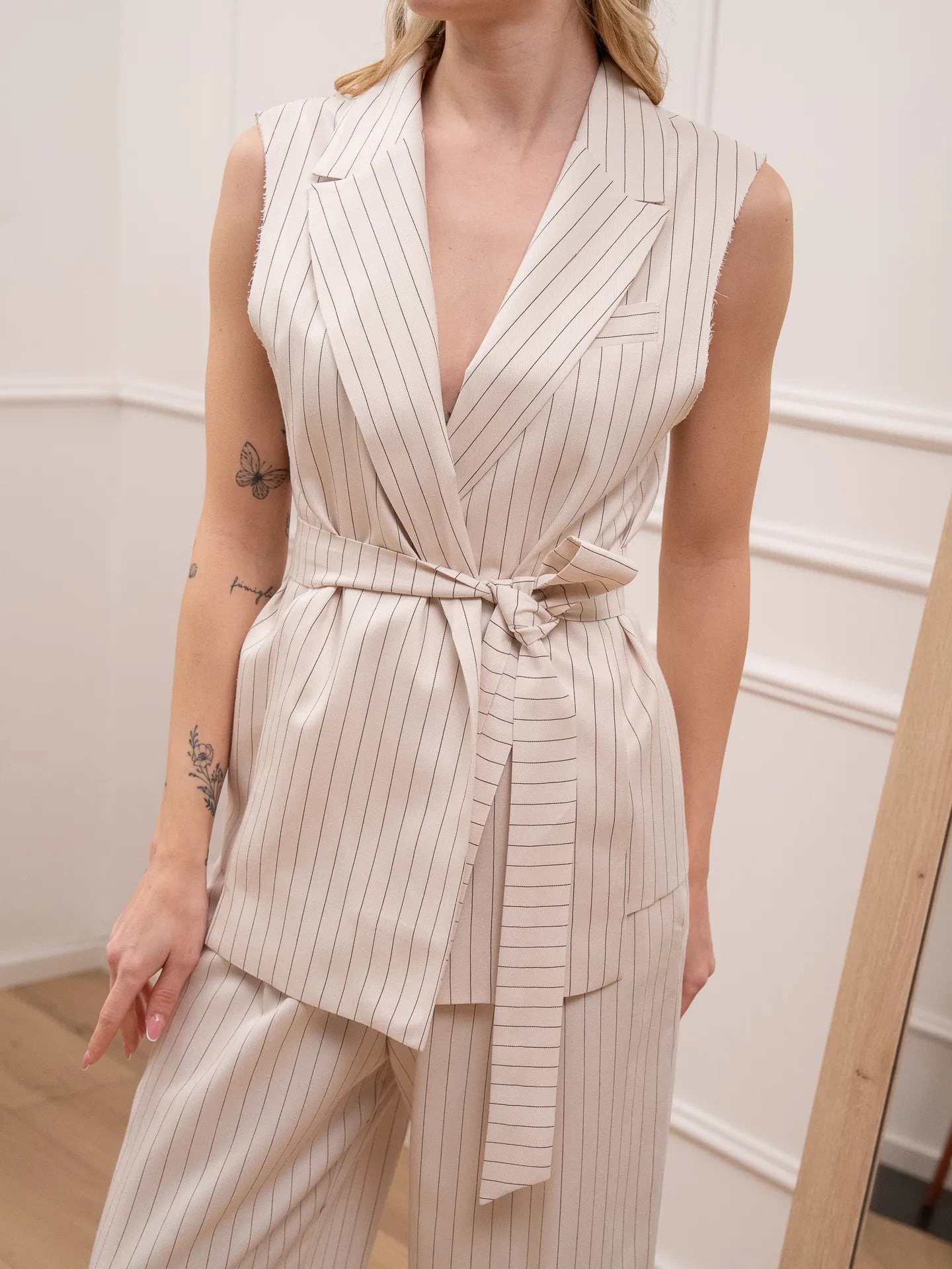 Gilet color burro gessato moro So Allure. Modello collo revers e scollo a v. Manica con dettaglio di bordo a taglio vivo. Fondo asimmetrico e cinturina in vita da annodare.