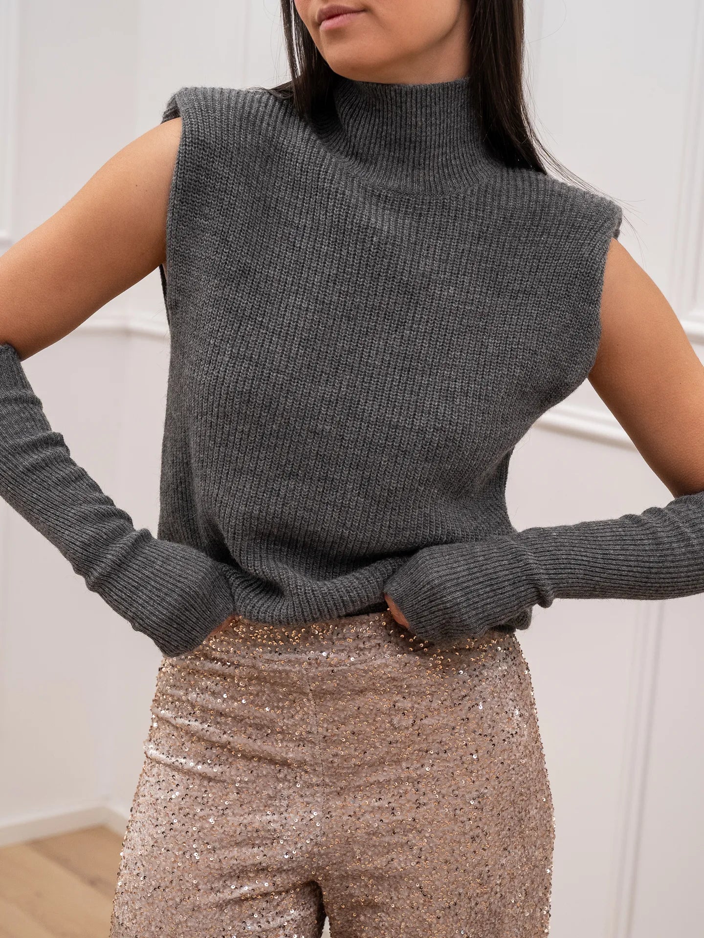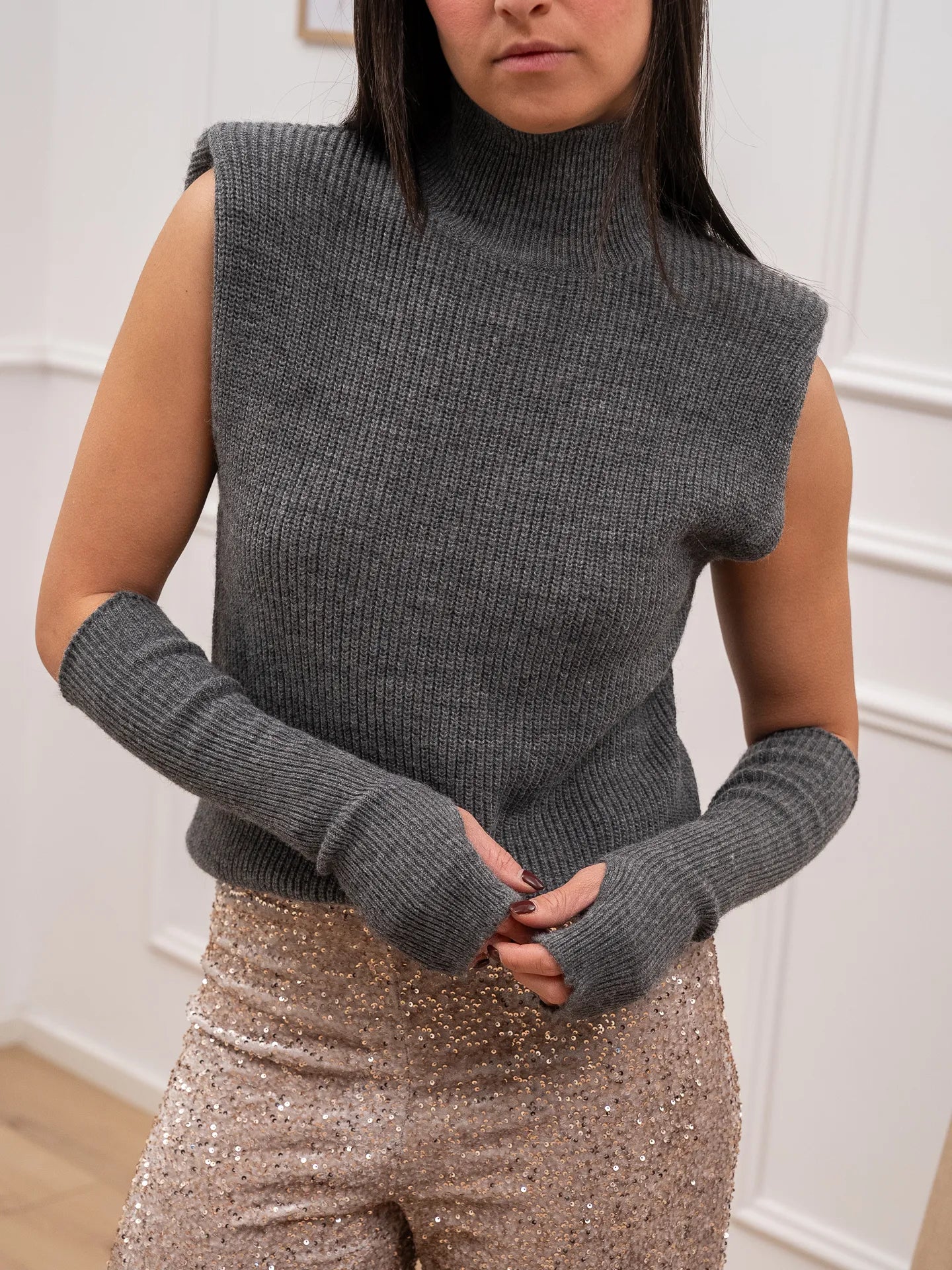 Gilet color grigio misto lana Kontatto. Modello collo alto smanicato con spalle imbottite. Dettaglio di manicotti.