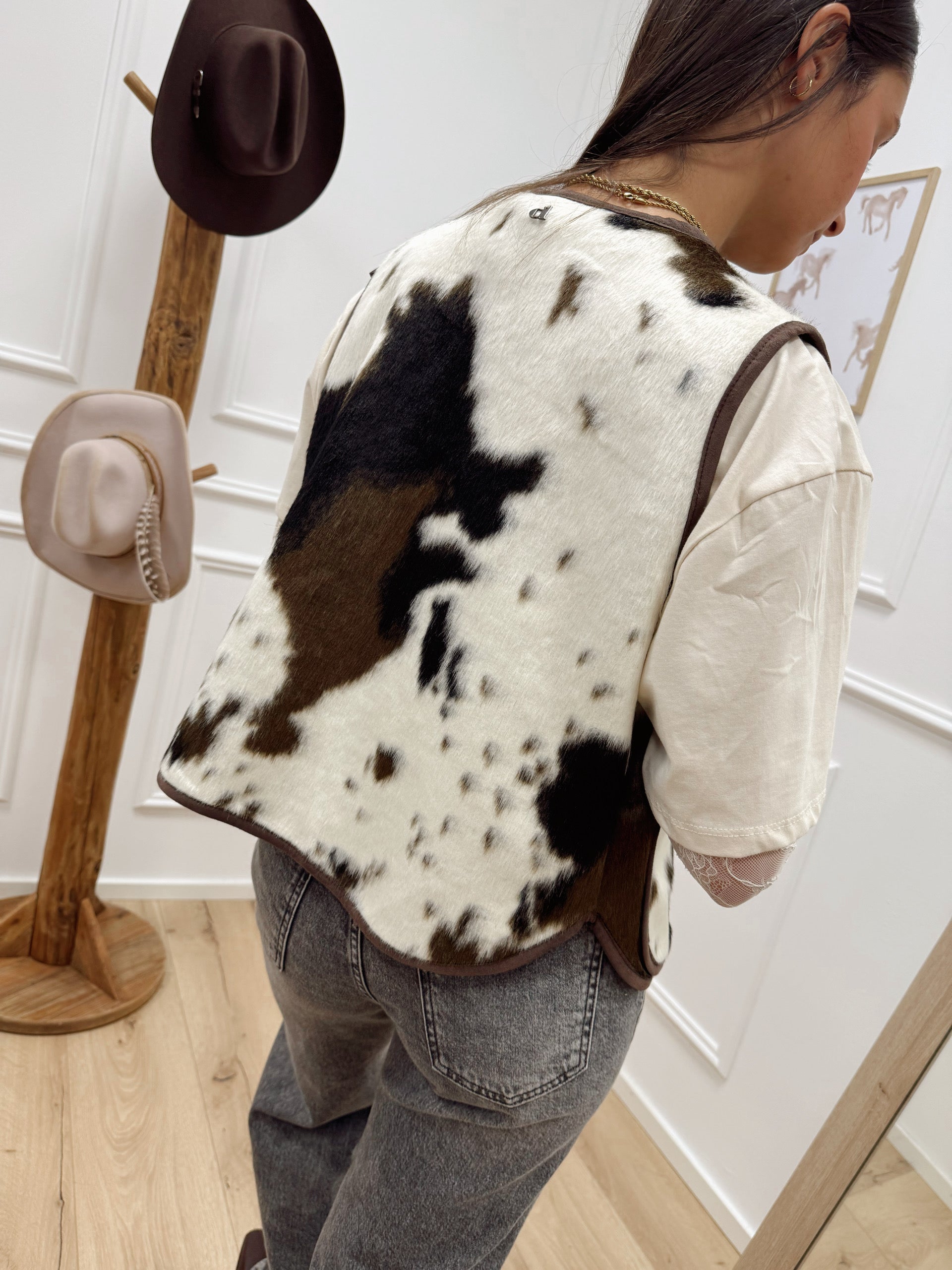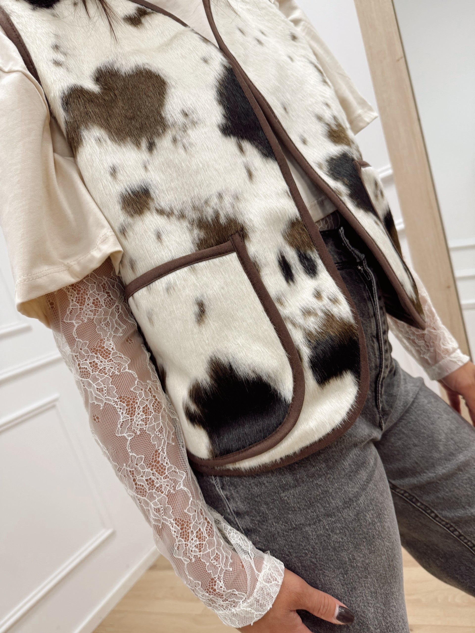 Gilet in cavallino fantasia muccata Dixie. Modello fit morbido smanicato senza chiusura con tasche frontali.