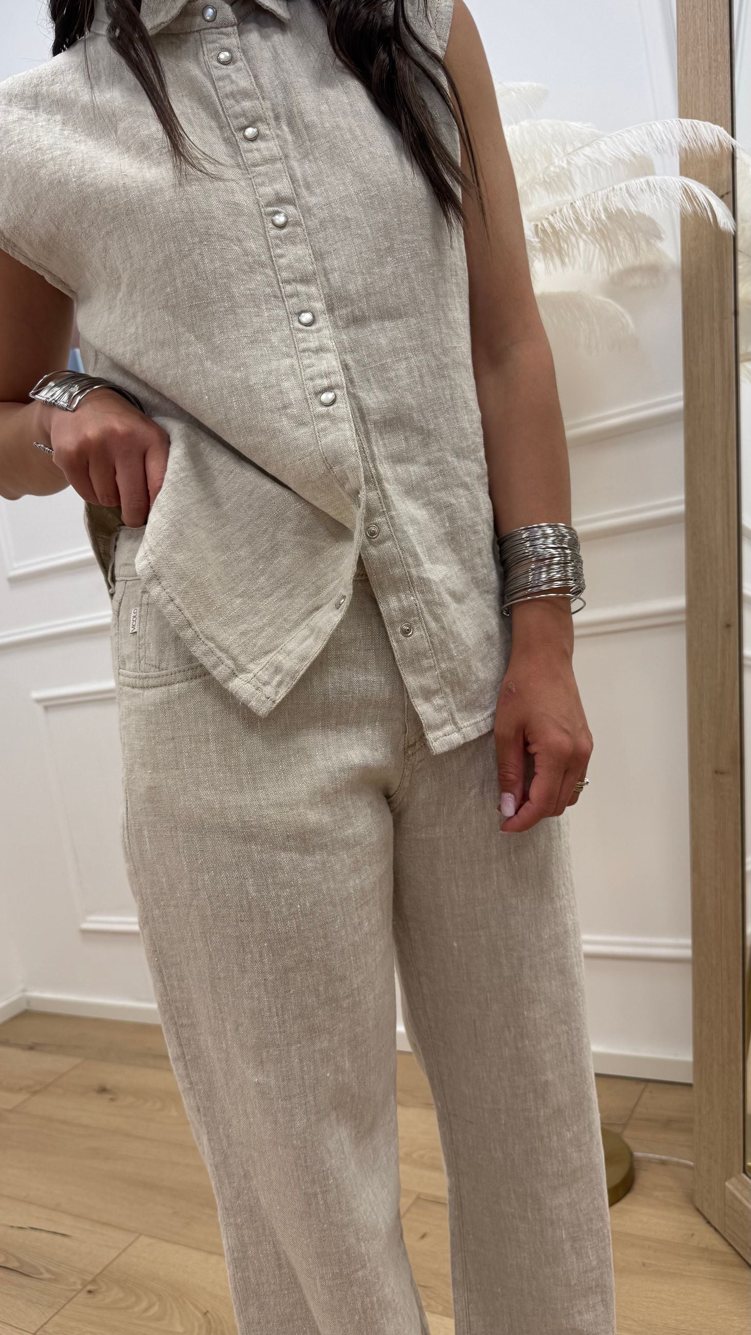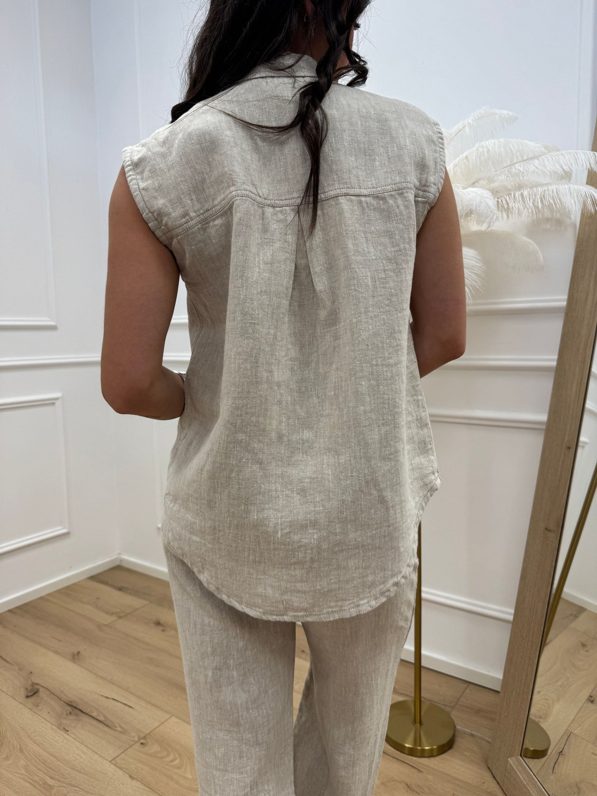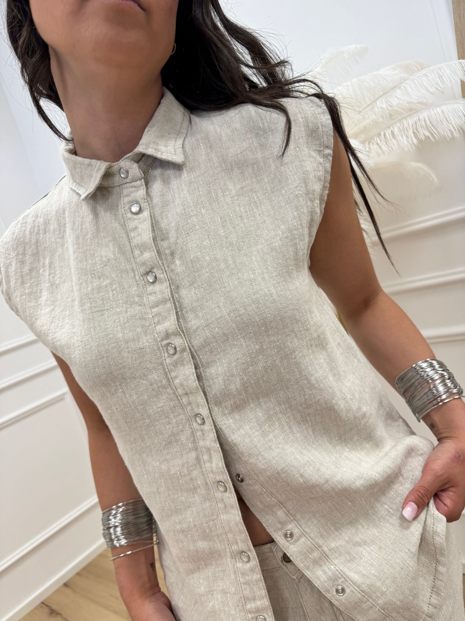 Gilet ecrù 100% Lino Vicolo. Modello fit morbido smanicato con colletto e chiusura frontale con bottoni a pressione.