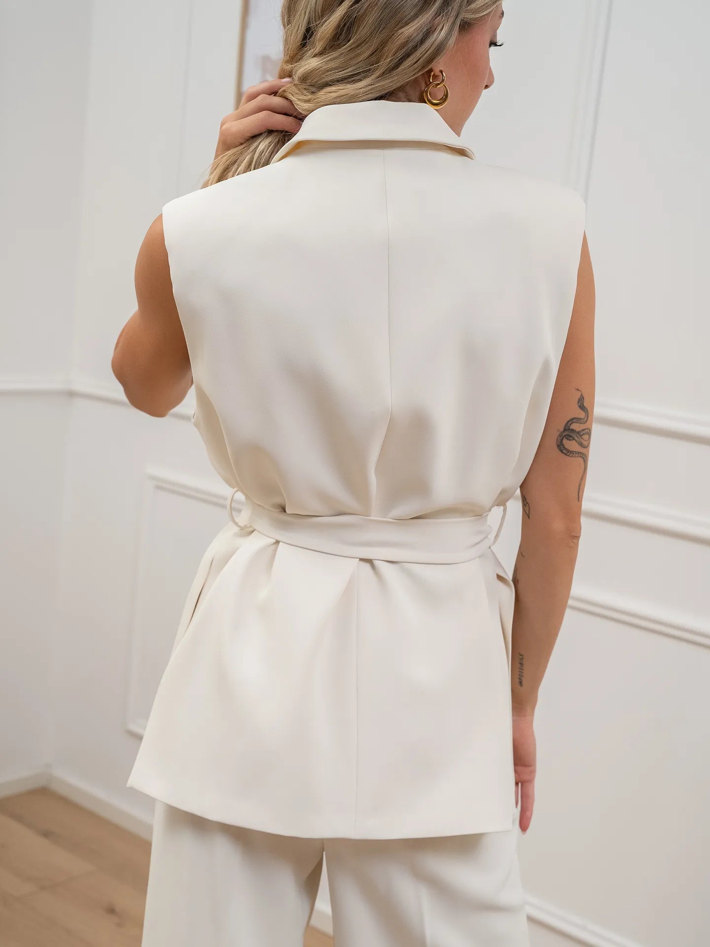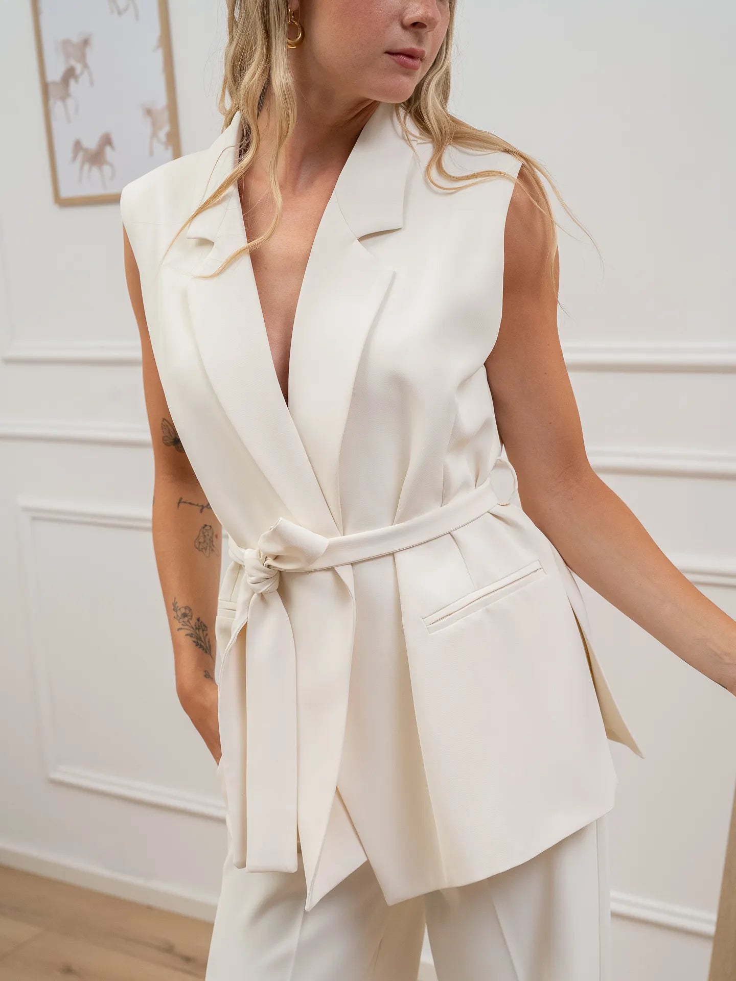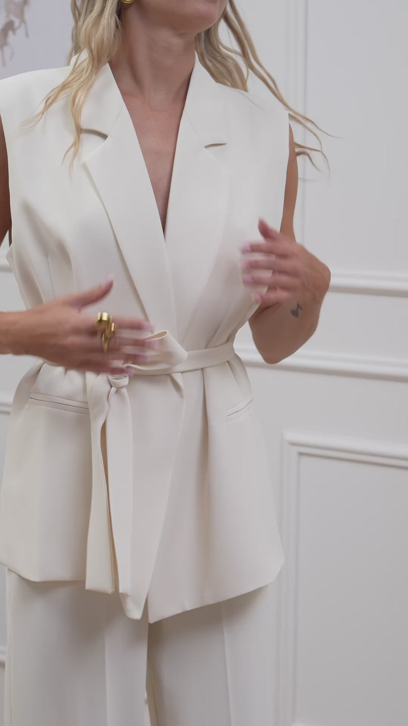 Gilet Irma color burro Vicolo. Modello collo revers senza chiusura con fusciacca in vita da annodare. Spalline leggermente imbottite e tasche a filetto laterali.