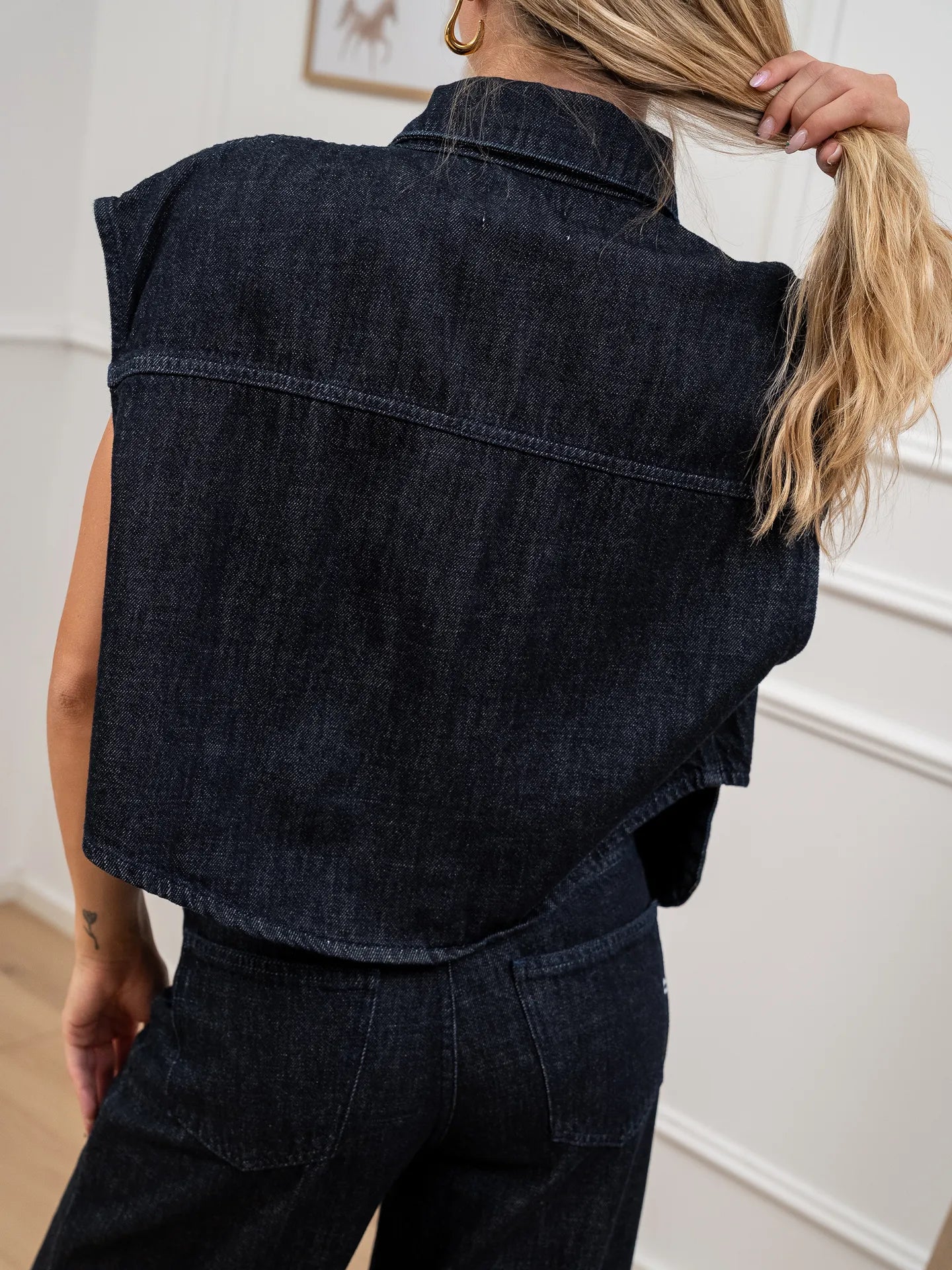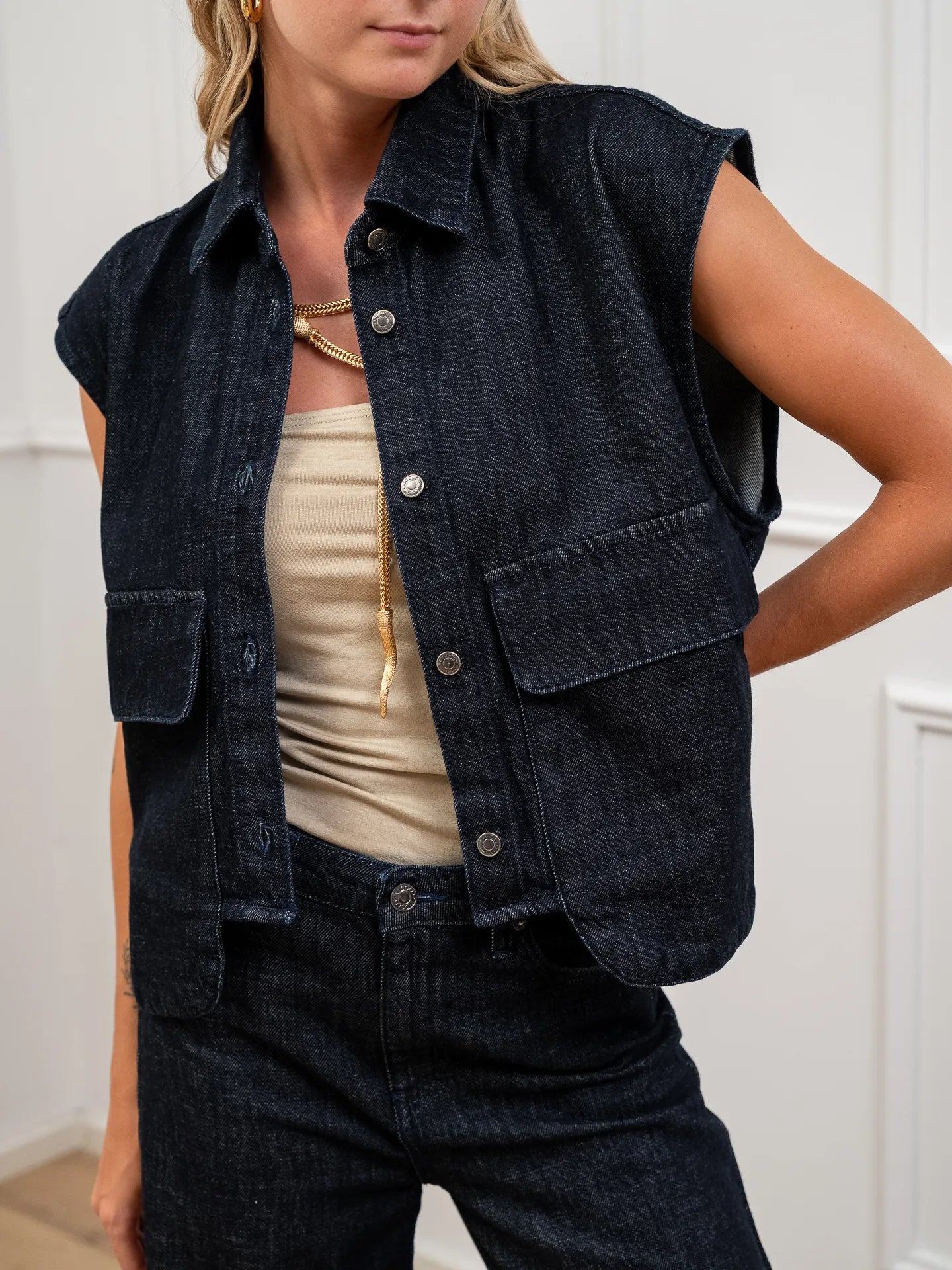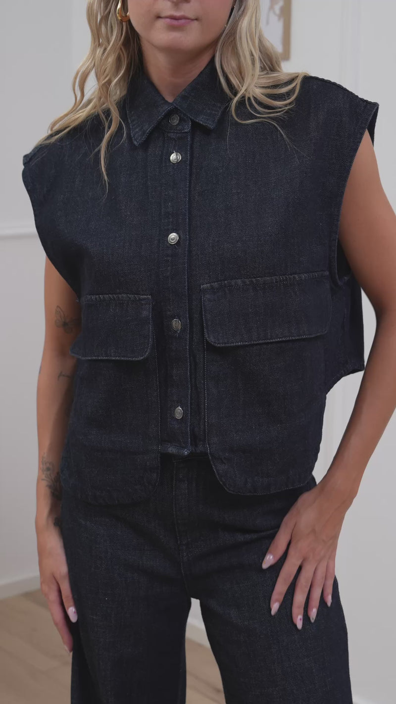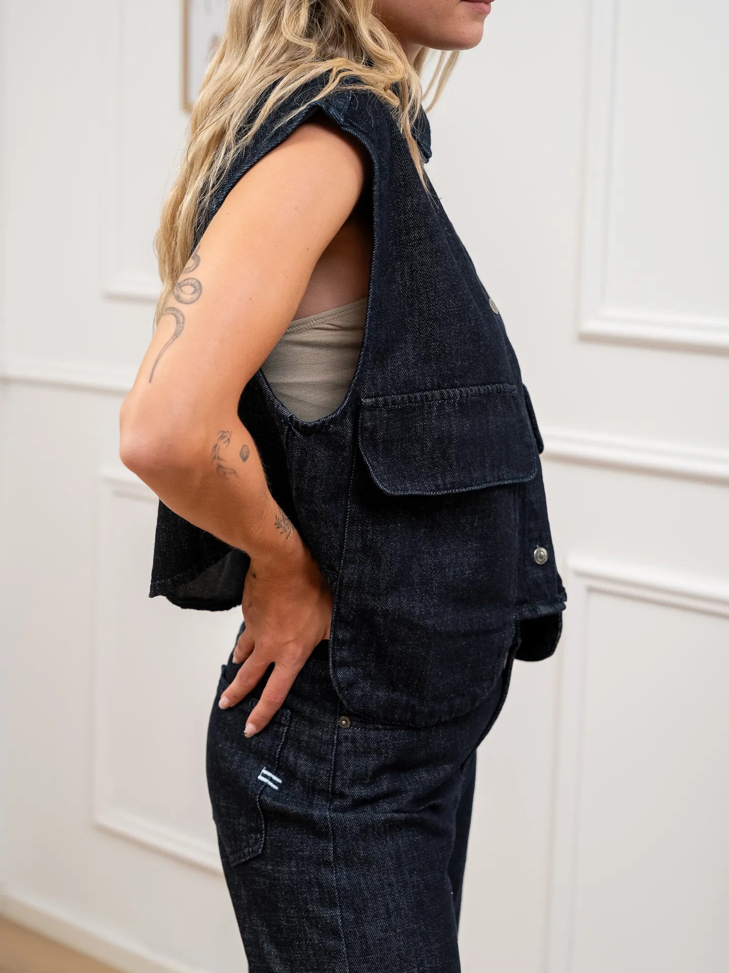 Gilet Nour denim lavaggio scuro Vicolo. Modello fit oversize, dettaglio cargo di maxi tasche frontali lunghe. Chiusura a bottoni metallici.