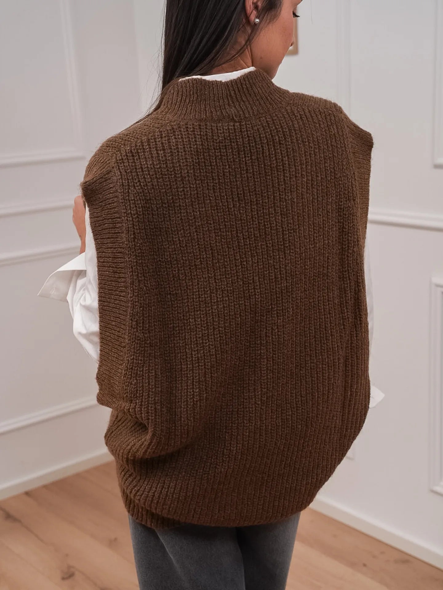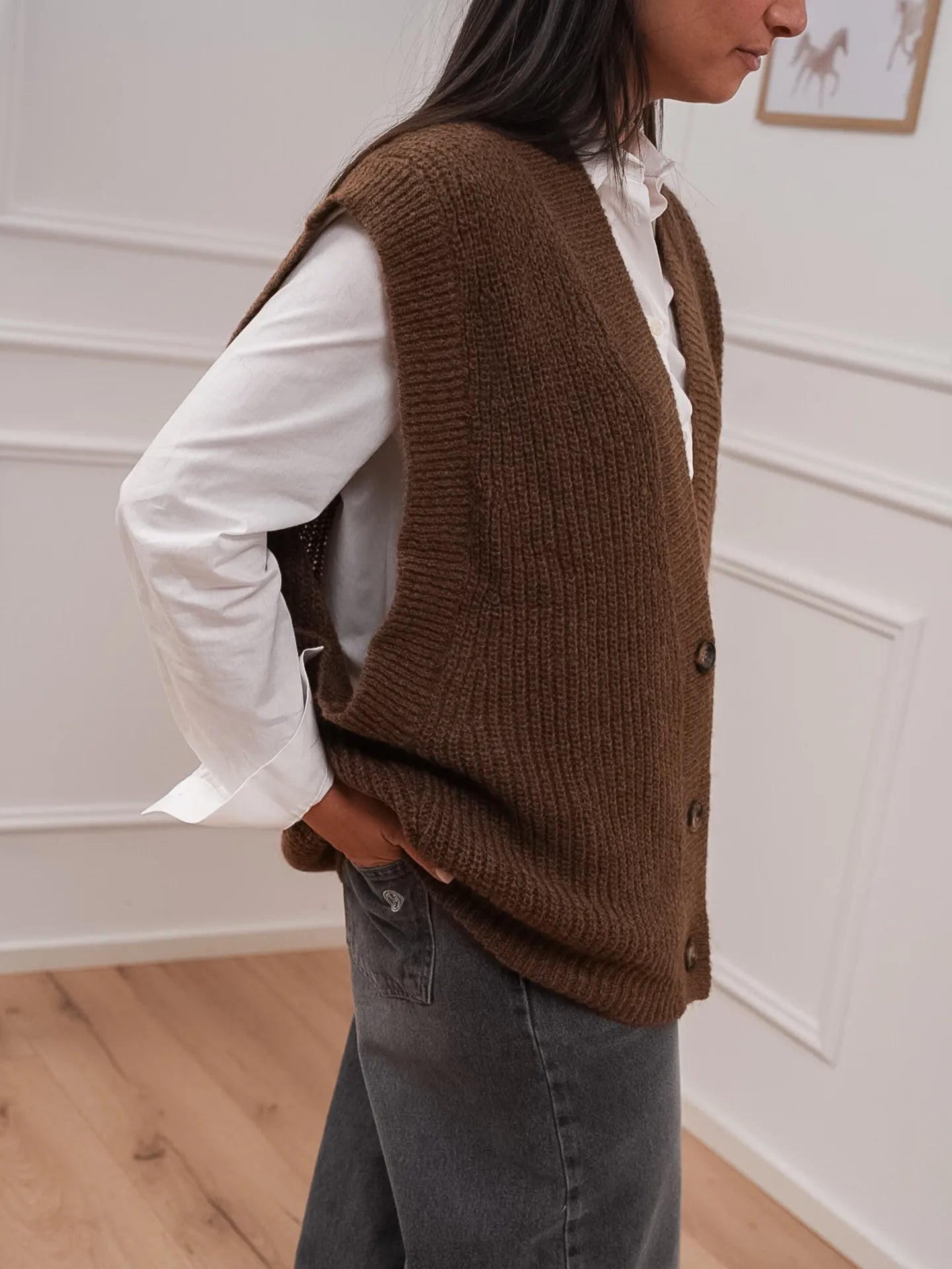 Gilet color tabacco Vicolo. Modello fit oversize con chiusura frontale a tre bottoni. Manica ampia e scollo a v. Finiture a coste.
