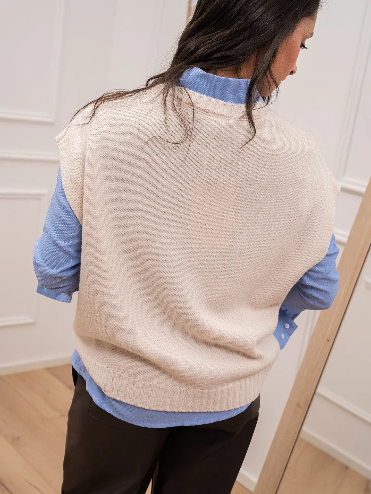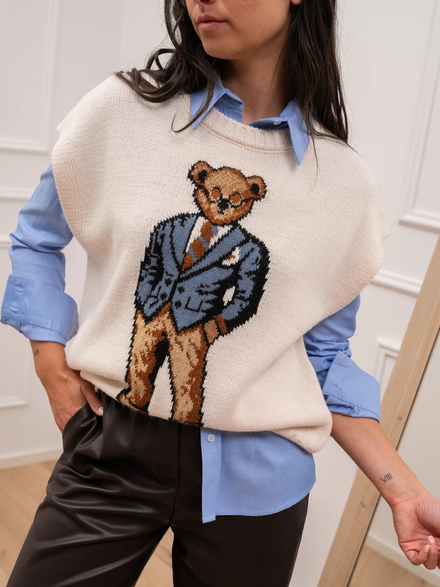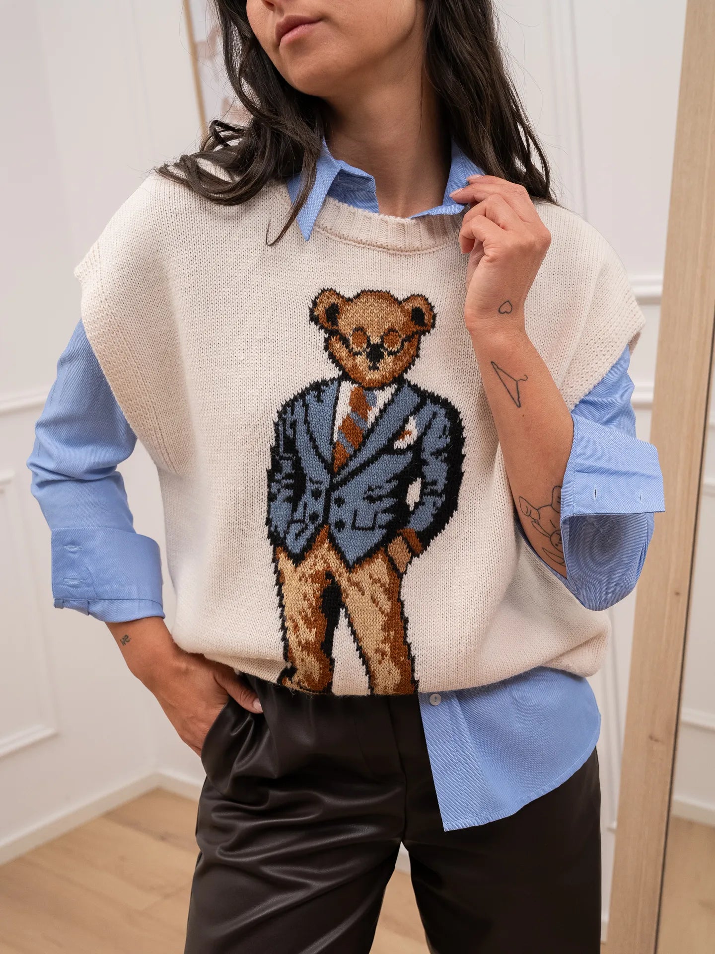 Gilet color pasta HaveOne. Modello girocollo smanicato, fit oversize con finiture a coste. Dettaglio di orsetto frontale con blazer azzurro.