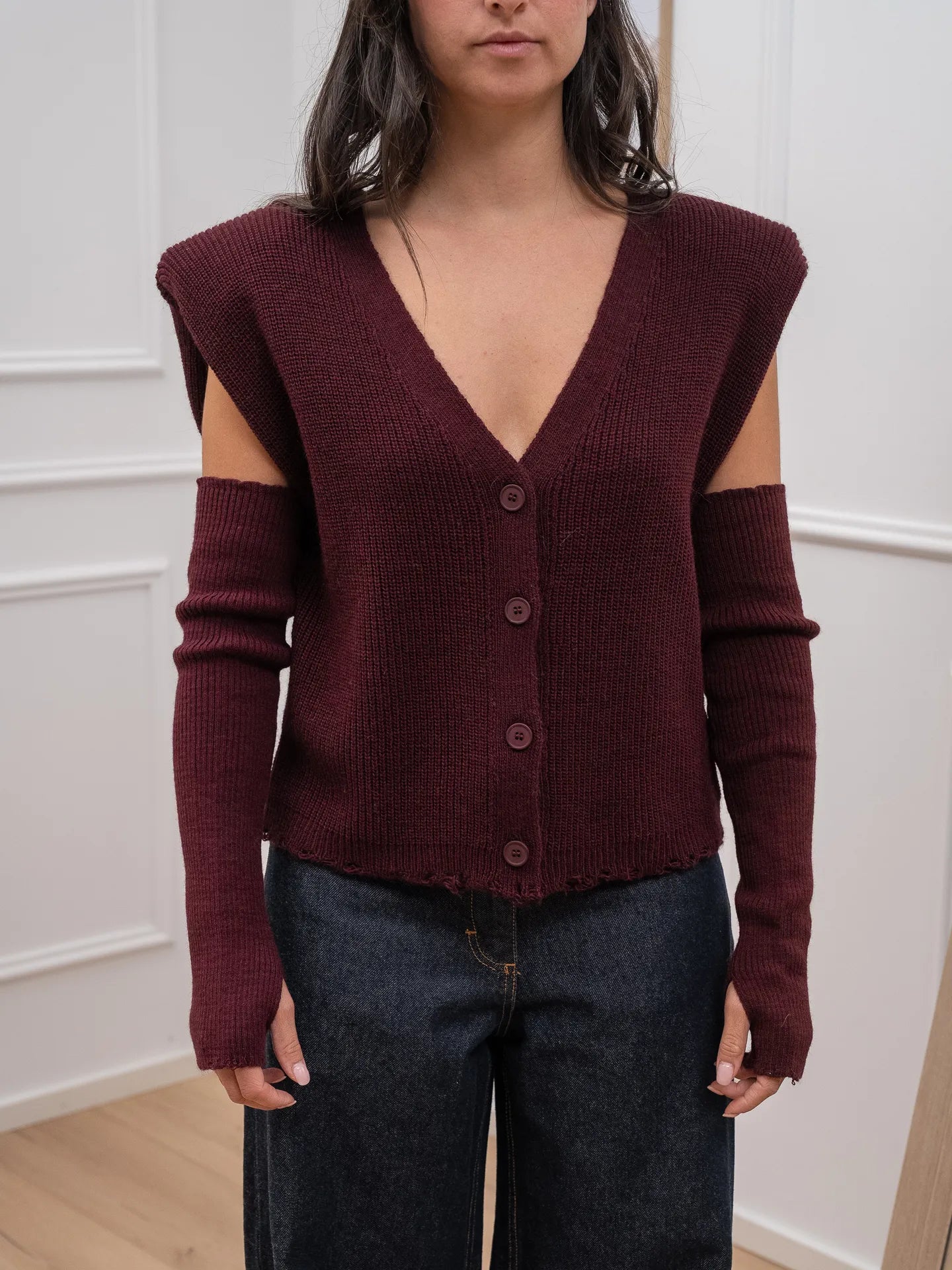 Gilet color vino HaveOne. Modello fit morbido con scollo a v e spalle imbottite, dettaglio di manicotti rimovibili. Chiusura frontale con bottoni e dettaglio di rotture sul fondo.