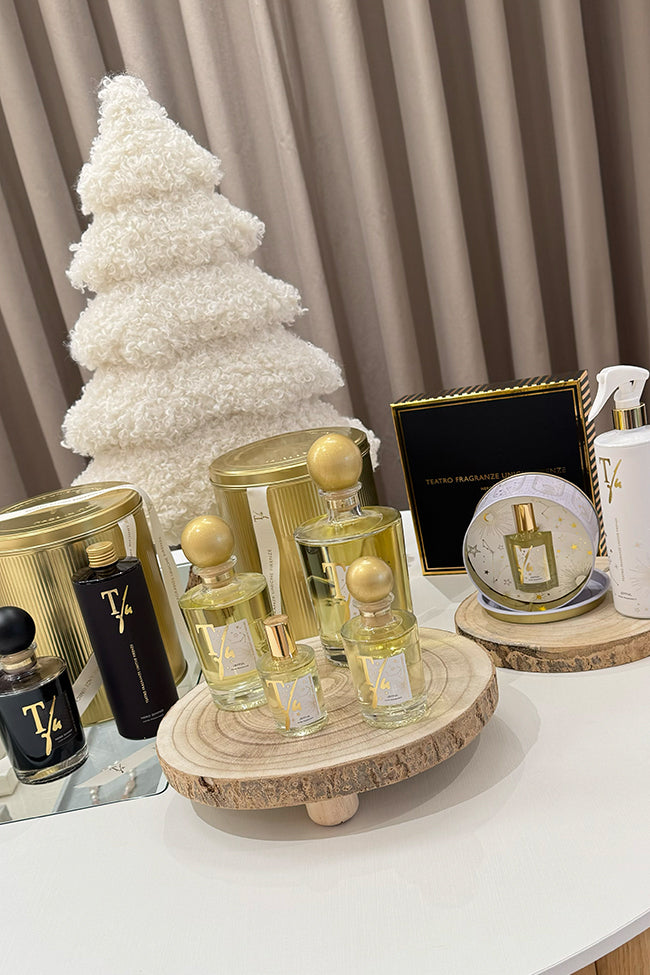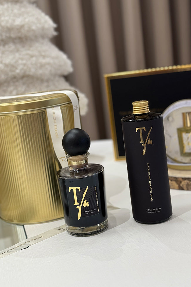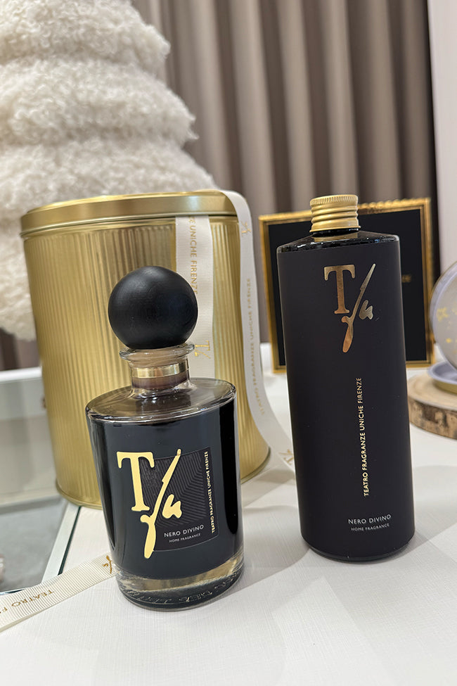 Confezione regalo Gold Tin Box Nero Divino Teatro Fragranze Uniche. Profumatore ambiente formato 250 ml con bastoncini + spray gun per ambiente 500 ml, che può essere utilizzata sia come refill che come spray per rafforzare la diffusione della fragranza.