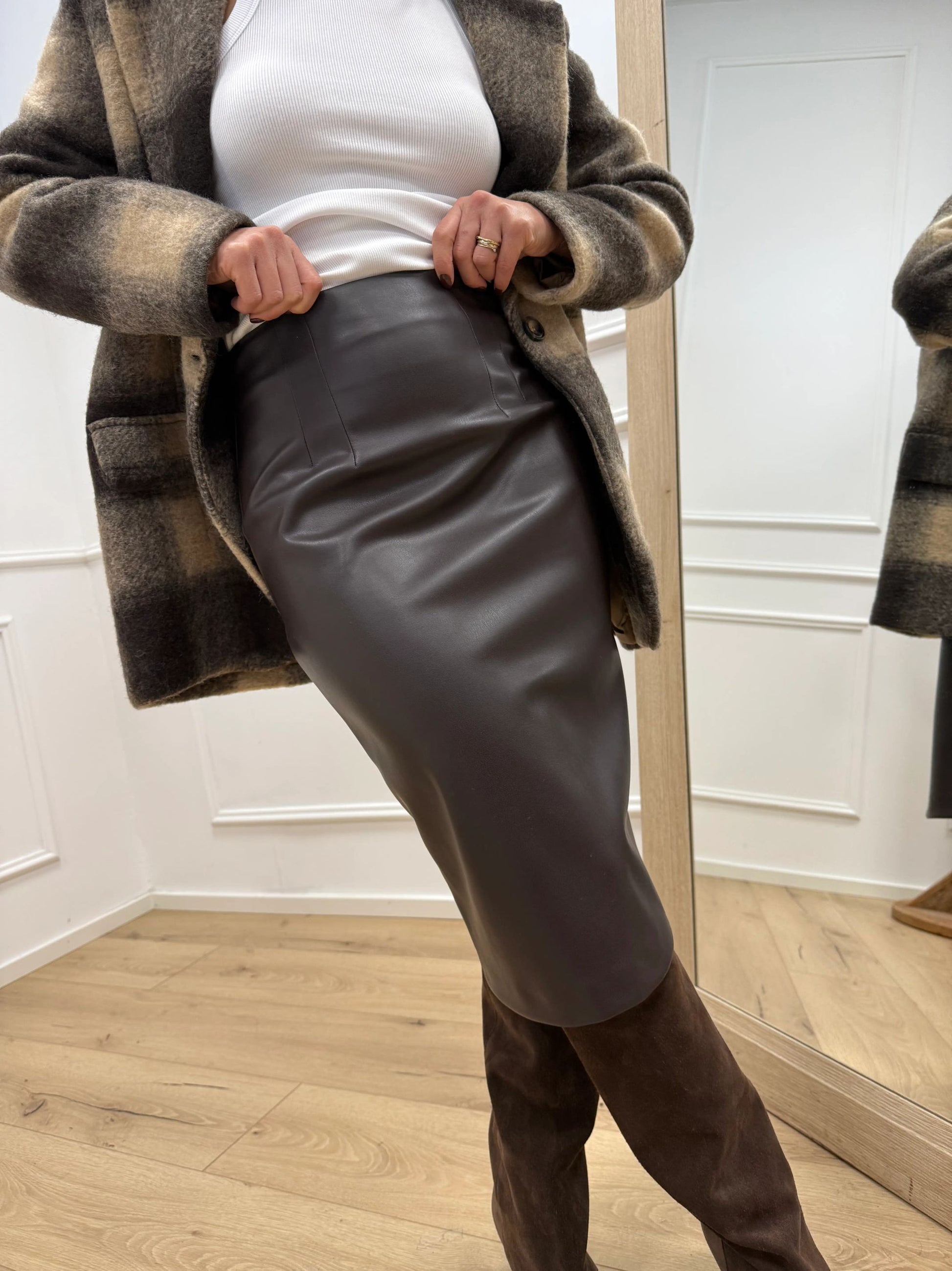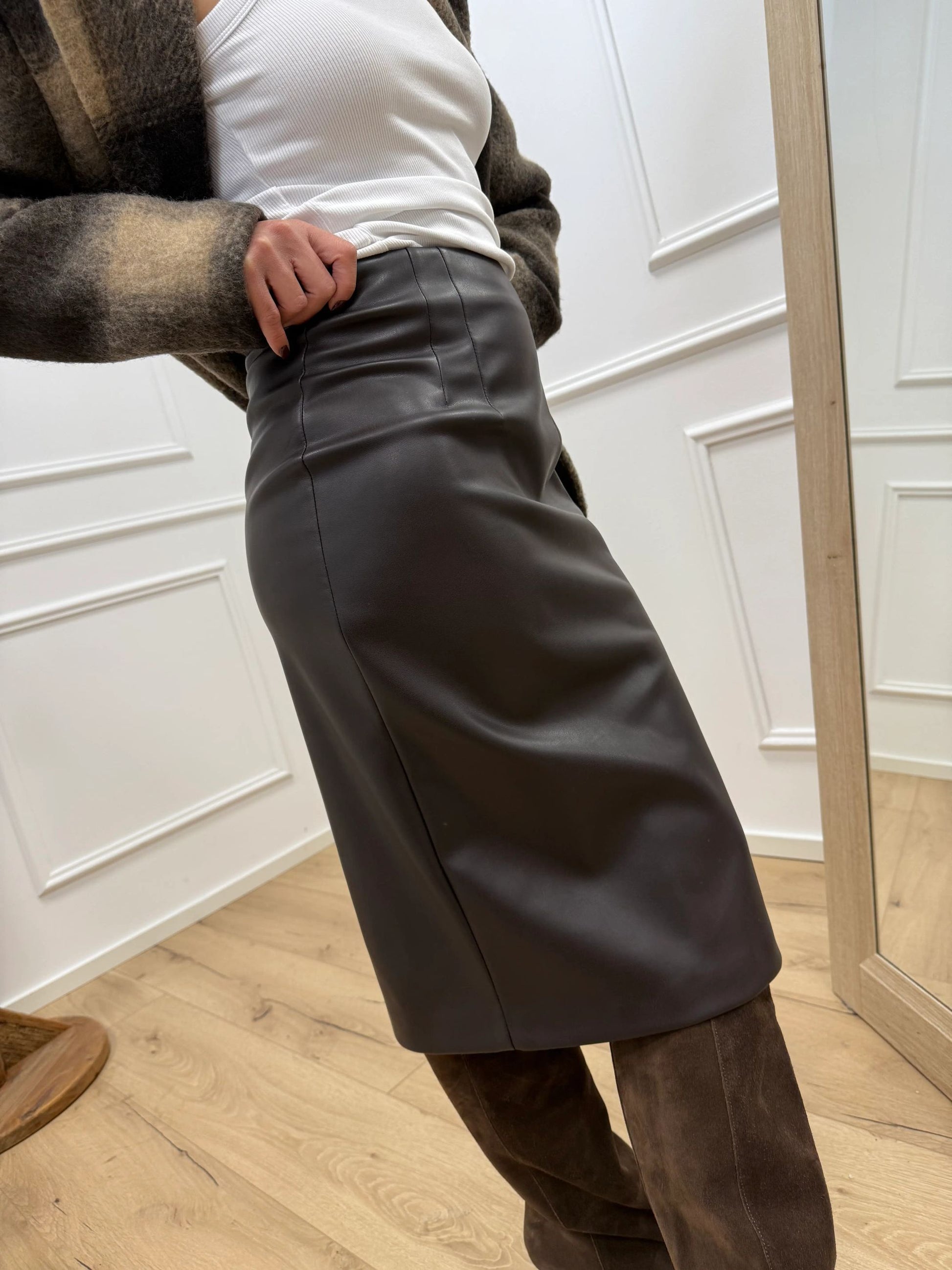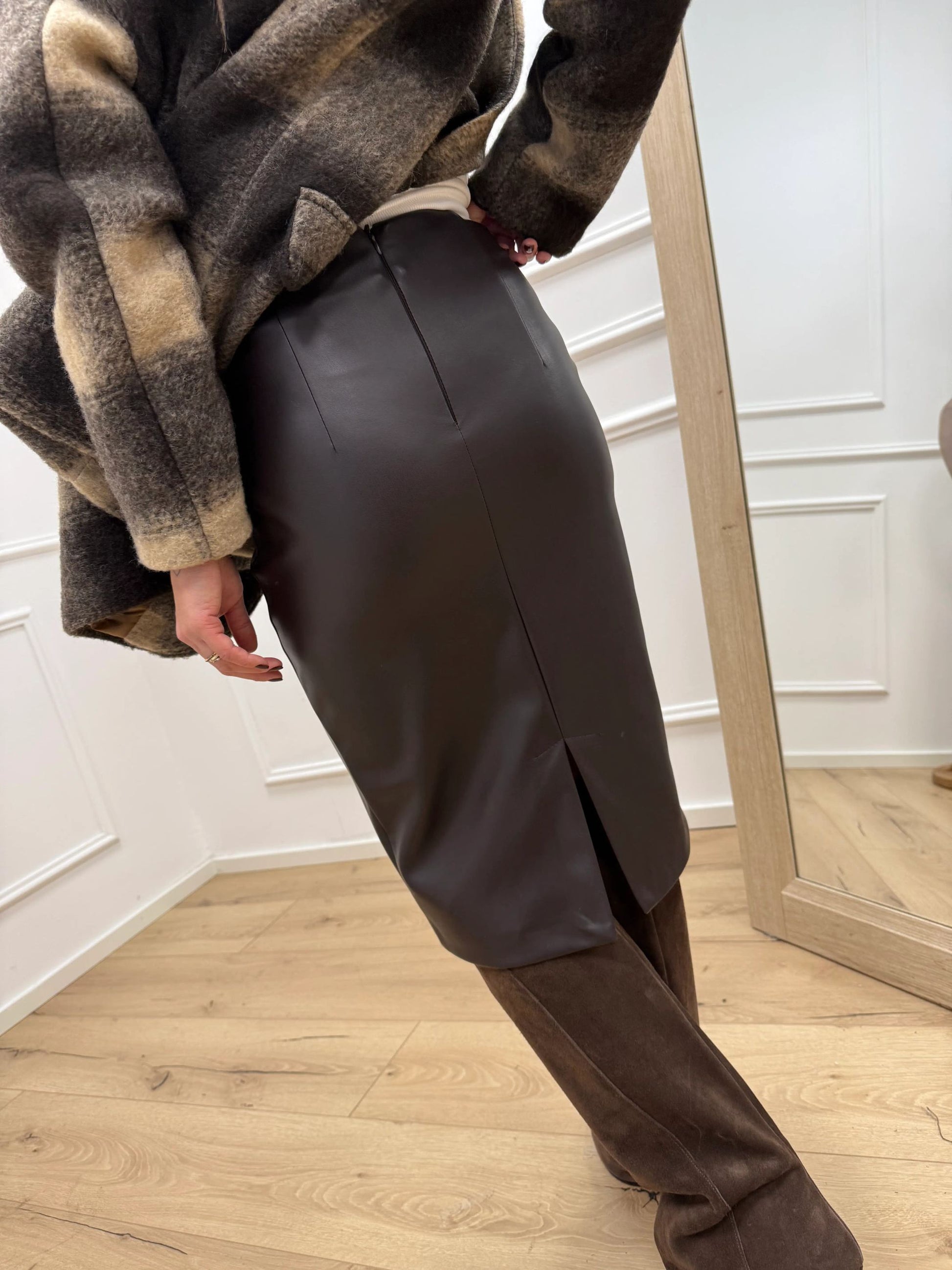 Gonna Cindy in ecopelle color moro Kontatto. Modello a tubo fit aderente con vita alta, chiusura sul retro con zip e spacco sul fondo.