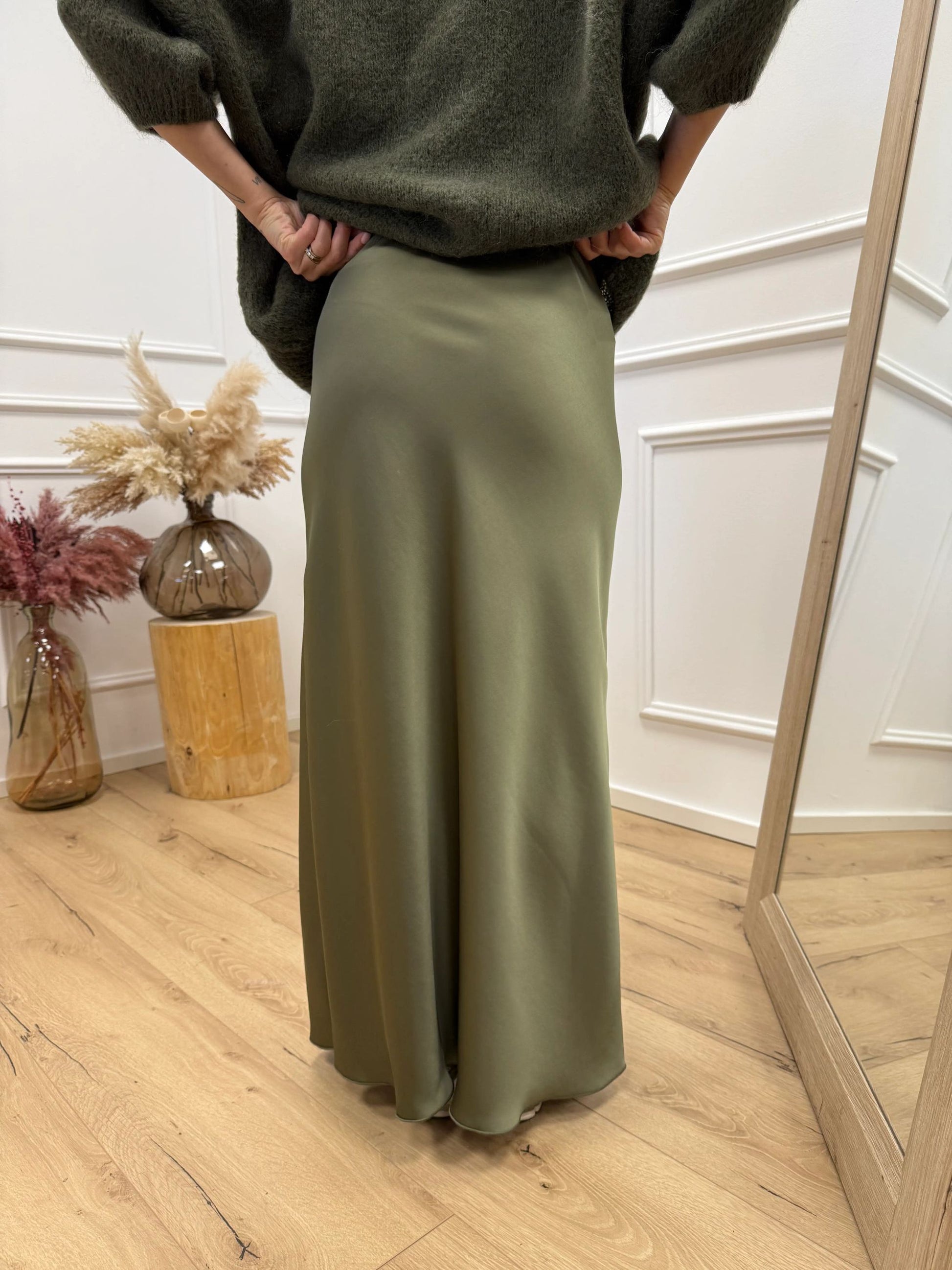 Gonna Gaia color verde militare in satin Dixie. Modello lungo fit morbido a vita alta elasticizzata con fondo svasato.