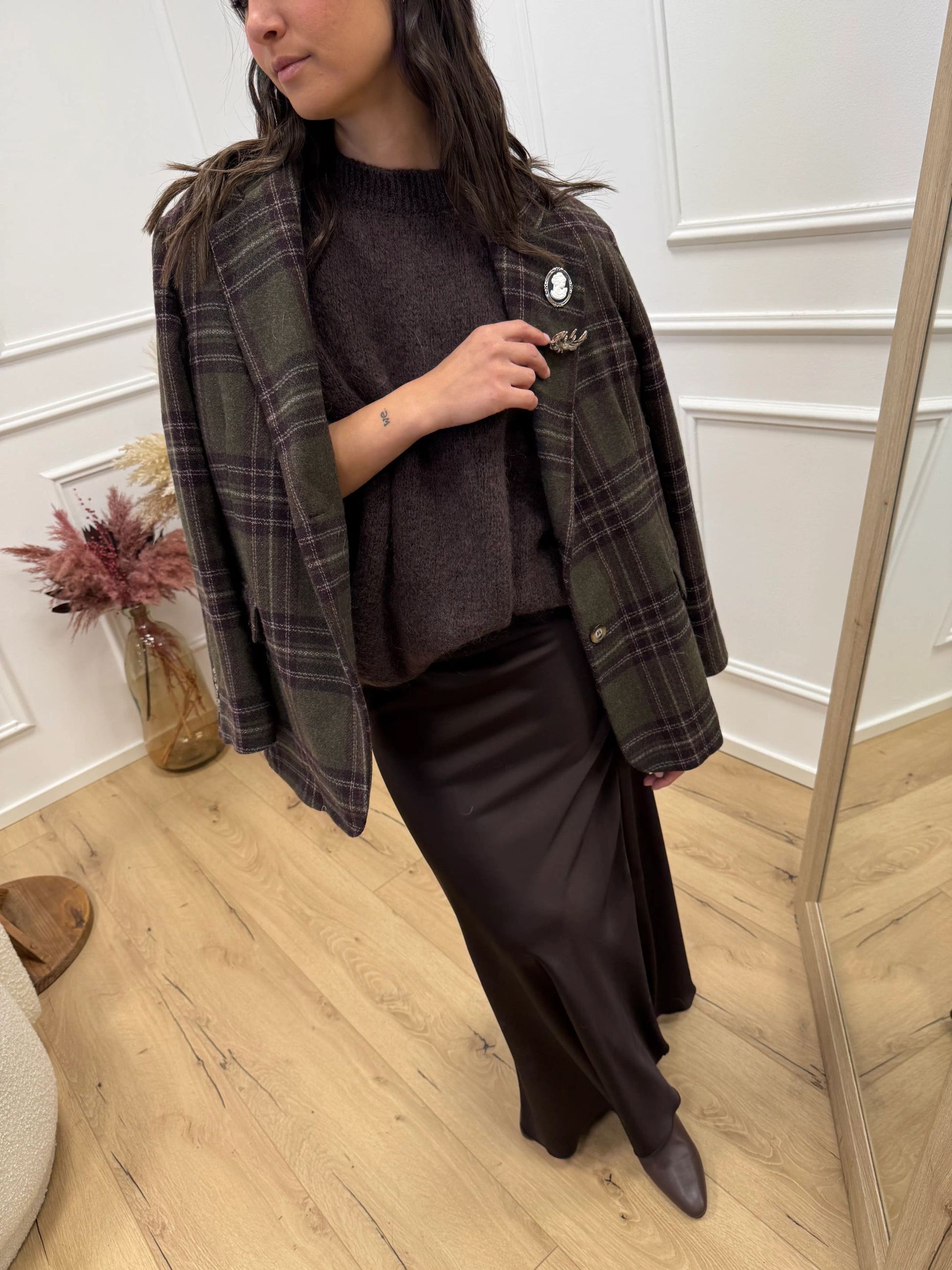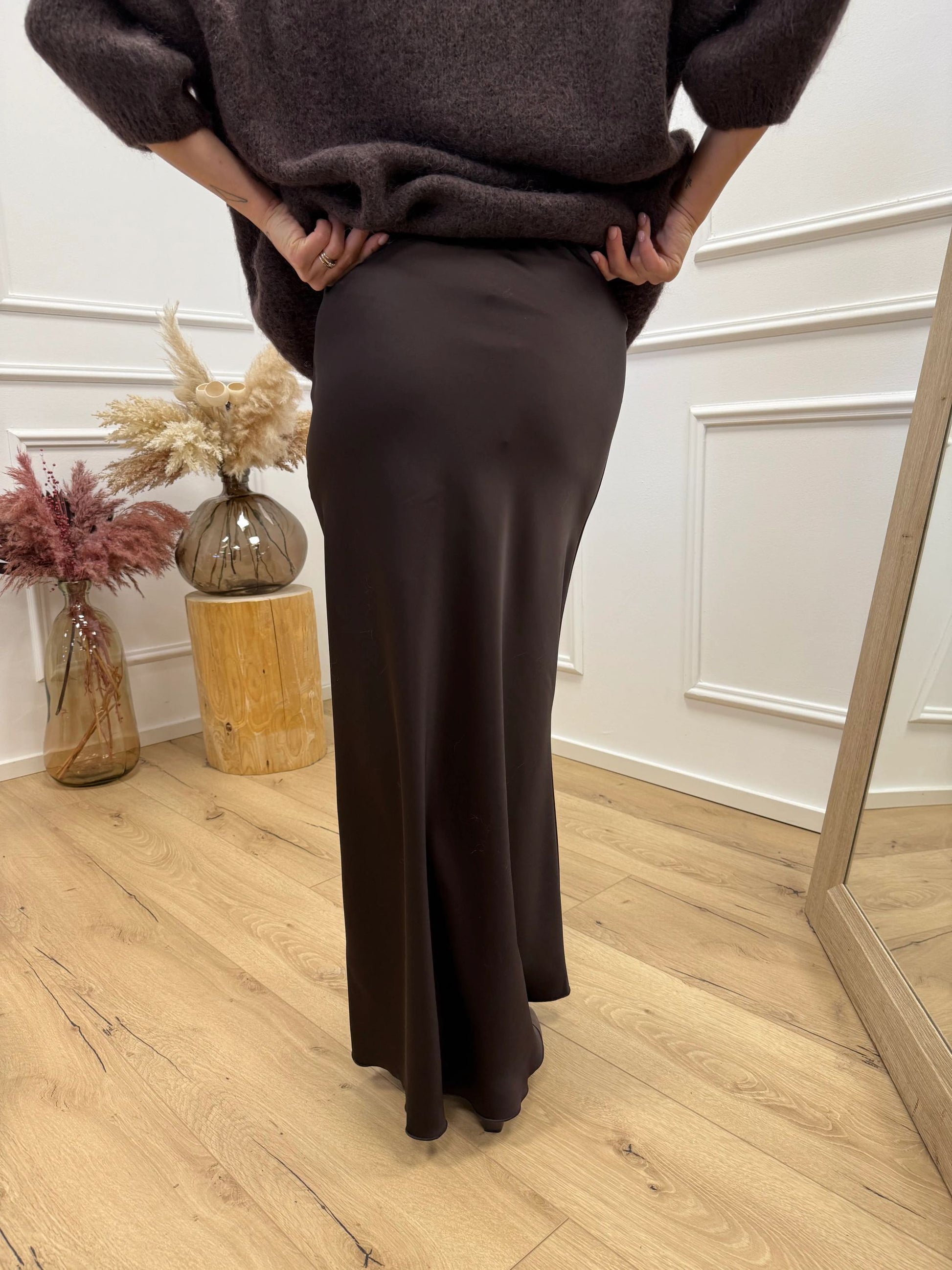Gonna Gaia color moro in satin Dixie. Modello lungo fit morbido a vita alta elasticizzata con fondo svasato.