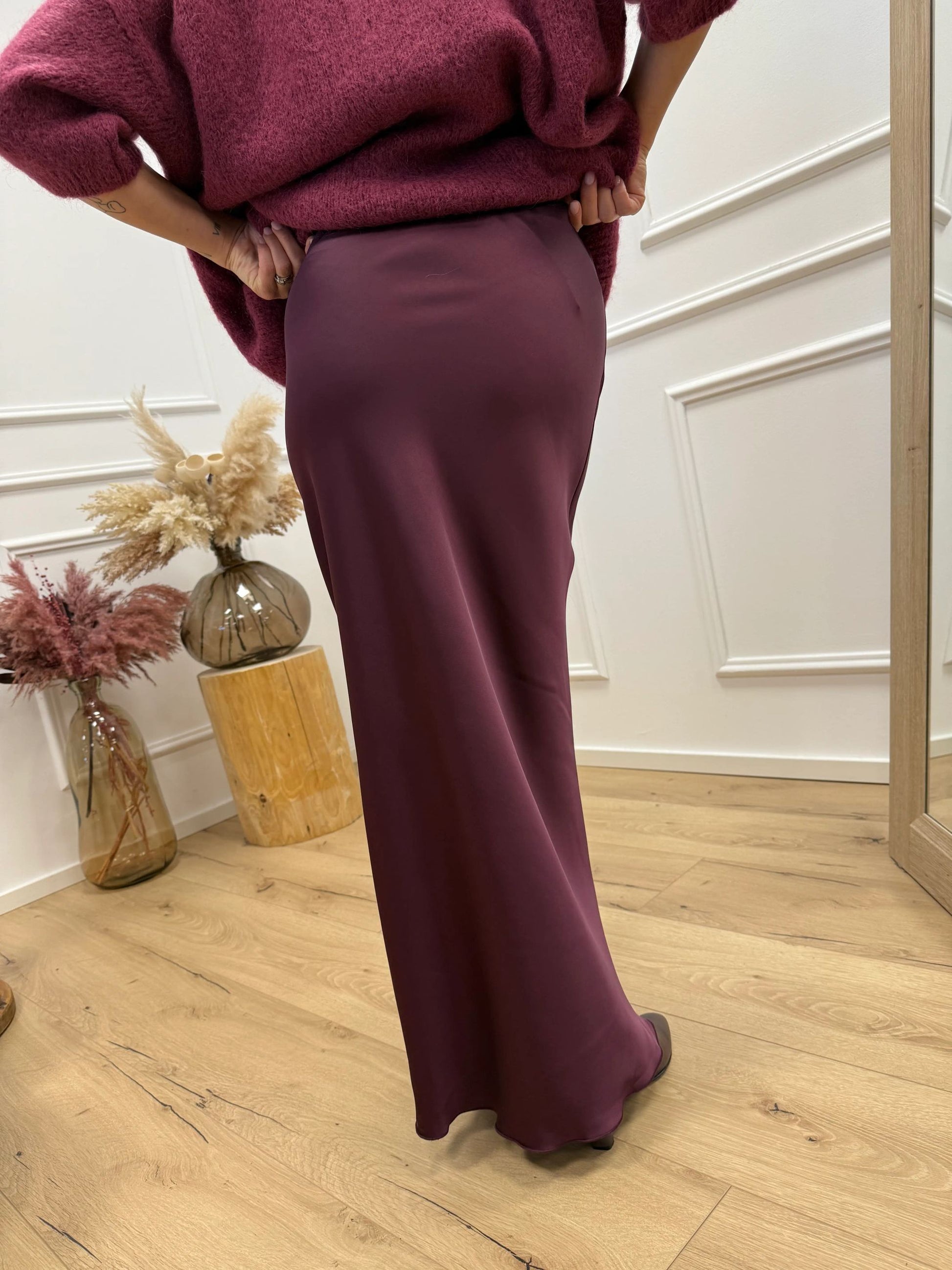 Gonna Gaia color sangria in satin Dixie. Modello lungo fit morbido a vita alta elasticizzata con fondo svasato.