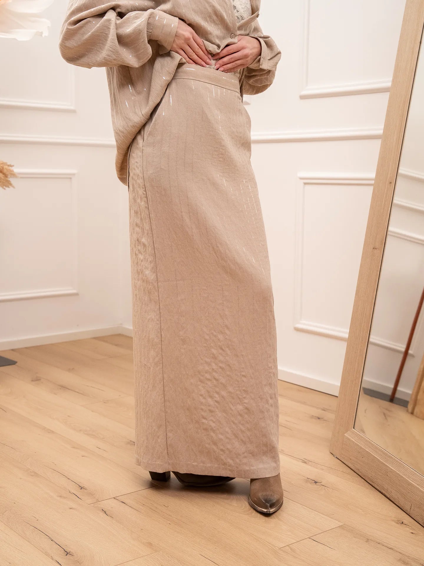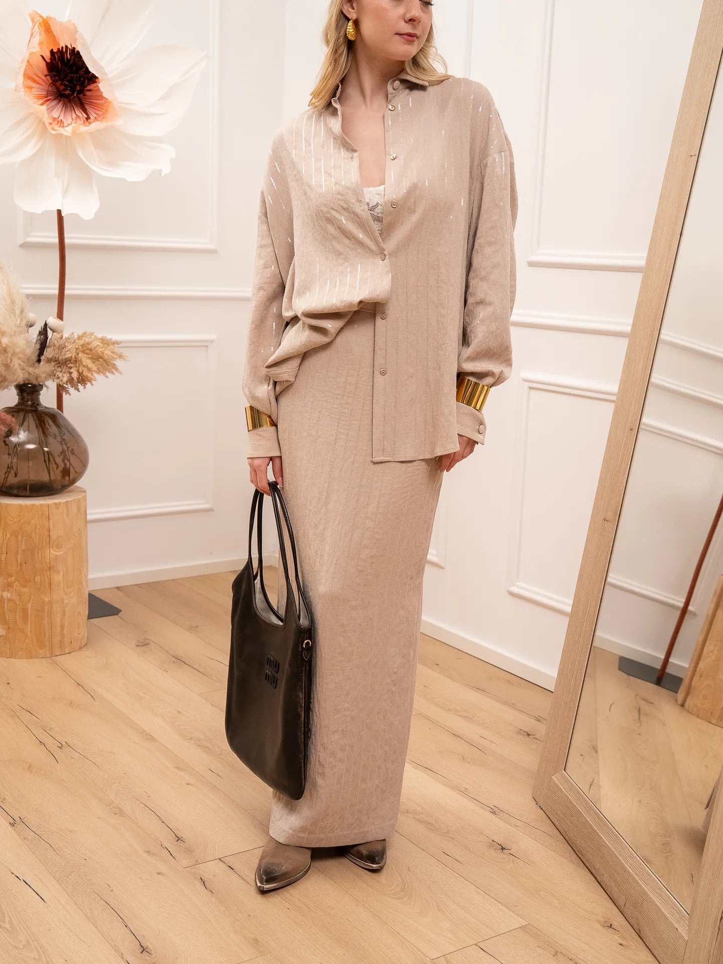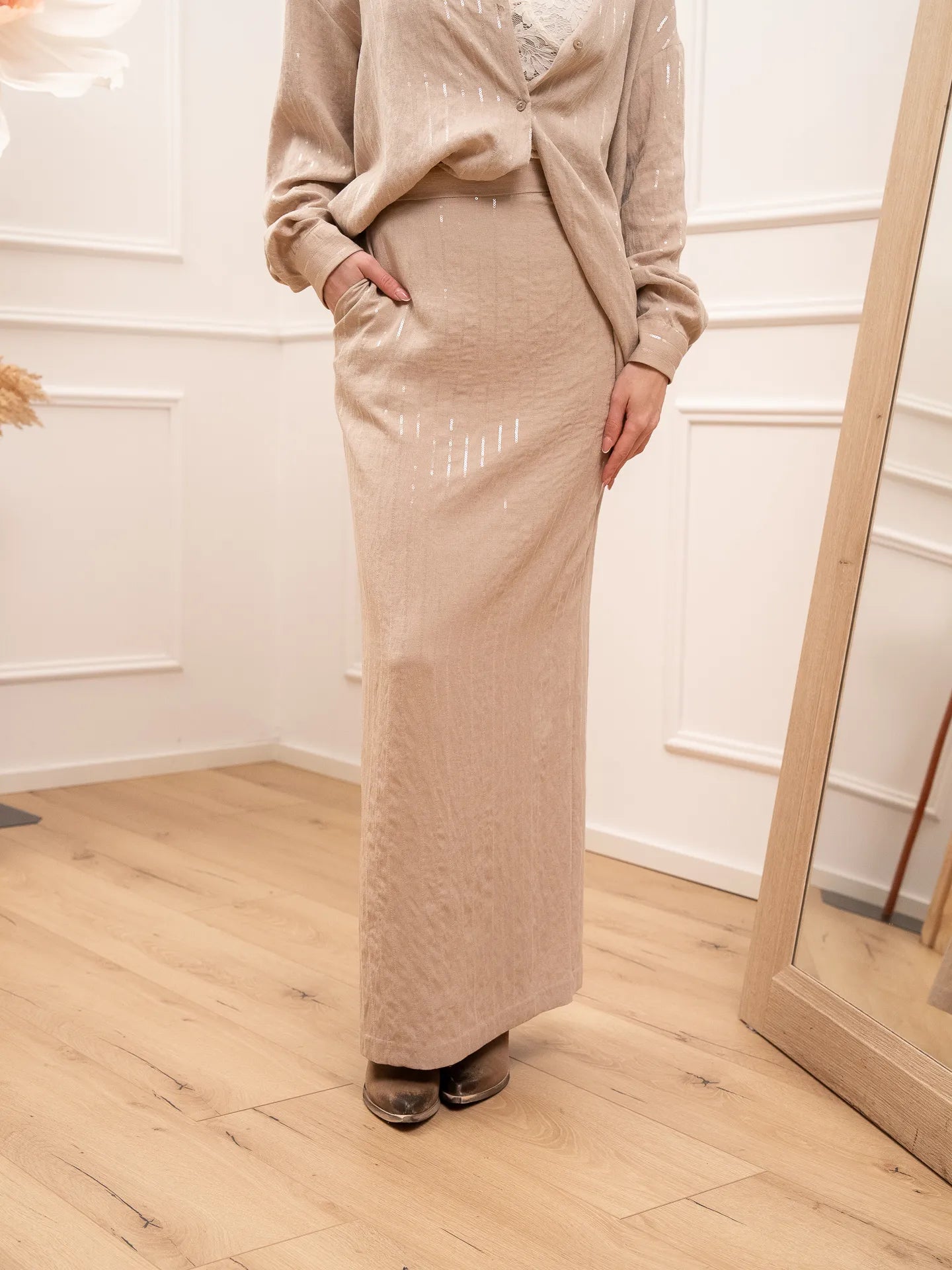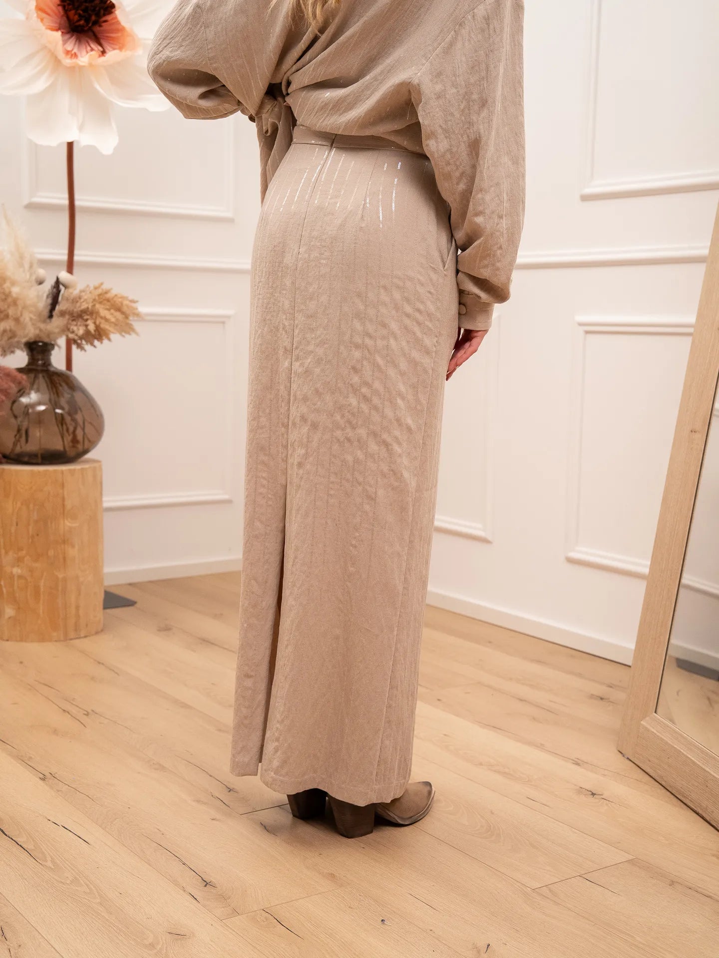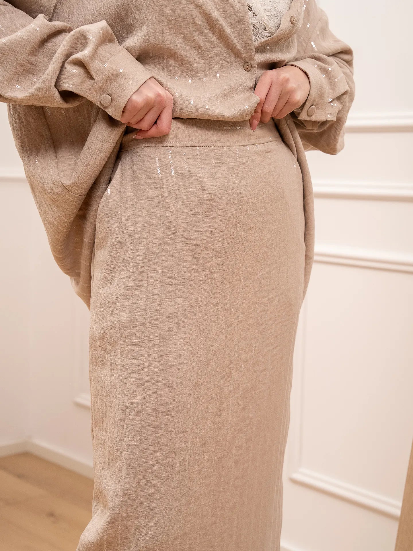 Gonna Glam color sabbia gessata con paillettes trasparenti Silence Limited. Modello fit a matita con vita alta, chiusura zip sul retro e dettaglio di spacco sul fondo.